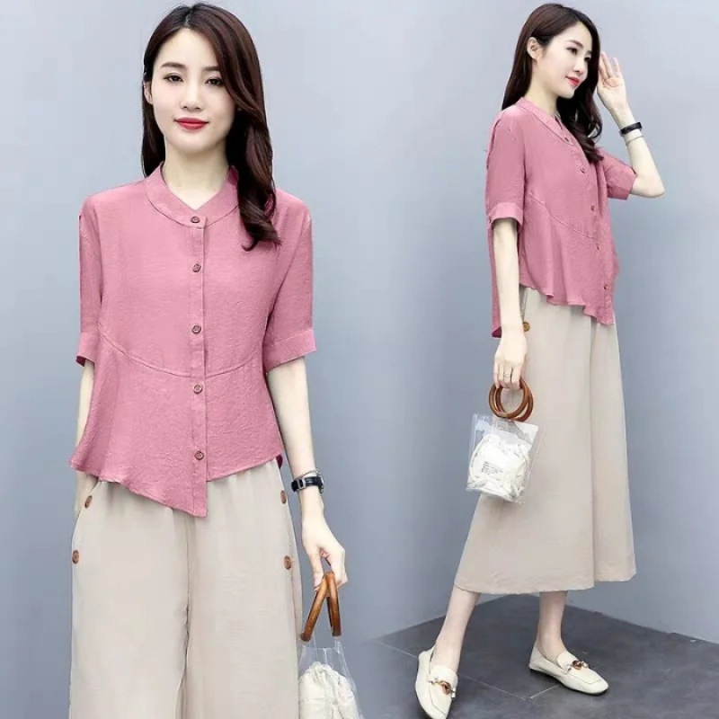 코튼 및 린넨 세트 여성 2024 새로운 서양식 캐주얼 패션 와이드 레그 바지 여성 여름 느슨한 단색 짧은 소매 투피스 세트 패션