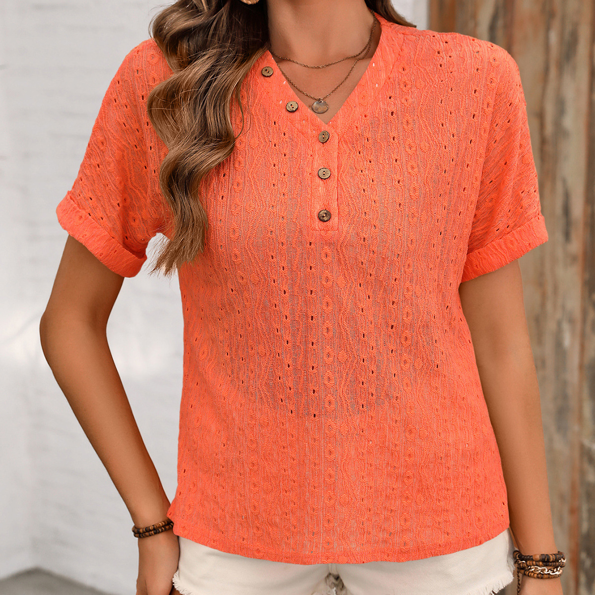 아마존 여름 새로운 유럽과 미국 여성의 거친 후크 장식 버클 V-넥 반소매 티셔츠 탑