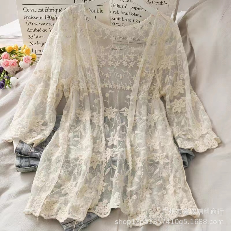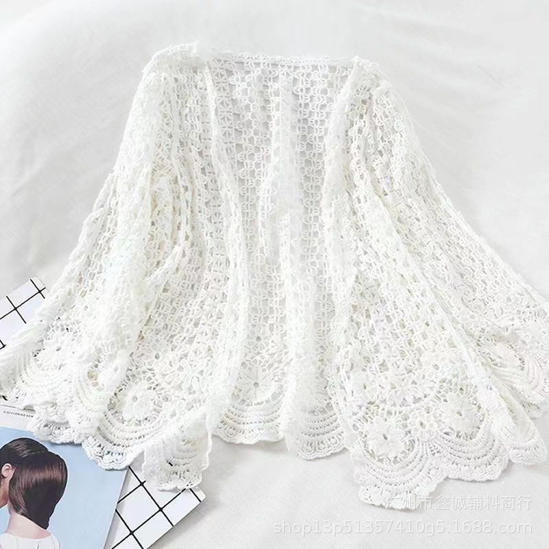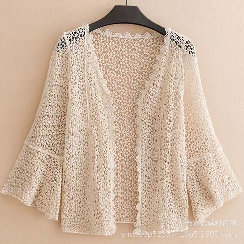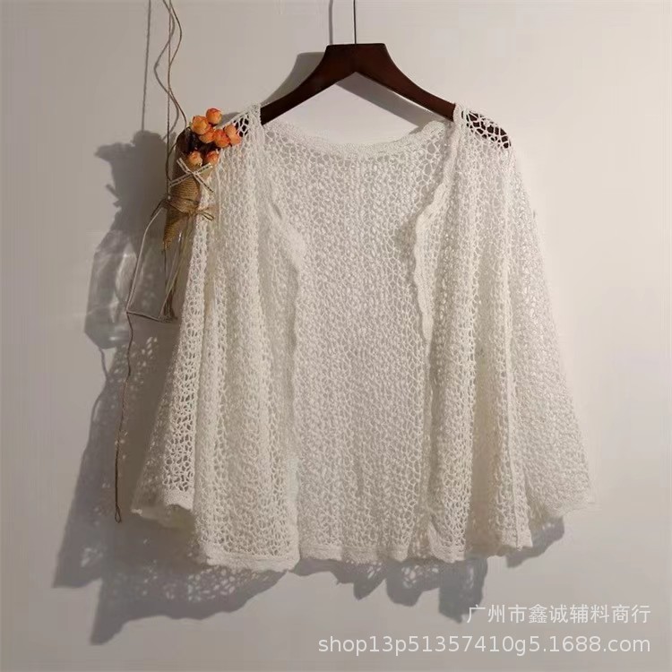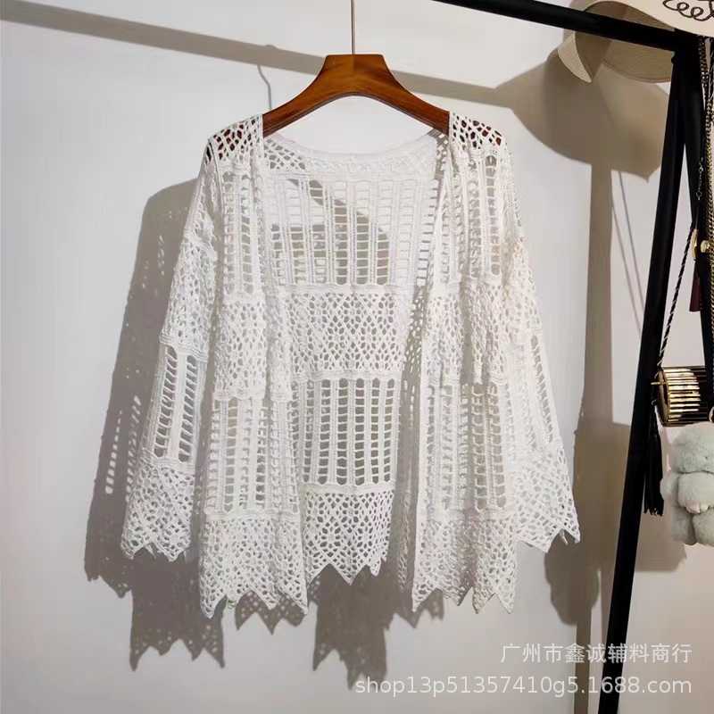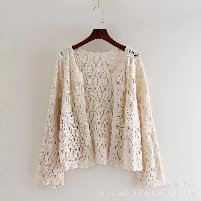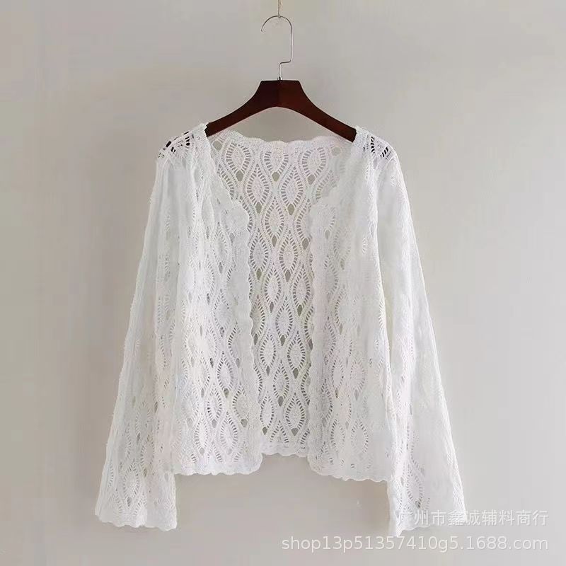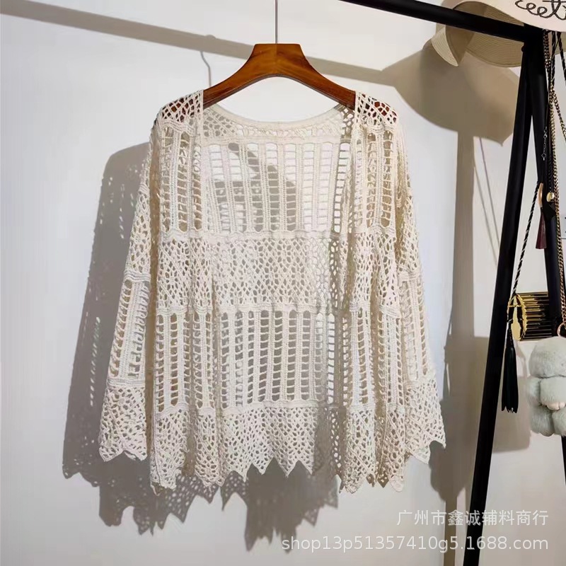 해변 휴가 스타일 빈 아웃 외부 니트 블라우스 여성의 봄 보헤미안 긴 소매 태양 보호 스택 틈새 탑