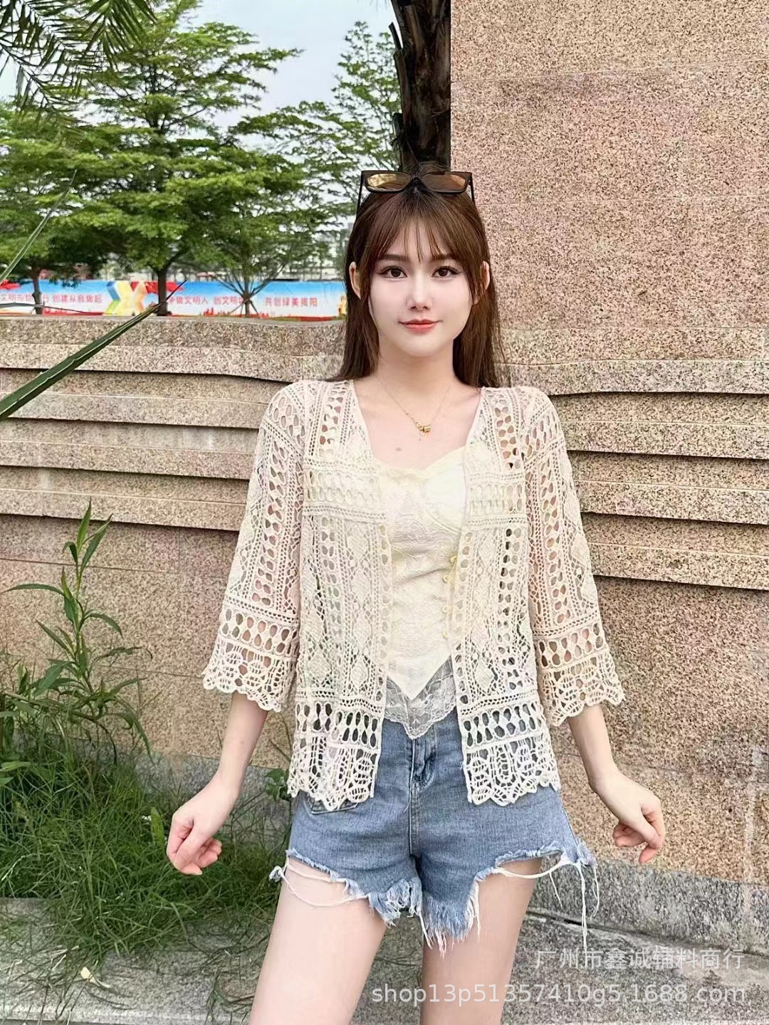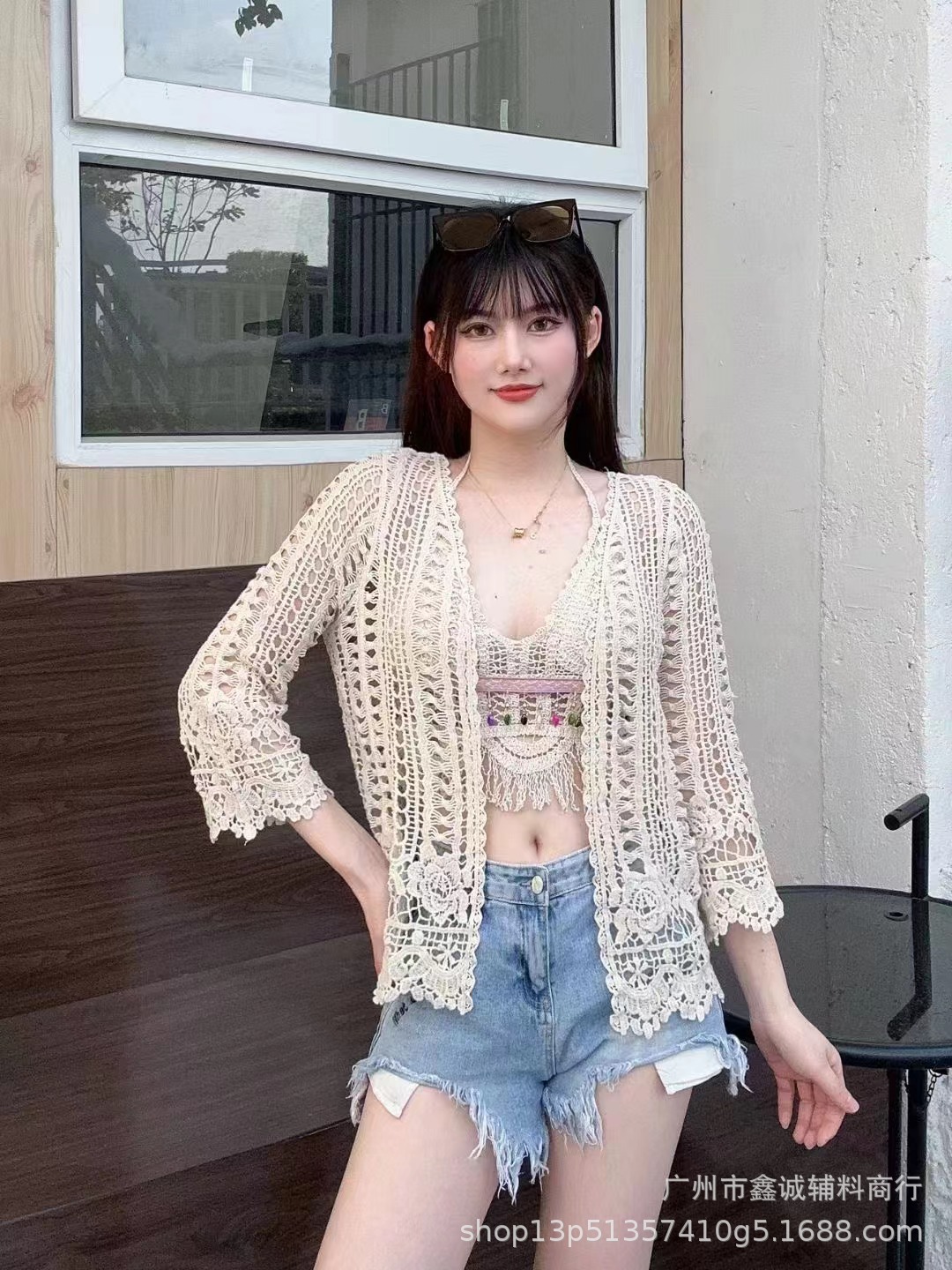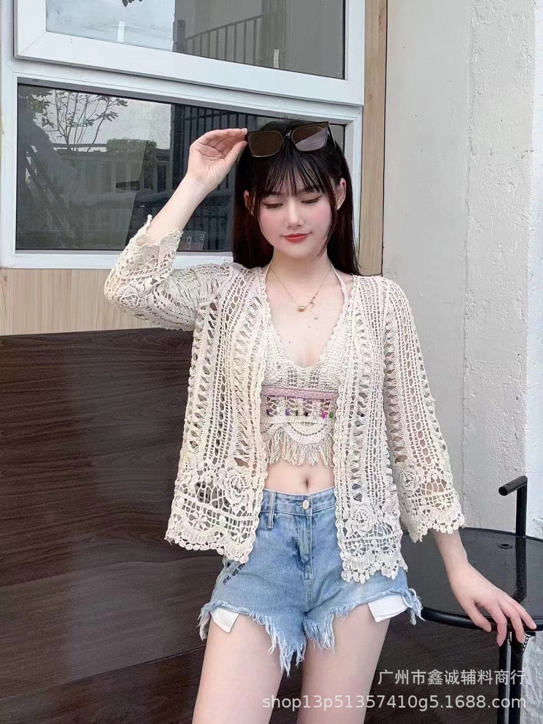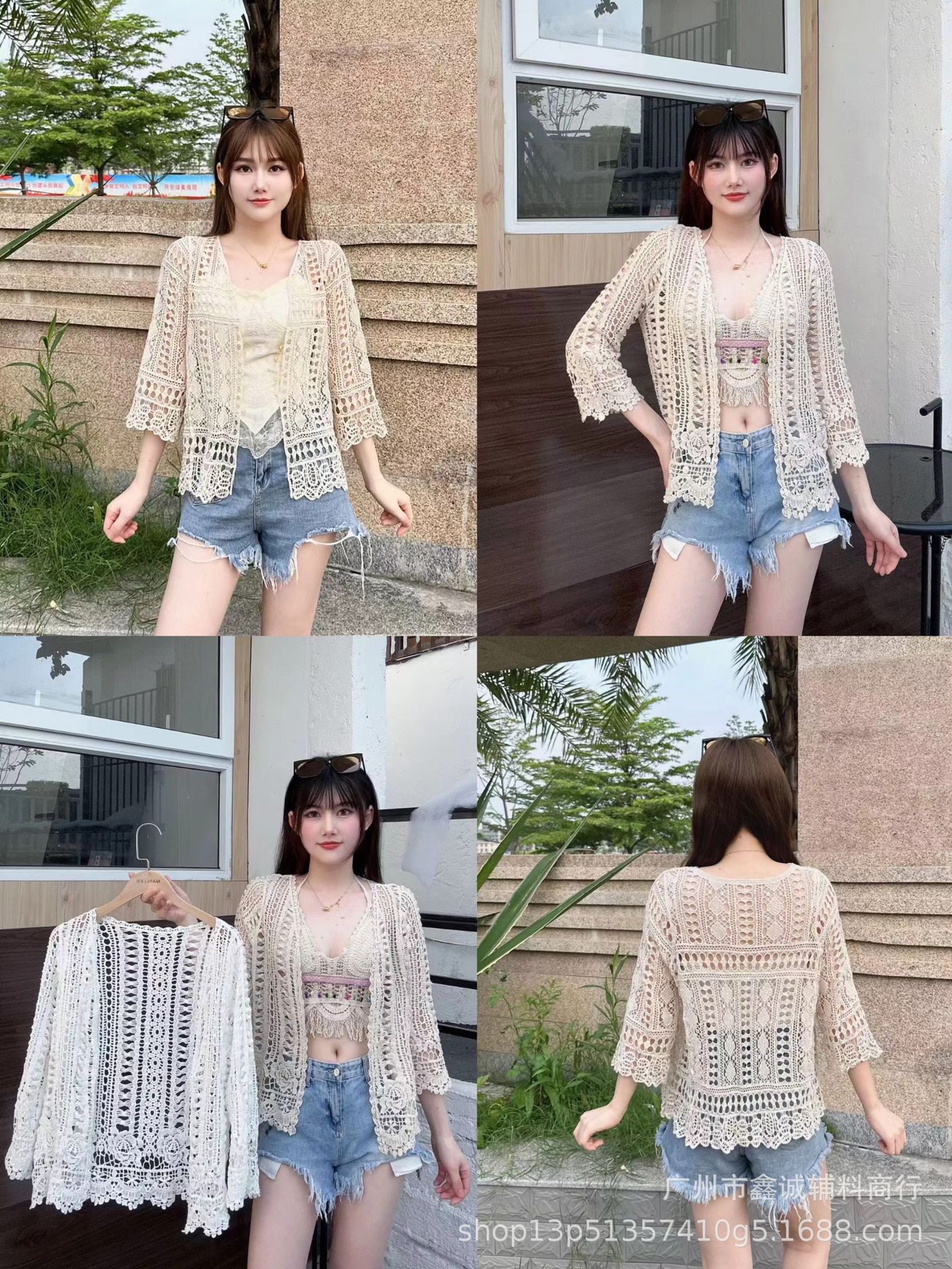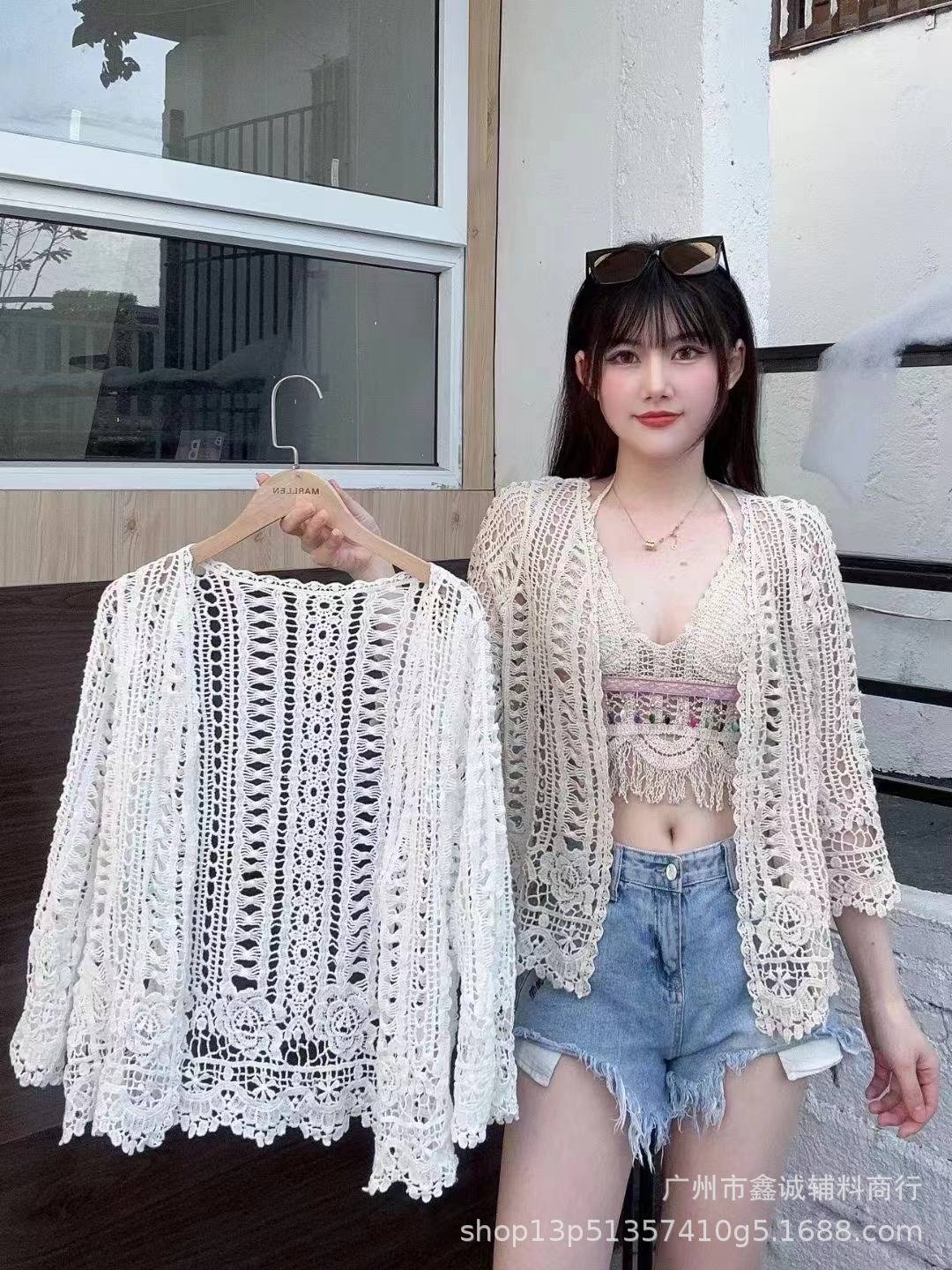 해변 휴가 스타일 빈 아웃 외부 니트 블라우스 여성의 봄 보헤미안 긴 소매 태양 보호 스택 틈새 탑스토어 가기