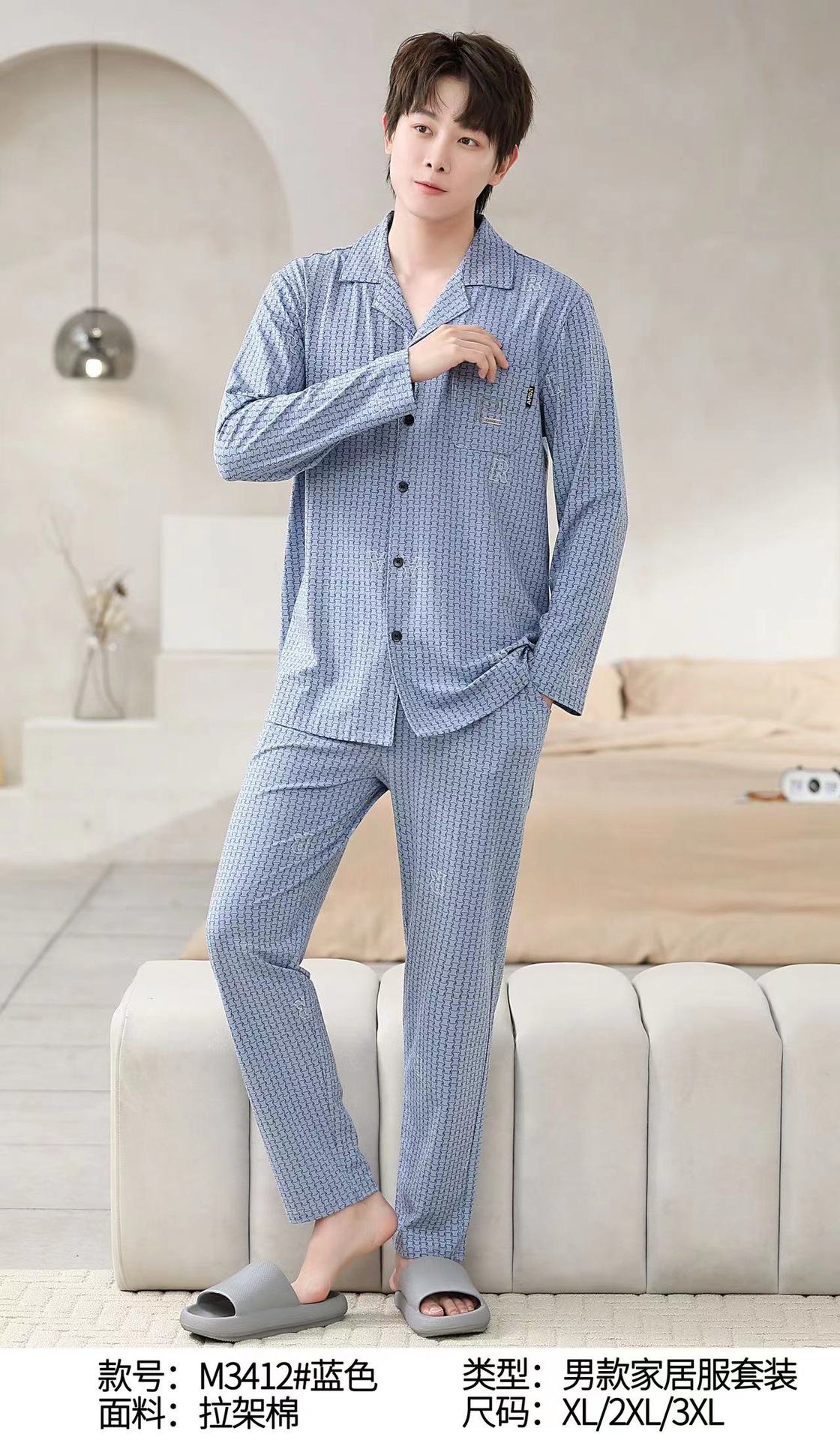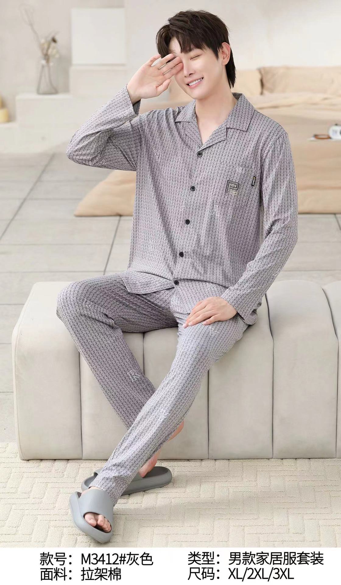 남성면 잠옷 옷깃 긴팔 바지 캐주얼 편안한 잠옷 남성용 봄과 가을 홈웨어 세트스토어 가기