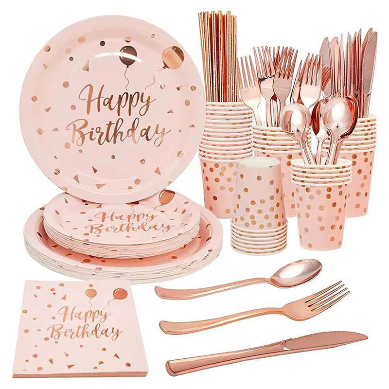 재고 로즈 골드 웨이브 도트 스타일 일회용 생일 종이 트레이 풍선 스타 점 패턴 파티 레이아웃 생일 용품스토어 가기