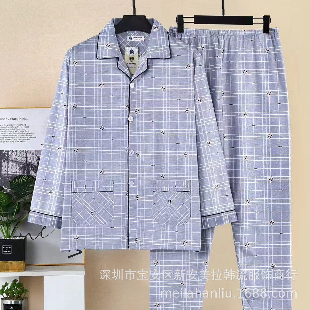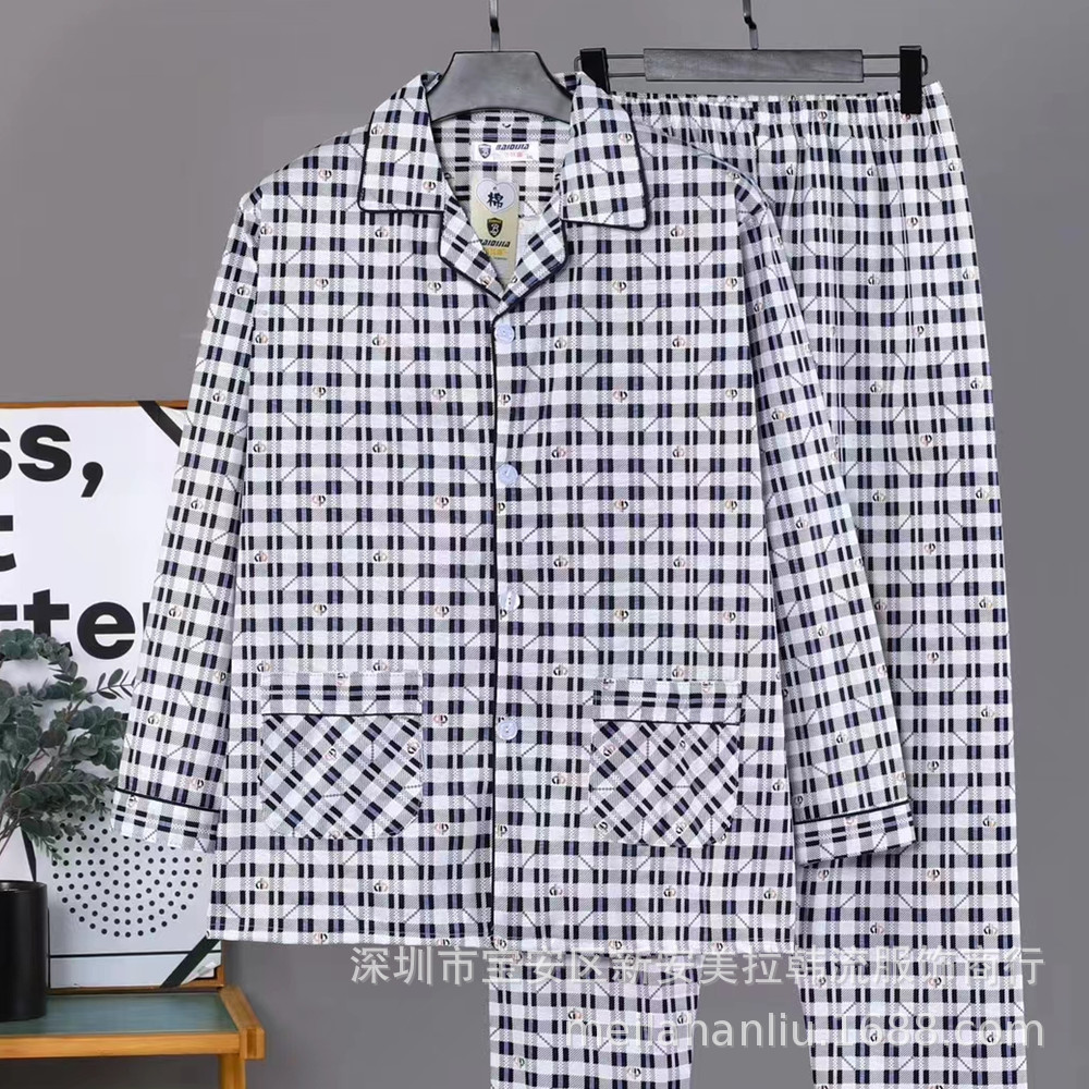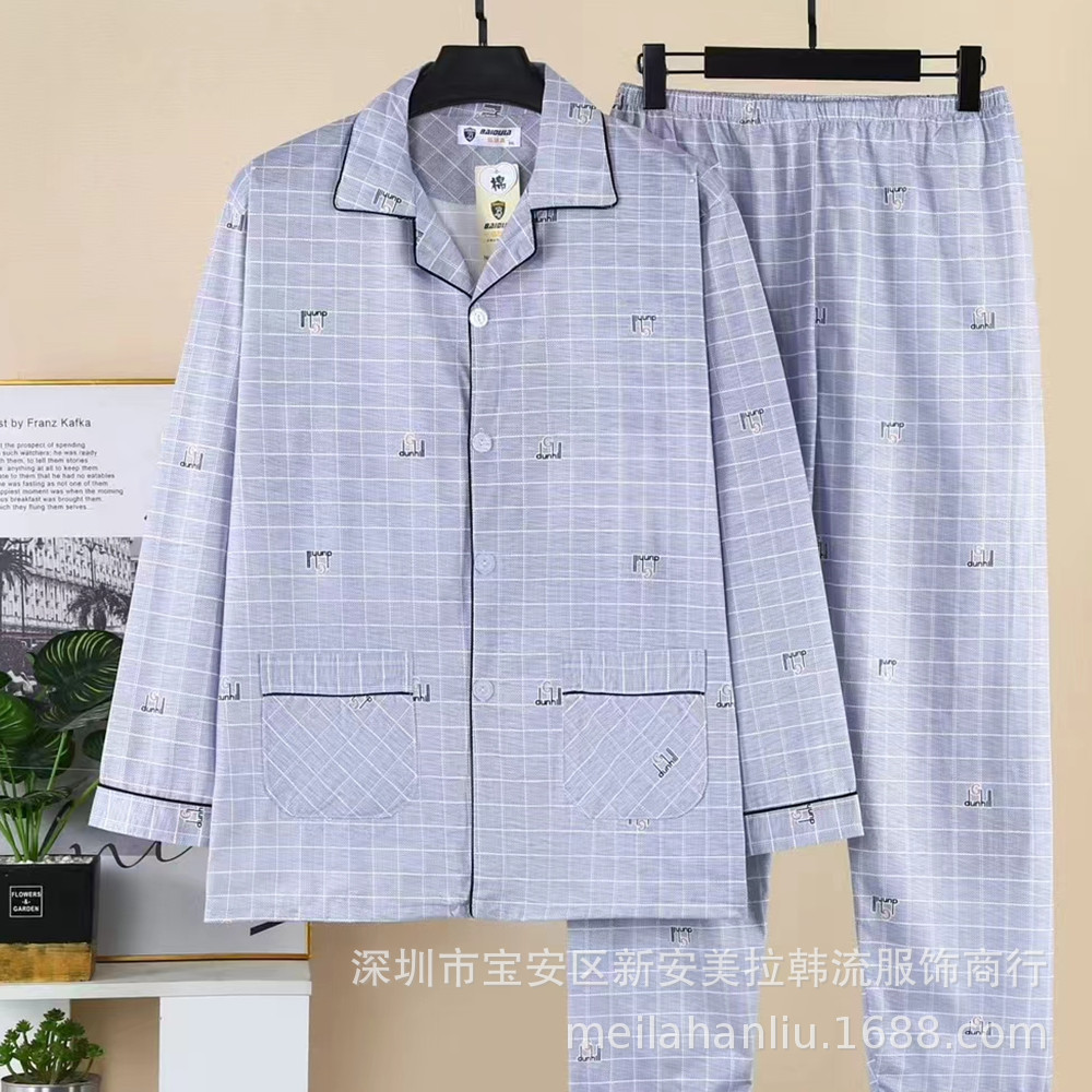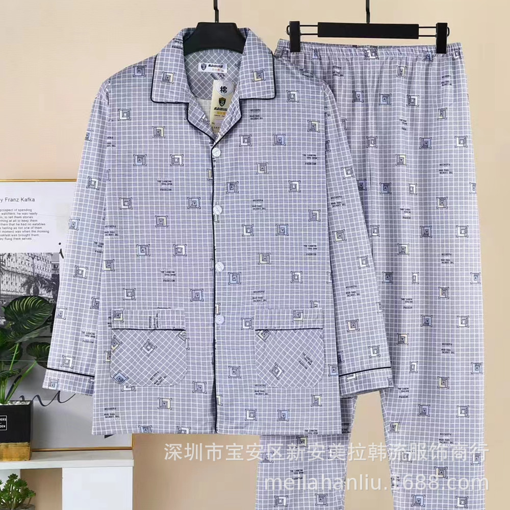 Baidijia 봄과 가을 남성 긴팔 바지 니트 코튼 파자마 카디건 옷깃 여름 남성 플러스 사이즈 캐주얼 홈 5X