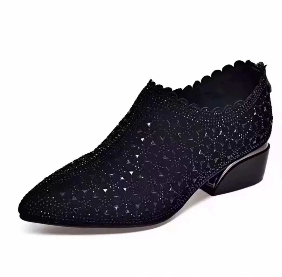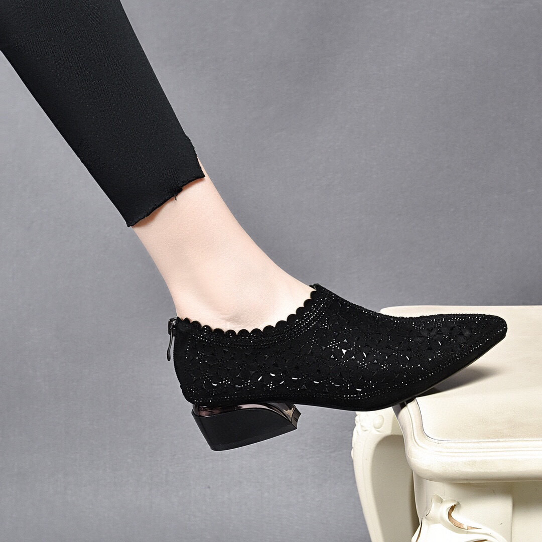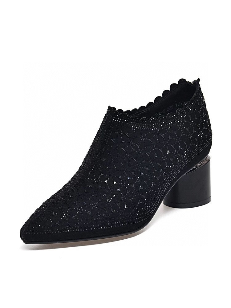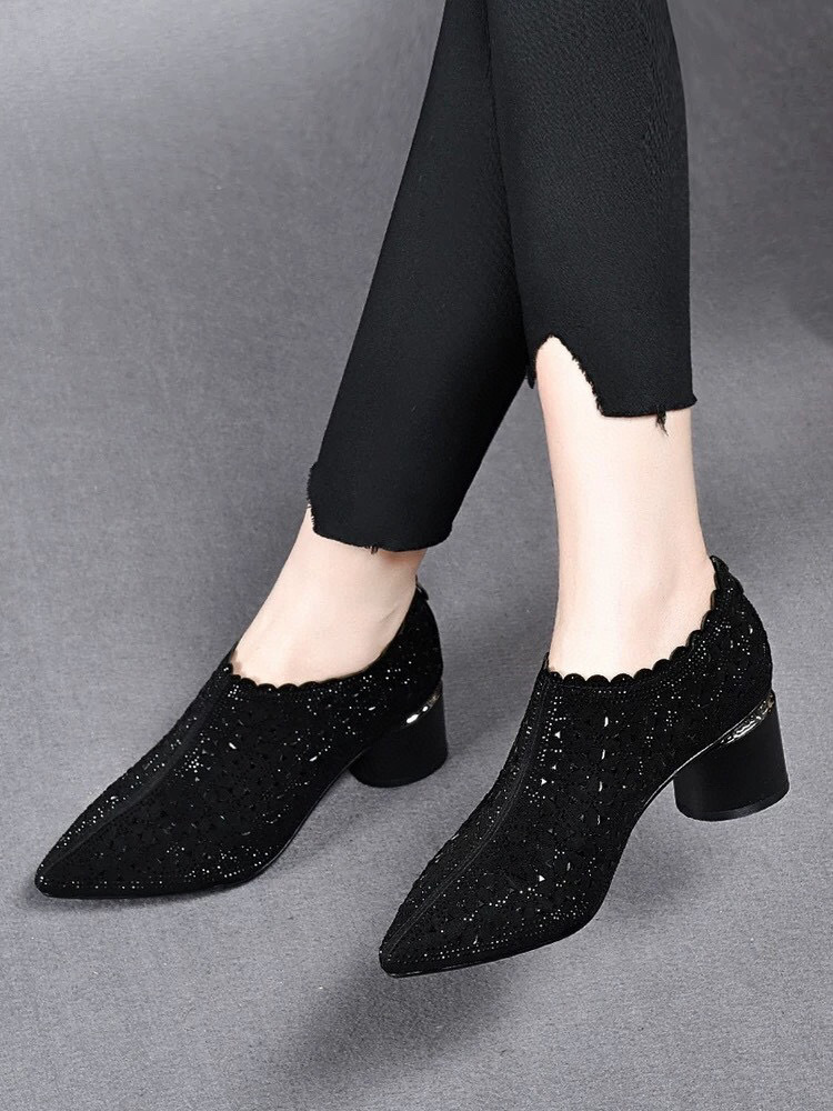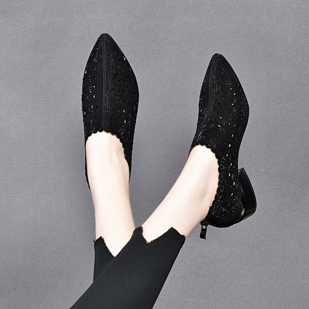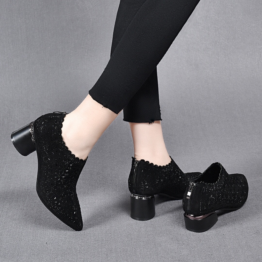 깊은 입 싱글 레이어 신발 여성 뾰족한 가죽 신발 2024 가을과 겨울 새로운 두꺼운 발 뒤꿈치 라인 스톤 서스테드 부드러운 가죽 신발 가을 작은 가죽 신발