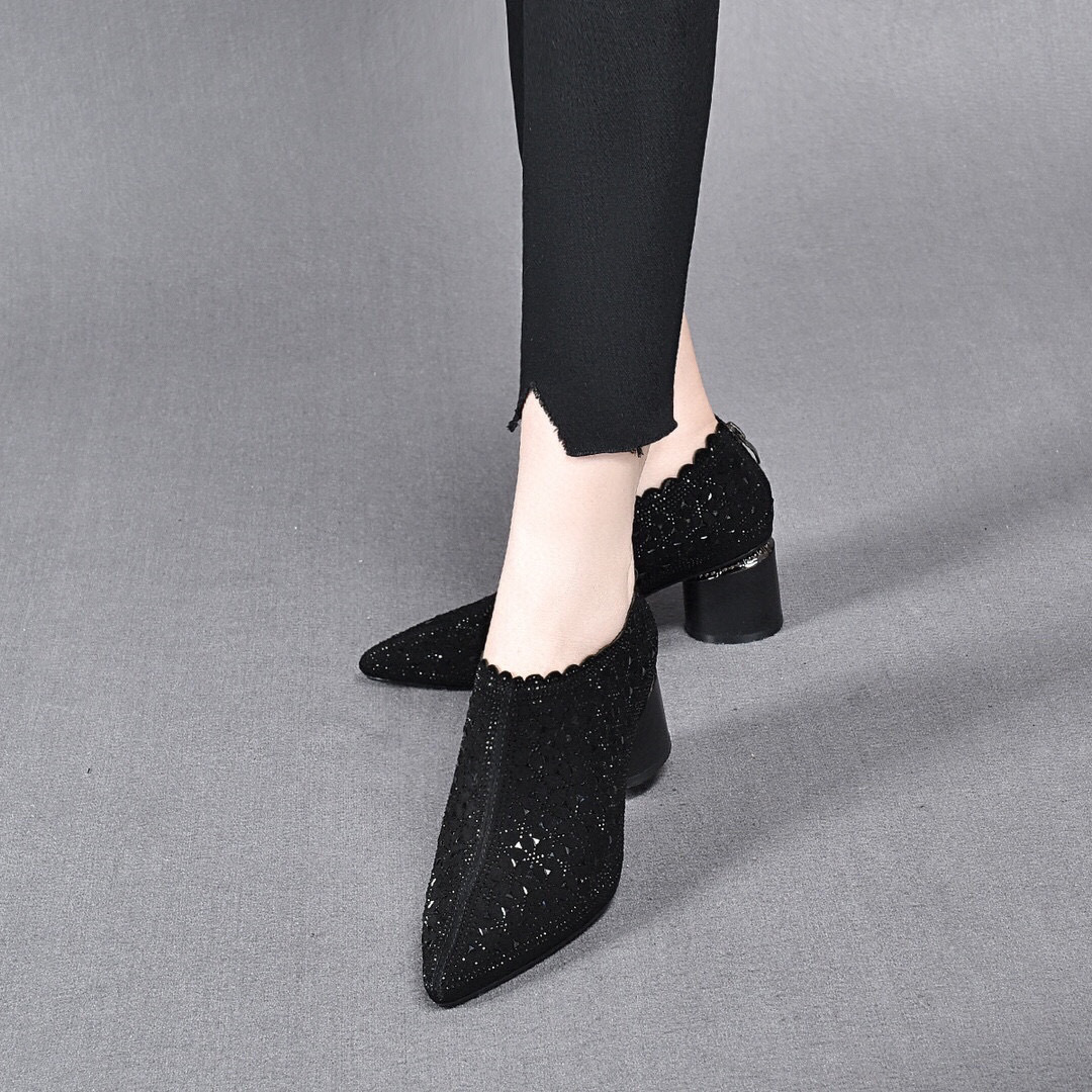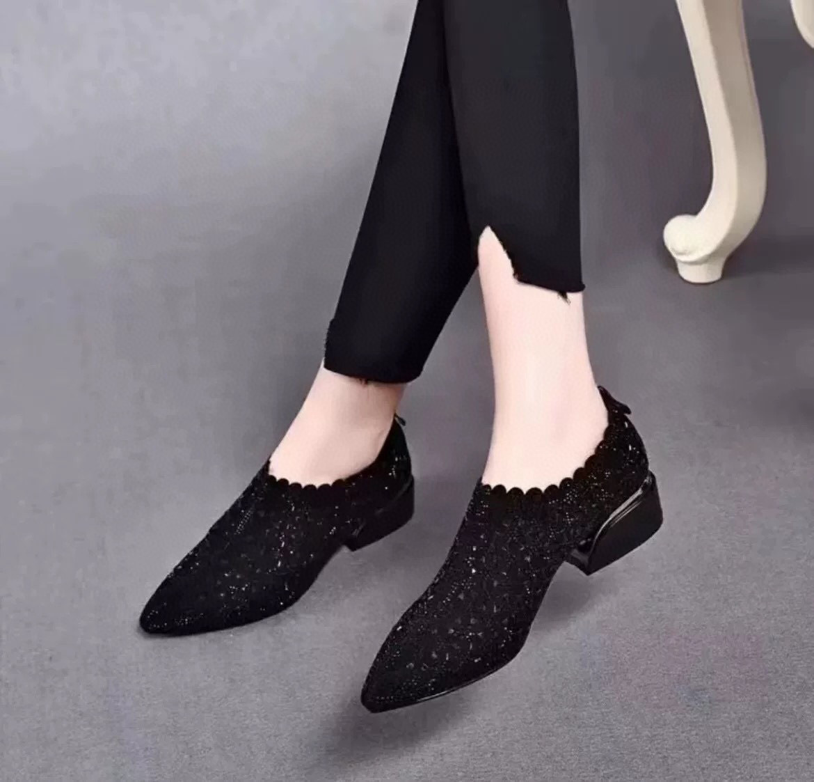 깊은 입 싱글 레이어 신발 여성 뾰족한 가죽 신발 2024 가을과 겨울 새로운 두꺼운 발 뒤꿈치 라인 스톤 서스테드 부드러운 가죽 신발 가을 작은 가죽 신발스토어 가기