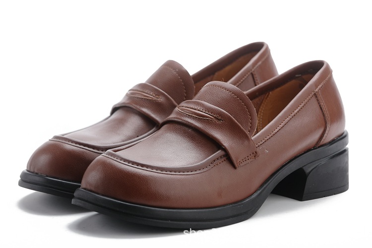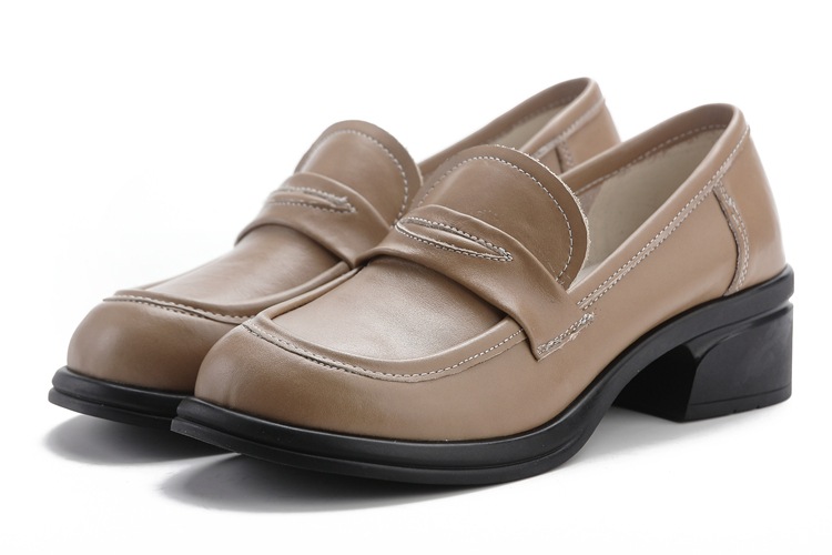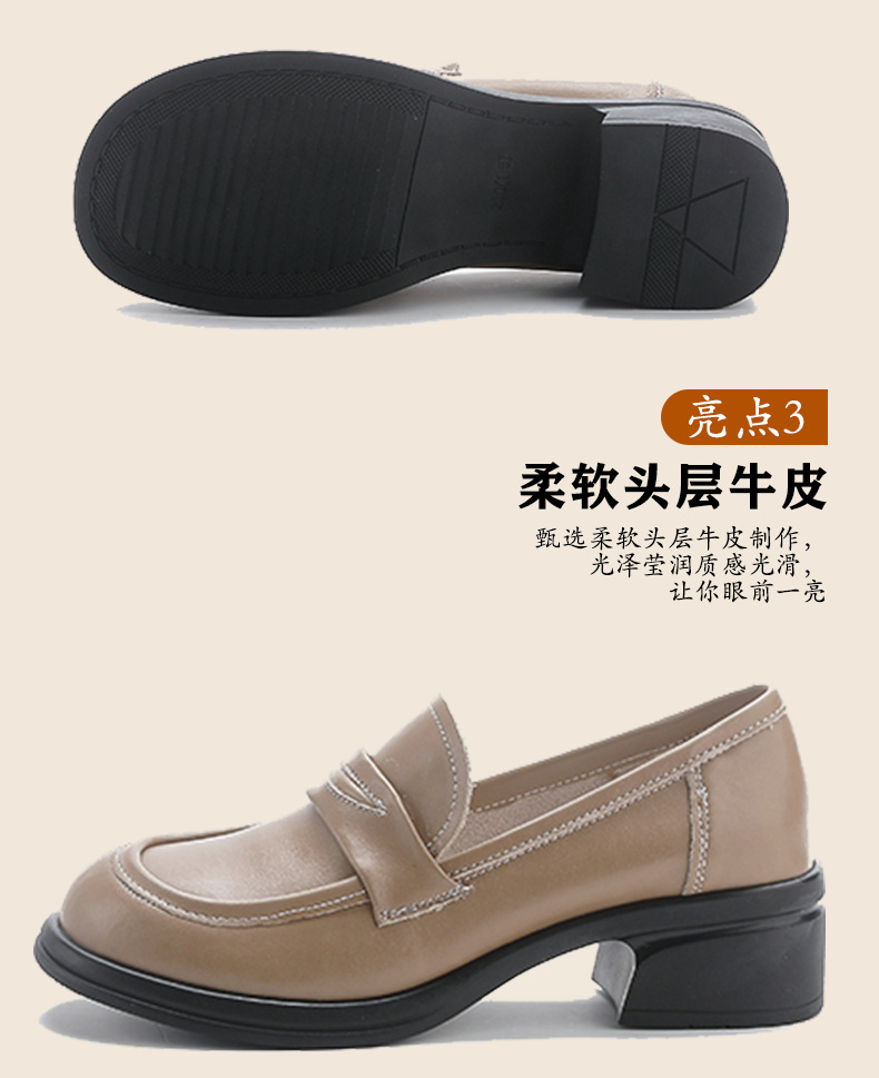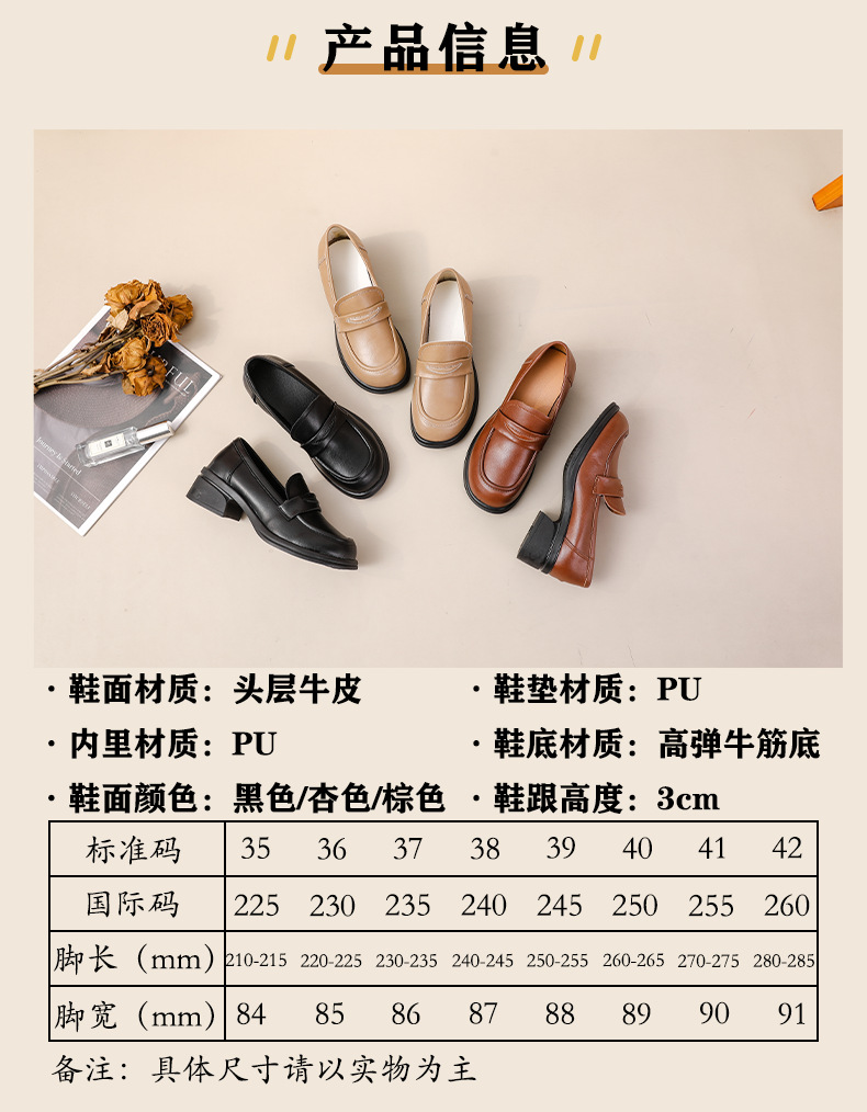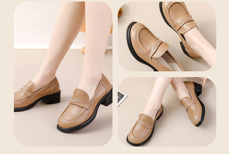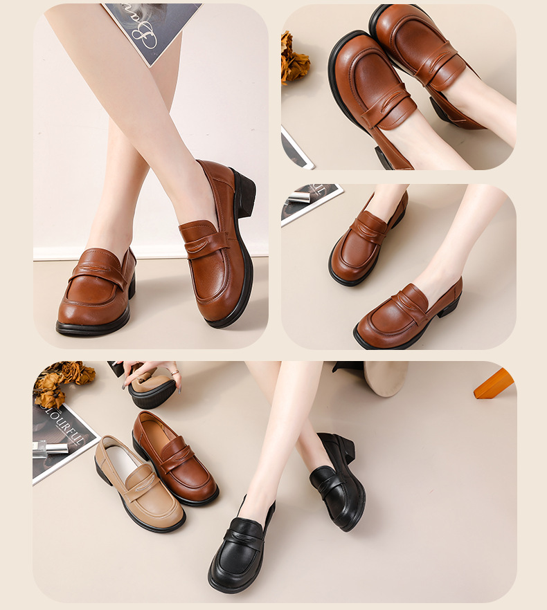 Cowhide 로퍼 여성 신발 정품 가죽 로우 탑 청키 힐 미드 힐 부드러운 바닥 부드러운 표면 라운드 토 편안한 올 매치 캐주얼 사무실