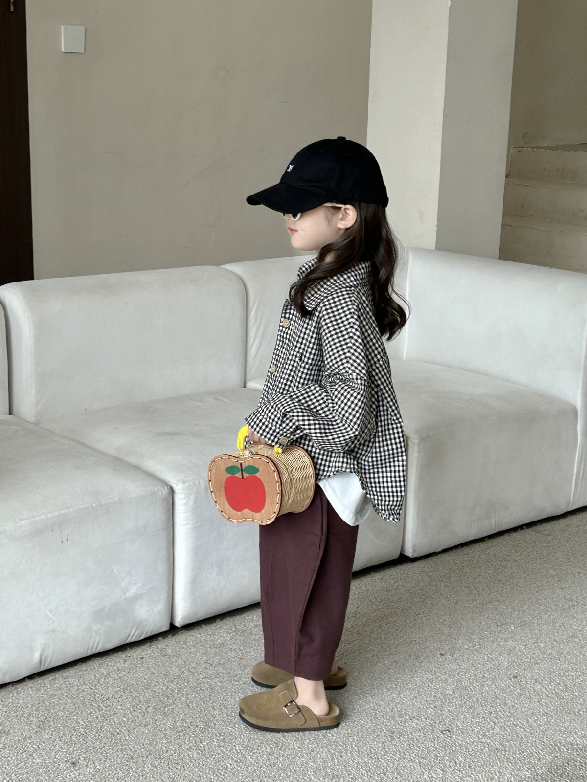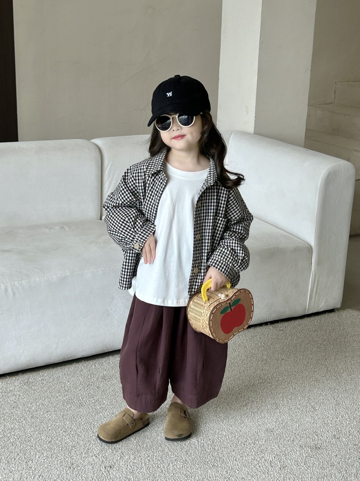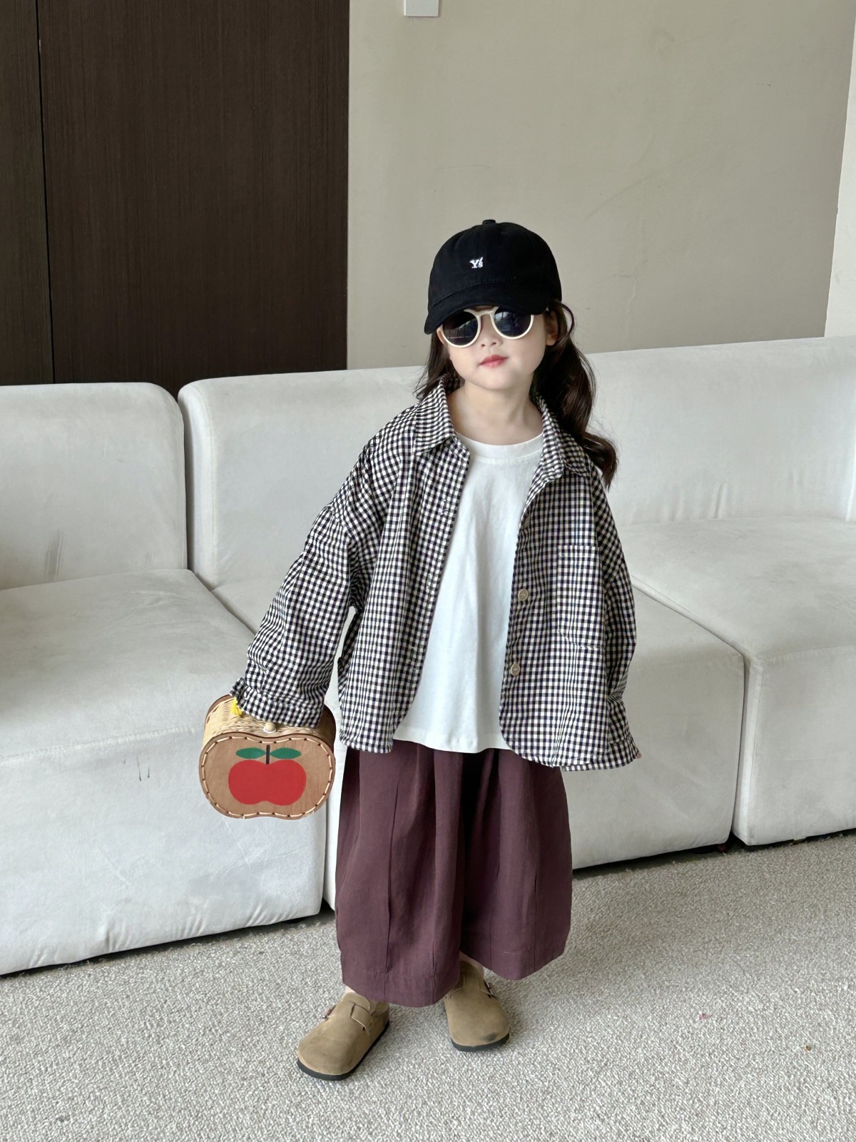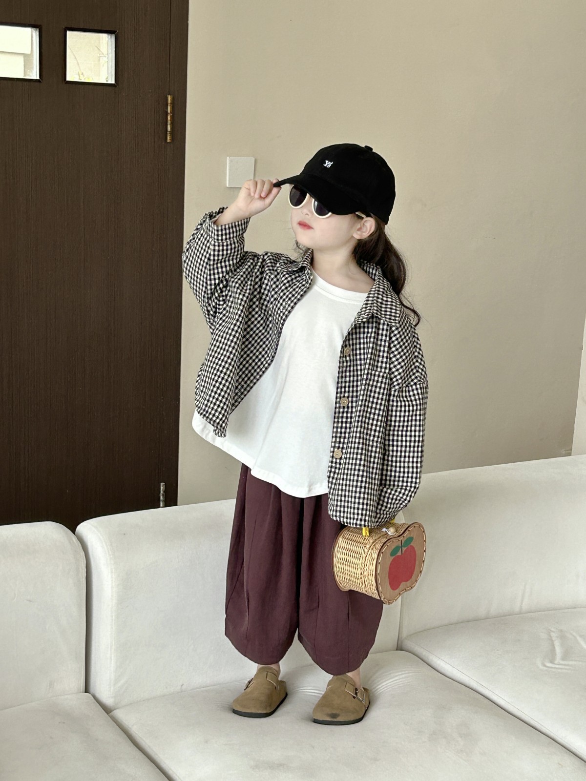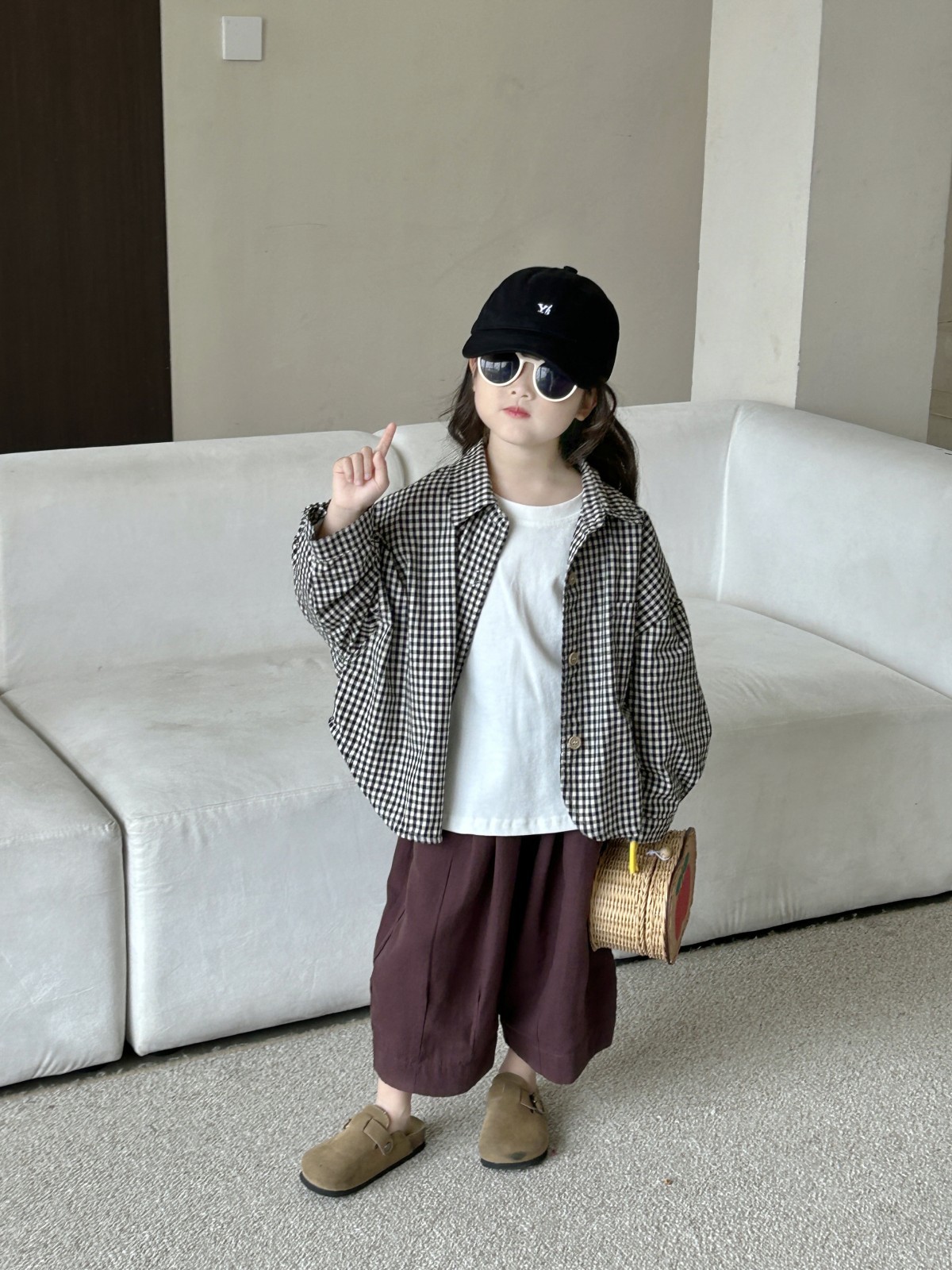 봄 새로운 어린이 복고풍면과 린넨 격자 무늬 셔츠 한국 스타일 옷깃 남성과 여성의 세련된 작은 셔츠스토어 가기