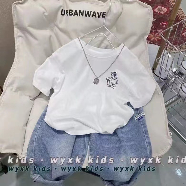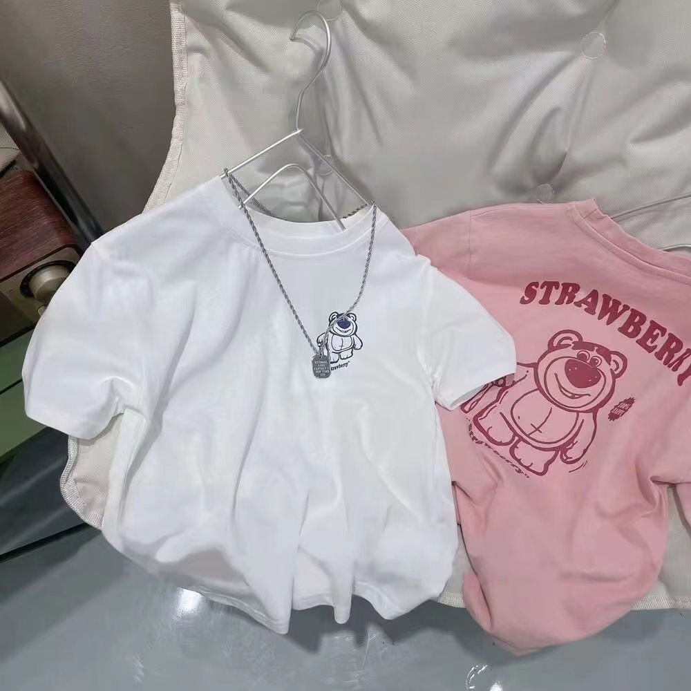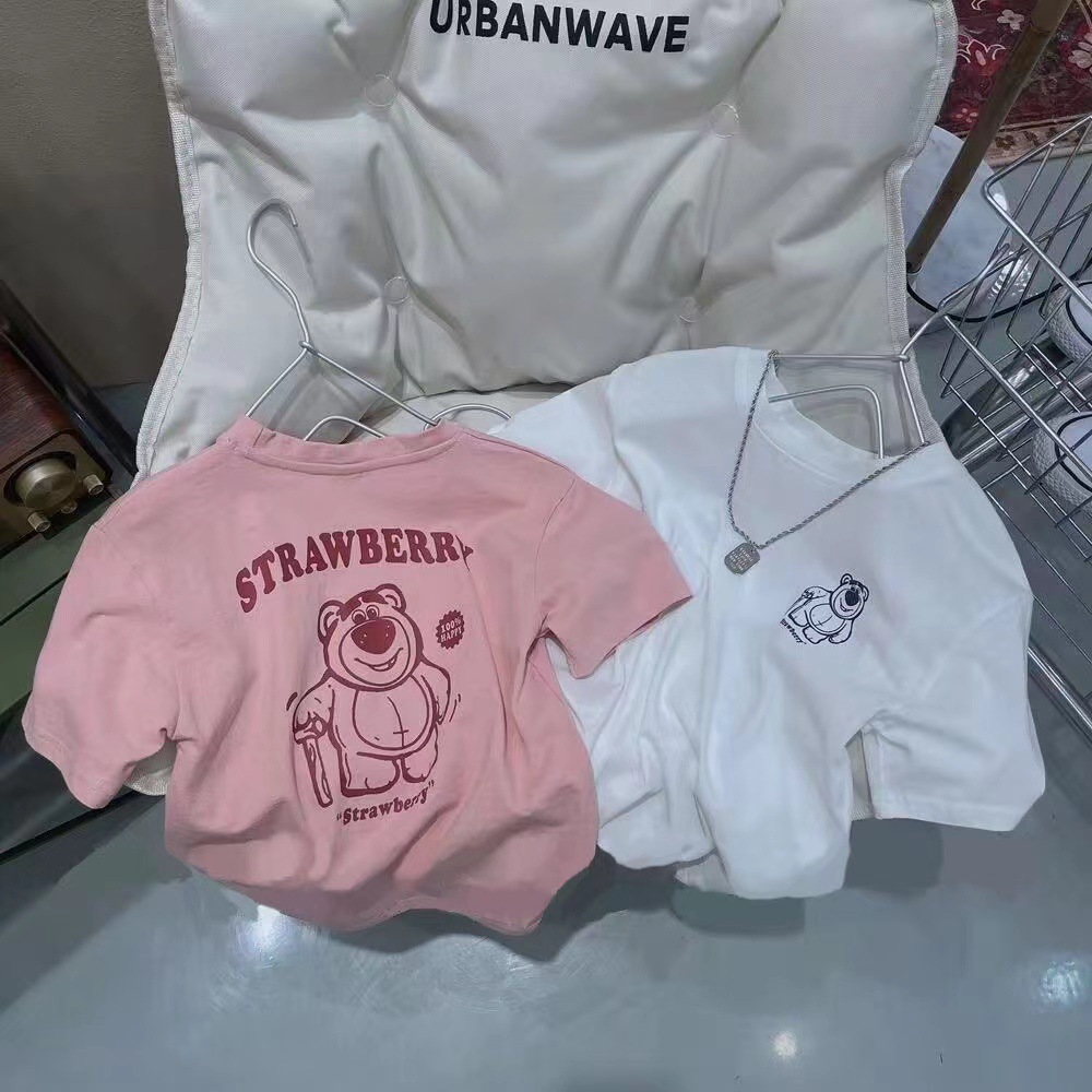 어린이 면화 여름 티셔츠 소년 소녀 아기 반팔 딸기 곰 느슨한 반소매 옷 만화 귀여운 탑 옷스토어 가기