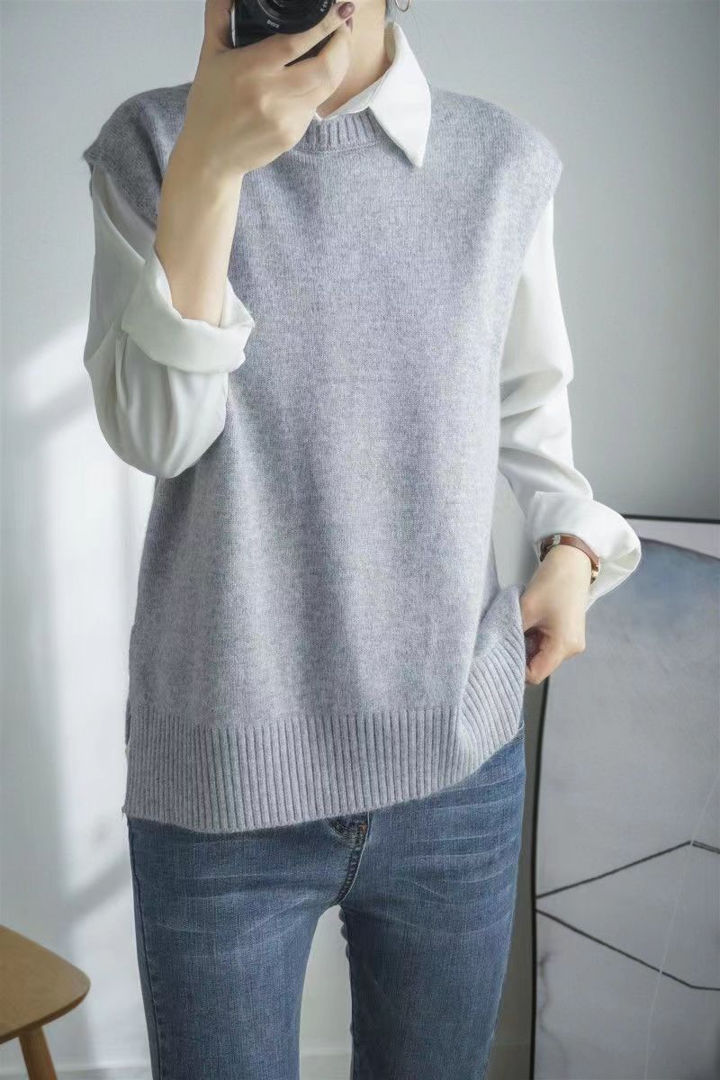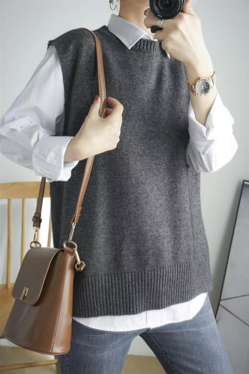 크루 넥 양모 니트 조끼 여성 봄 · 가을 새 풀오버 캐시미어 민소매 한국 루즈베이스 셔츠 스웨터