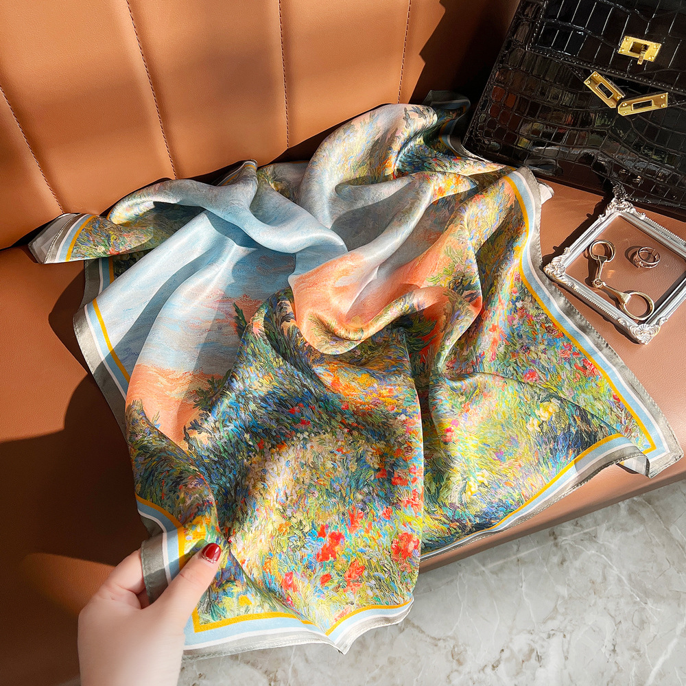 봄 새로운 크레이프 새틴 유화 인쇄 실크 스카프 여성의 다용도 높은 감각 100% 뽕나무 실크 스카프 선물