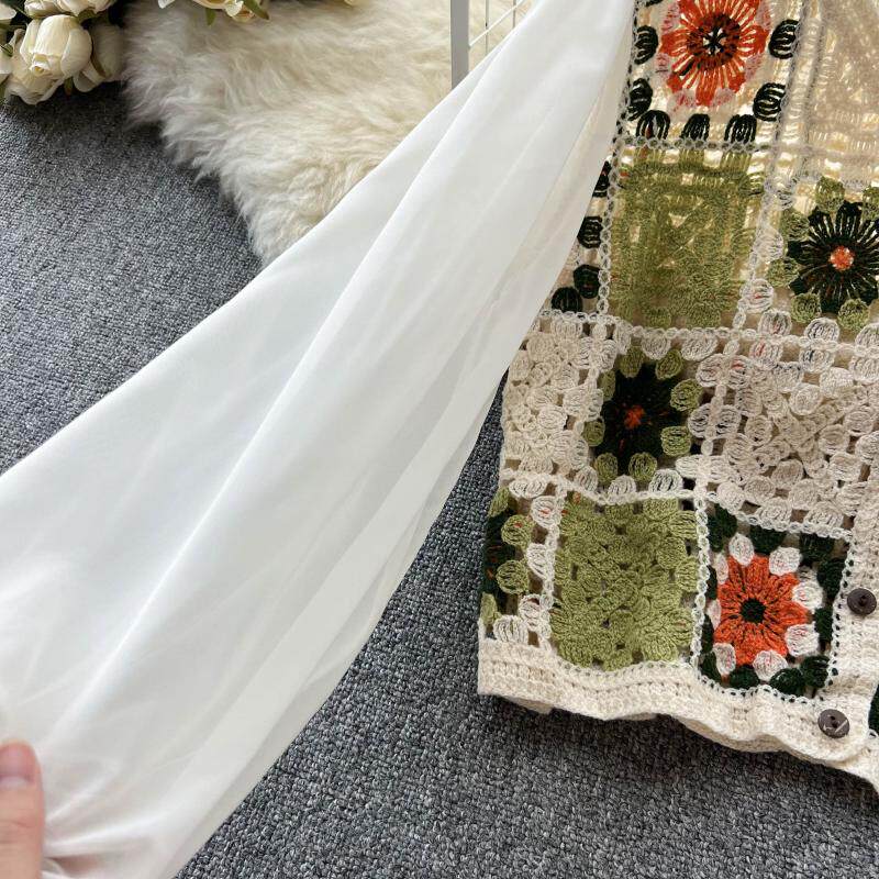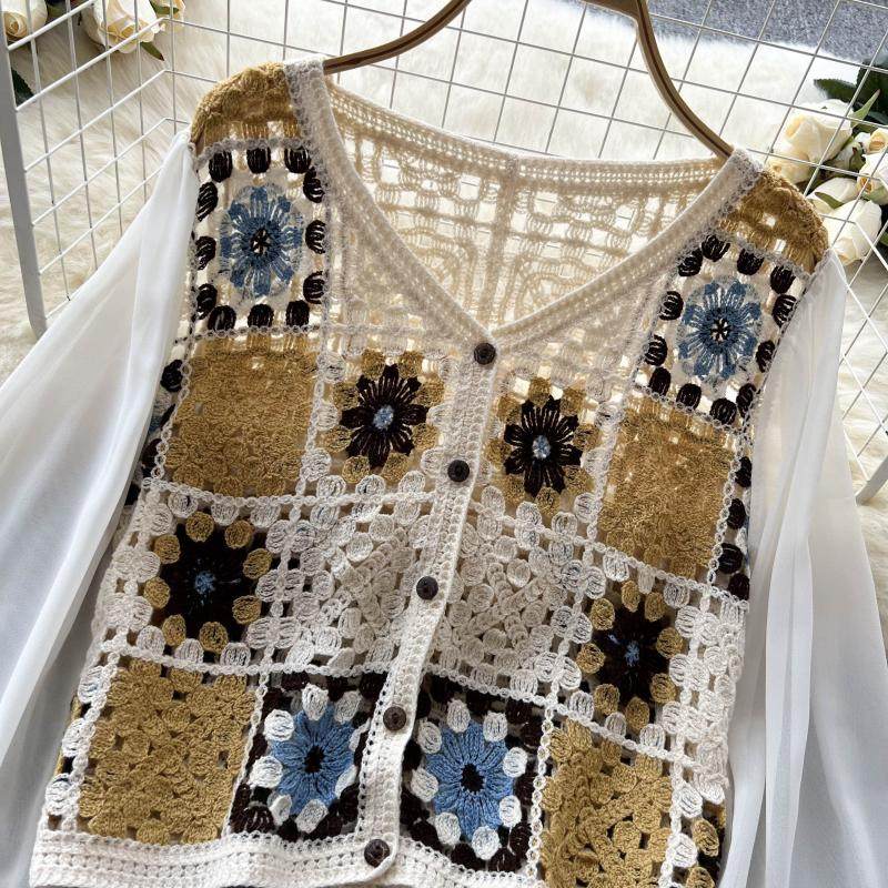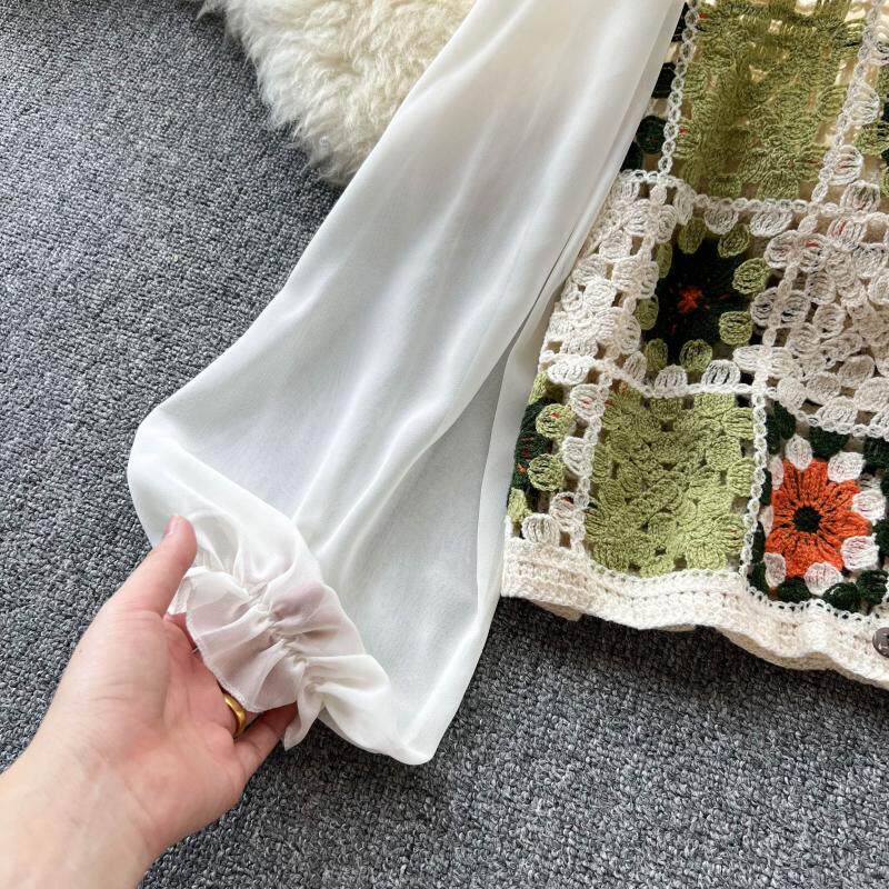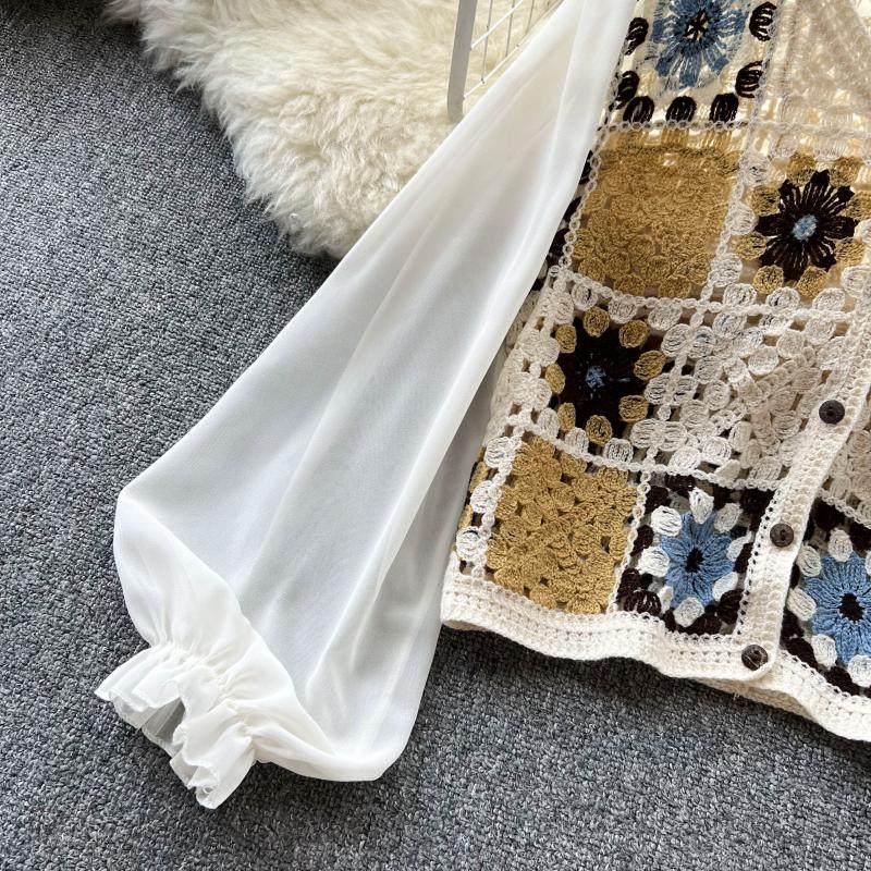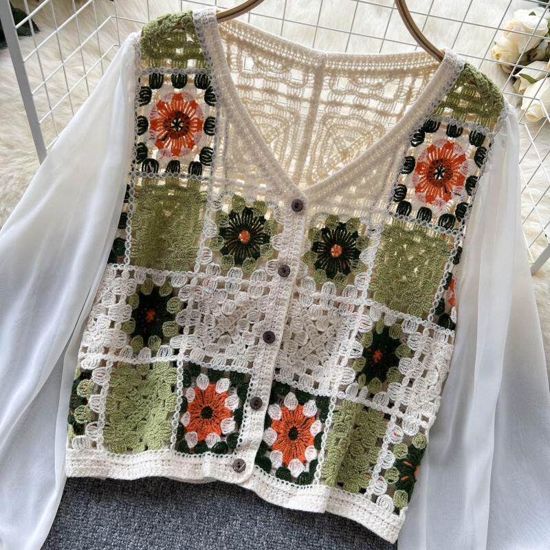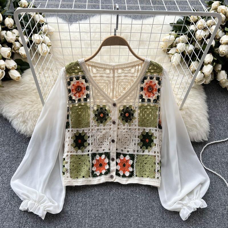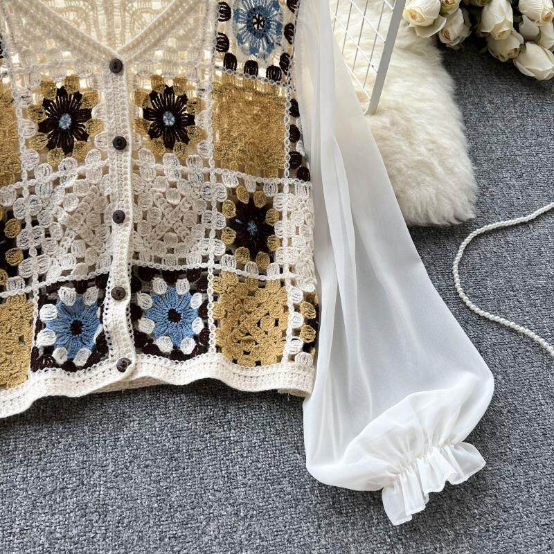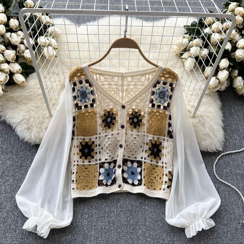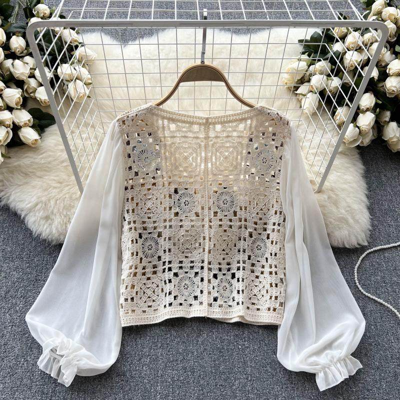 2024 봄과 여름 새로운 뜨개질을 한 속이 빈 레이스 셔츠 쉬폰 스티칭 디자인 세련된 느슨한 짧은 상단