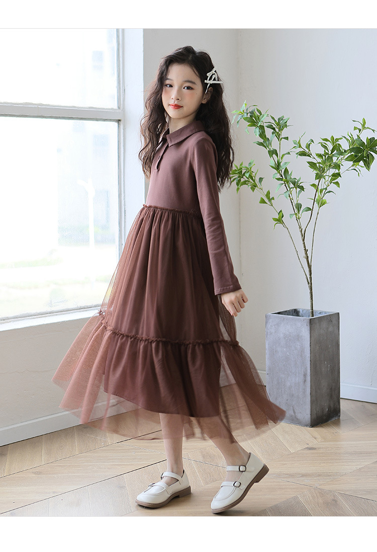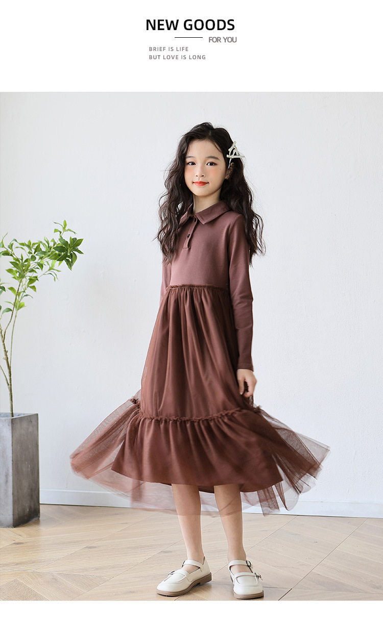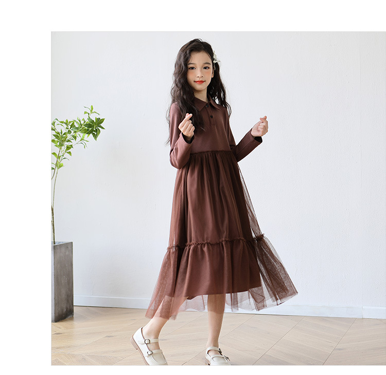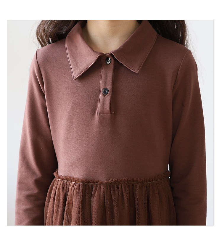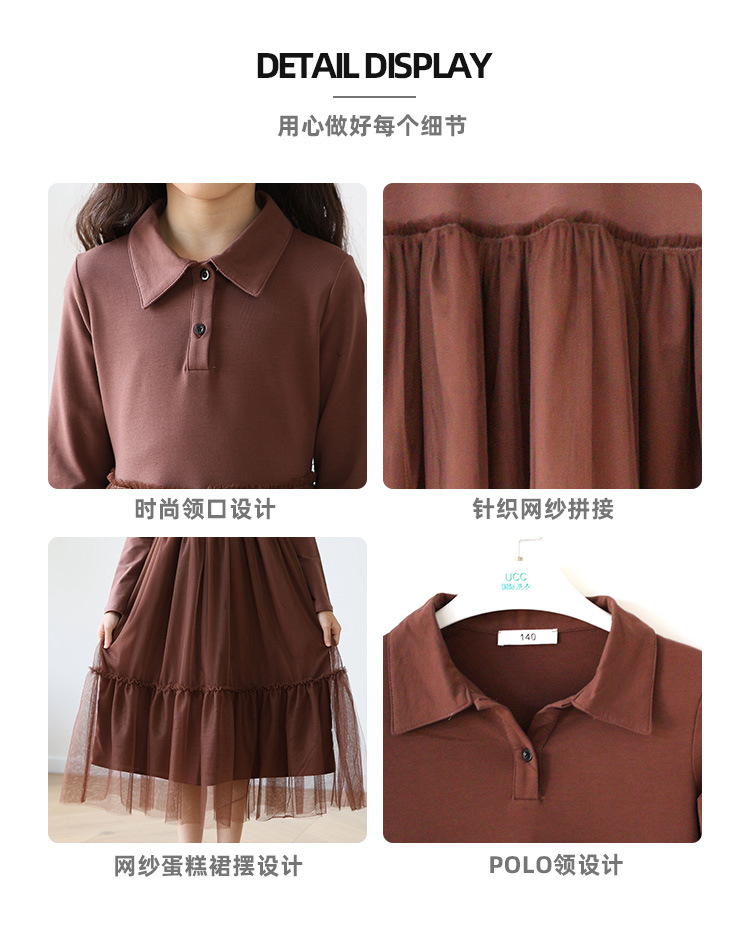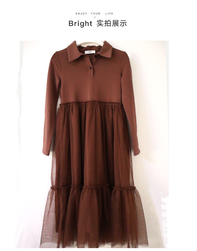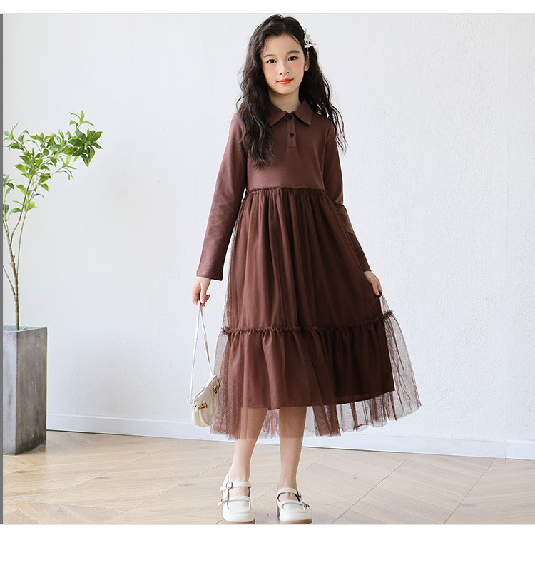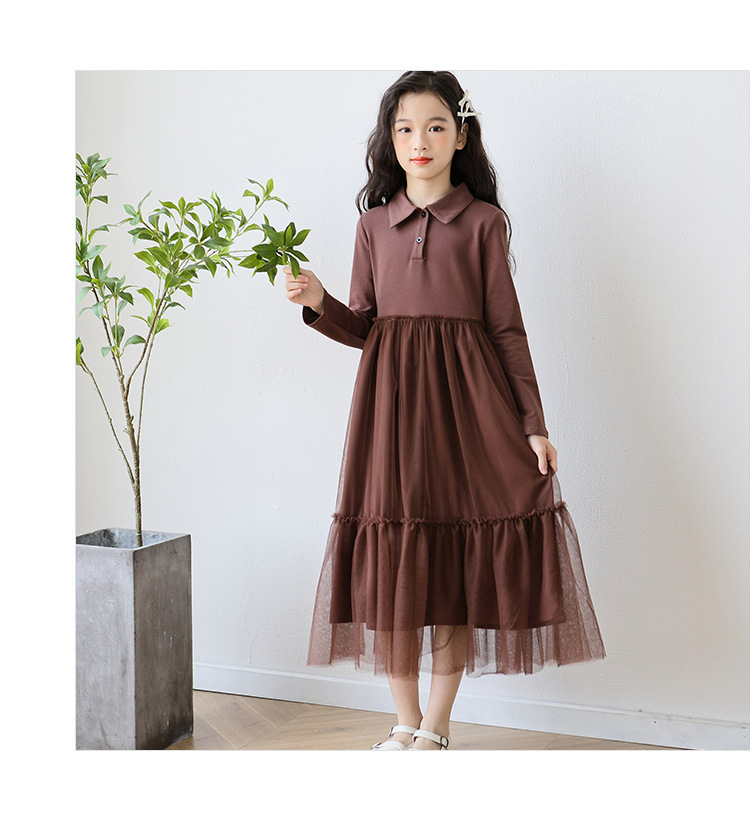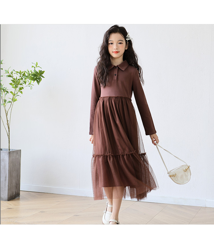 소녀 원피스 2024 봄과 가을 새로운 POLO 칼라 인기 Maillard 다크 브라운 원피스 스티칭 원피스 거즈 원피스스토어 가기