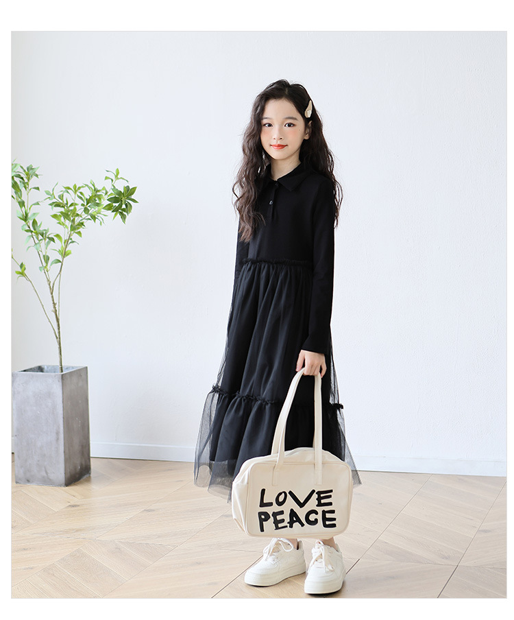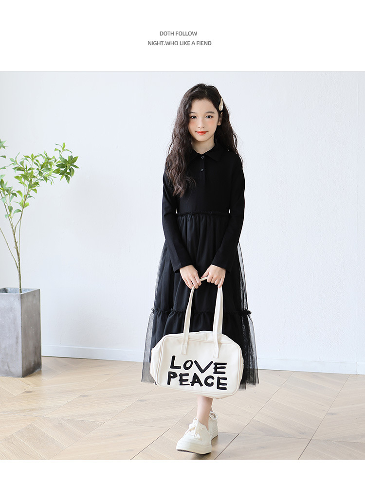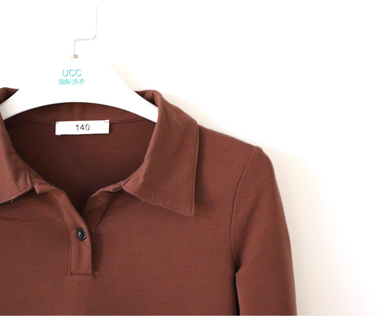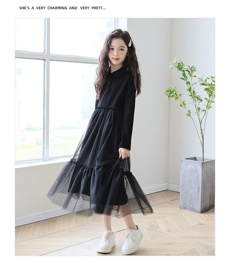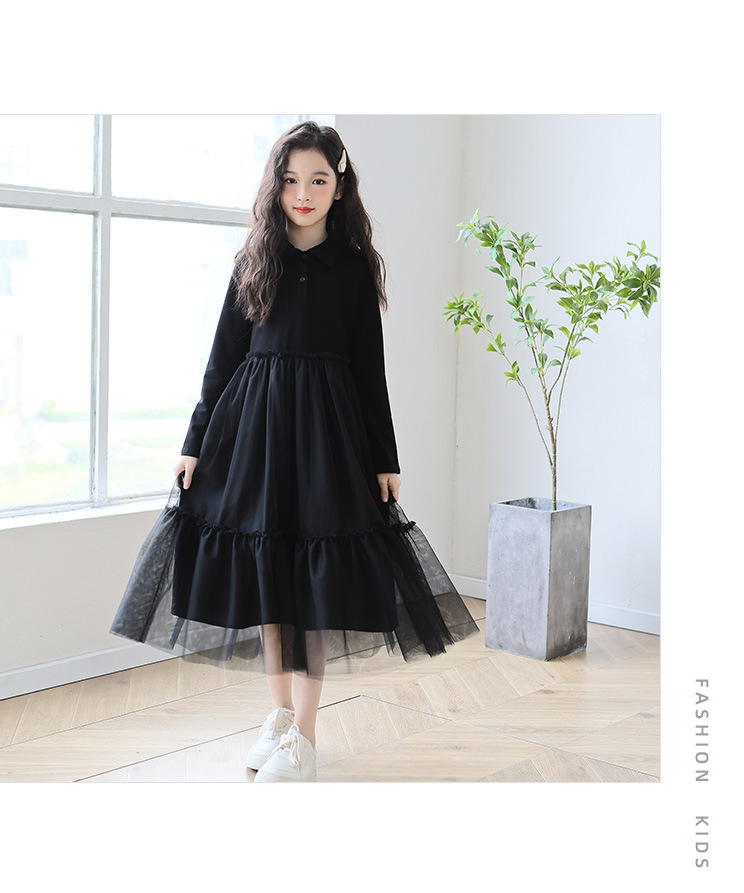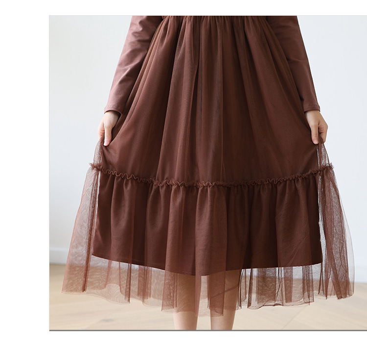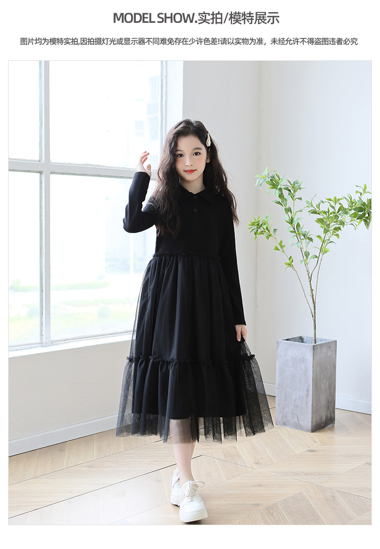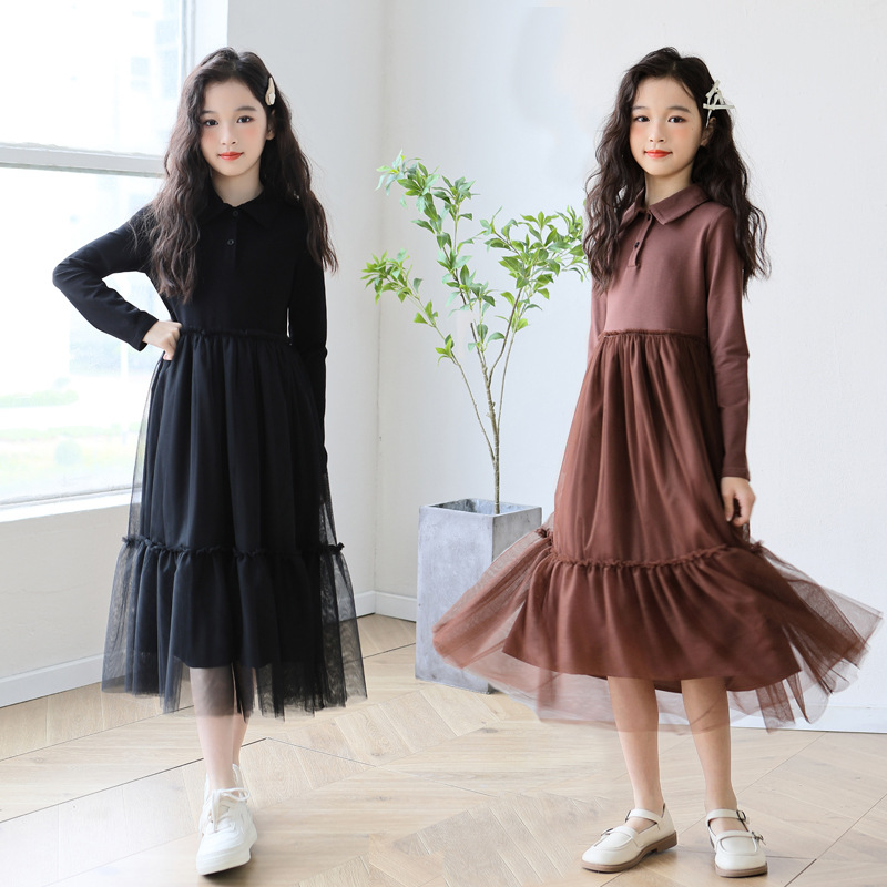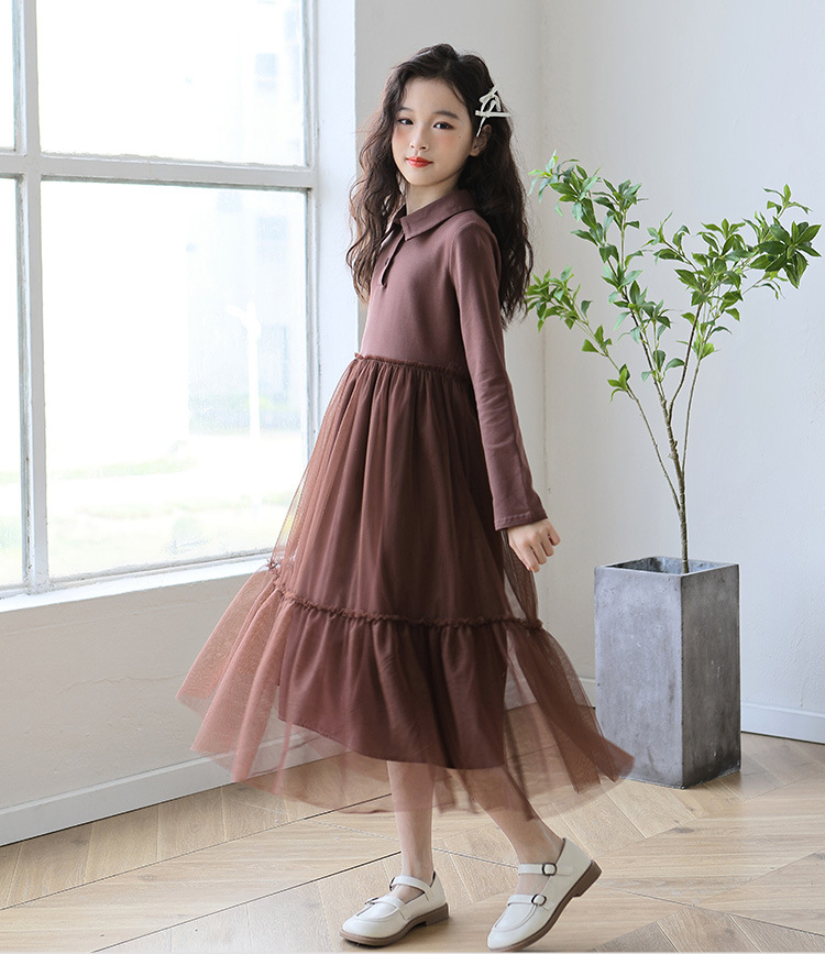 소녀 원피스 2024 봄과 가을 새로운 POLO 칼라 인기 Maillard 다크 브라운 원피스 스티칭 원피스 거즈 원피스스토어 가기