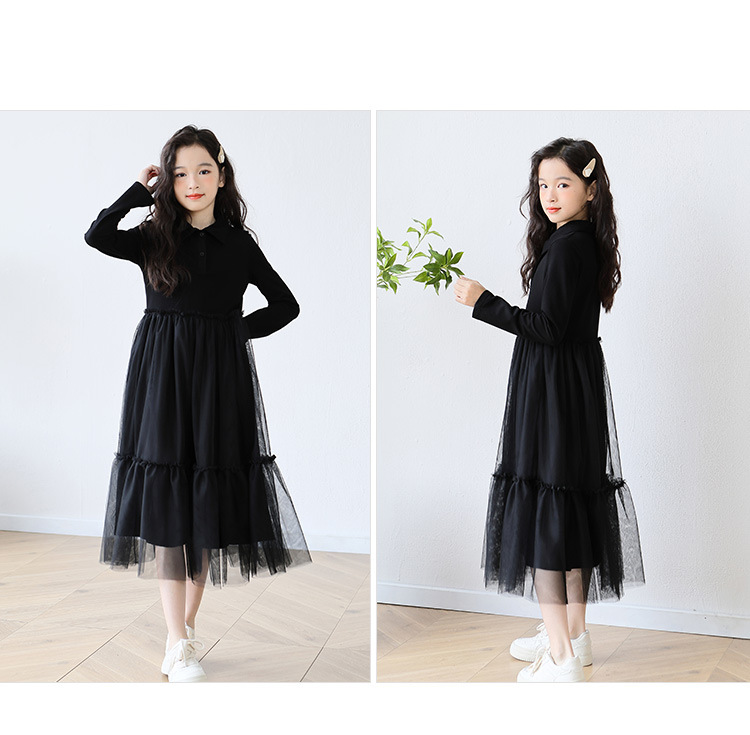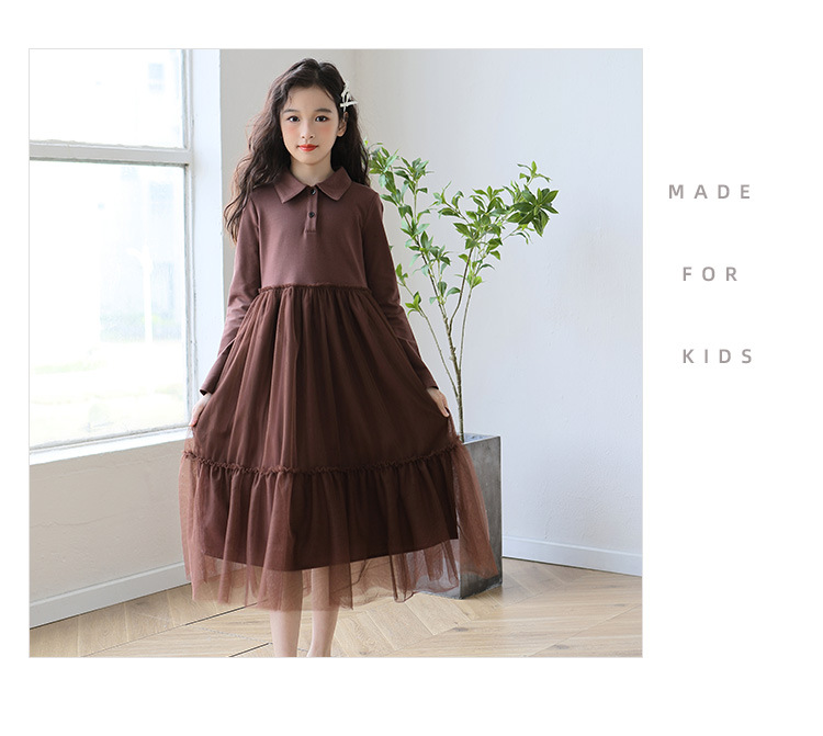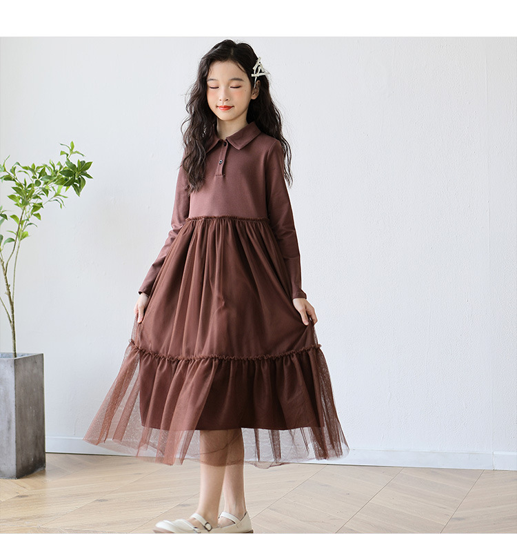 소녀 원피스 2024 봄과 가을 새로운 POLO 칼라 인기 Maillard 다크 브라운 원피스 스티칭 원피스 거즈 원피스