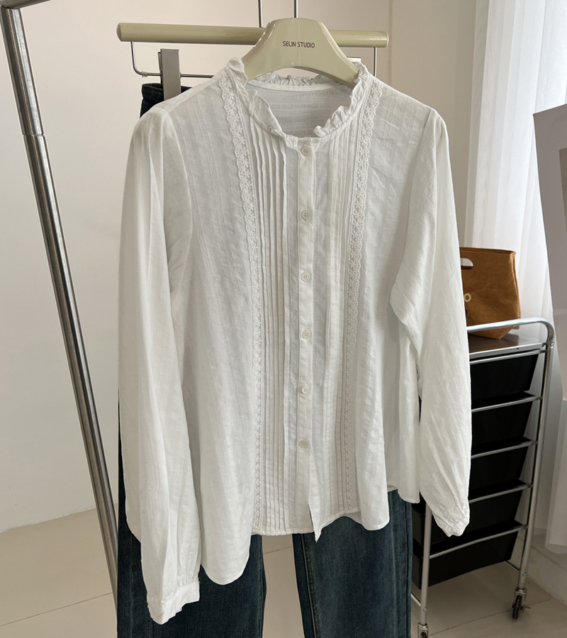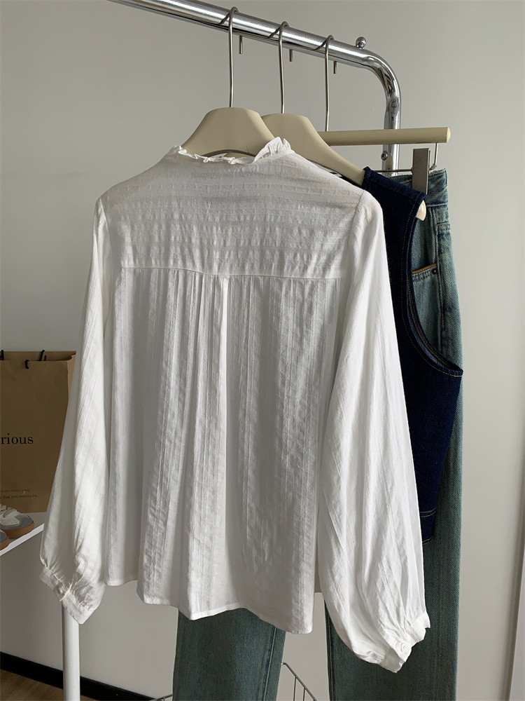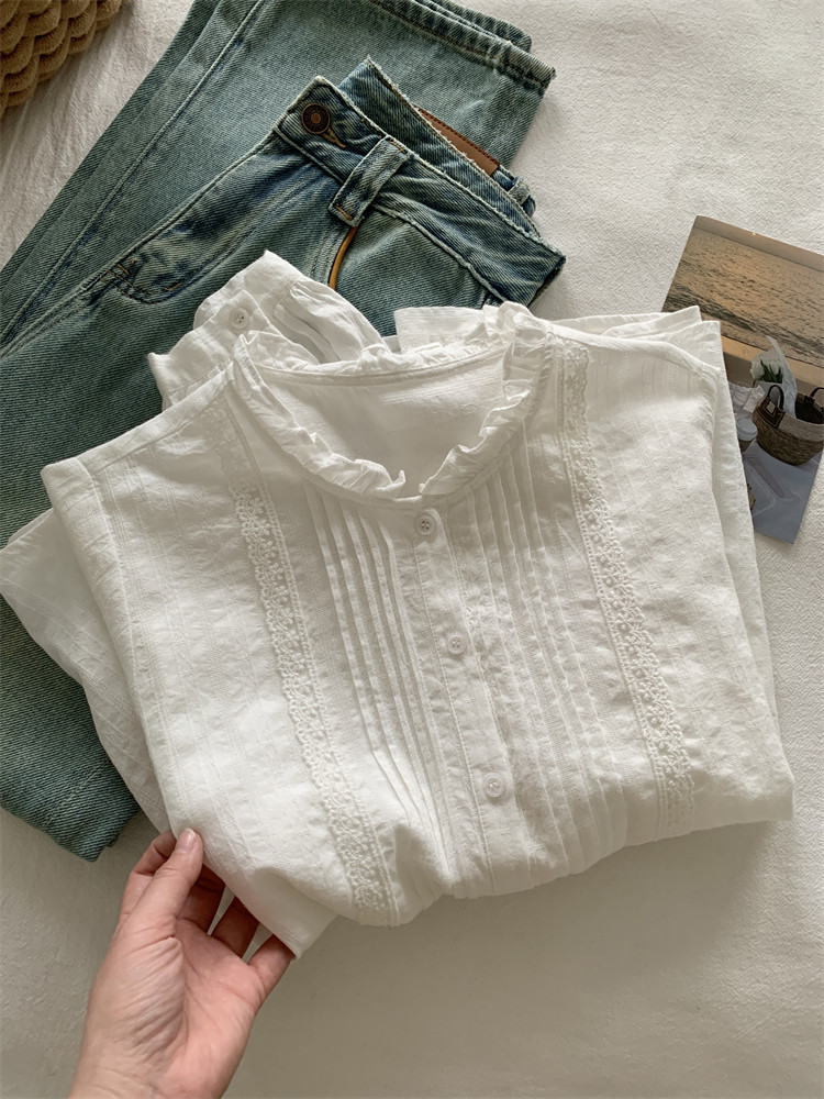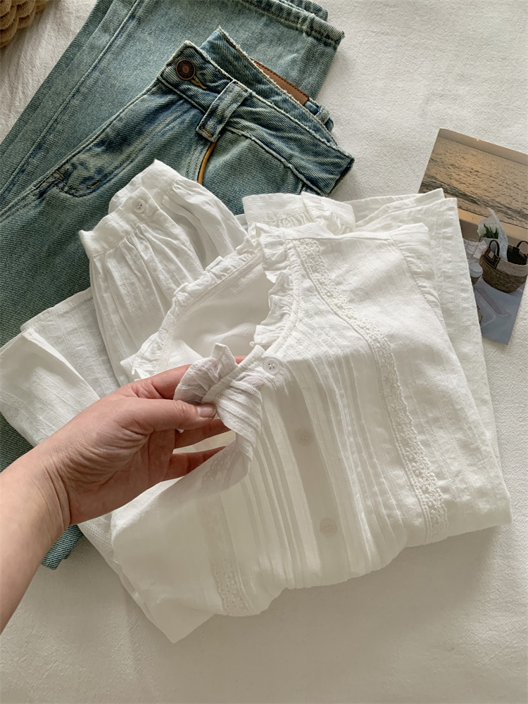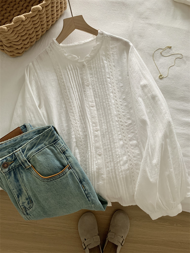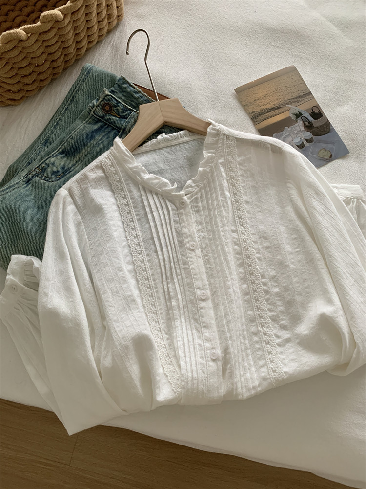 여성을위한 프랑스 버섯 레이스 긴팔 셔츠 2025 새로운 흰색 디자인 부드러운 스플 라이스 셔츠 봄 탑스토어 가기
