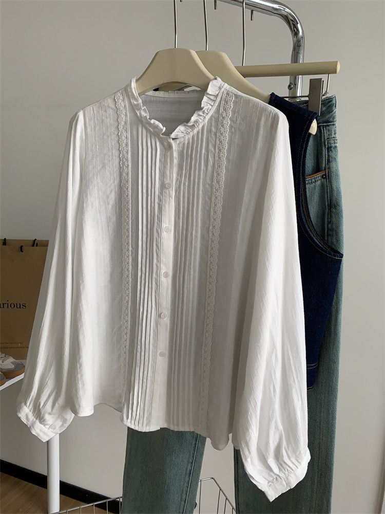여성을위한 프랑스 버섯 레이스 긴팔 셔츠 2025 새로운 흰색 디자인 부드러운 스플 라이스 셔츠 봄 탑