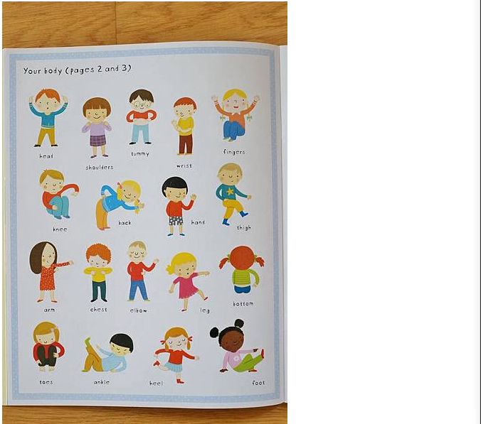 內容就是透過貼貼紙的互動過程中,帶著你認識身體的每一個部位 (的英文單字)
