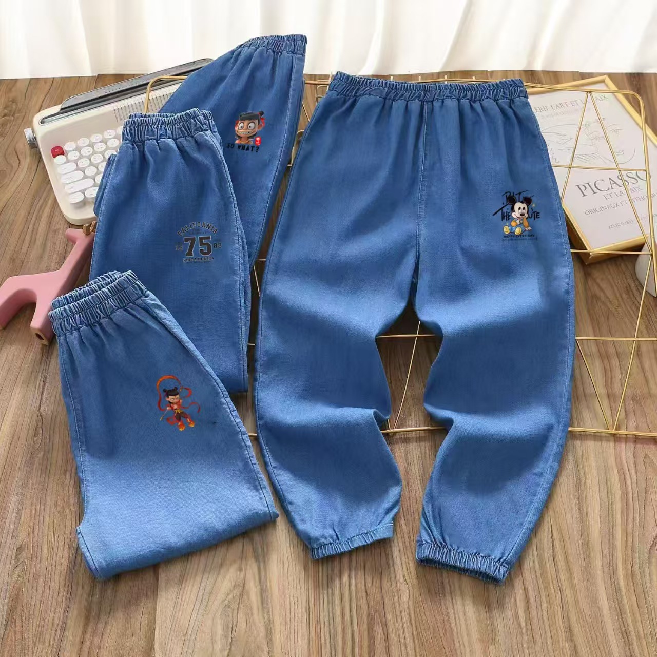 텐셀 데님 모기 바지 어린이 청바지 여름 소년 소녀 만화 어린이 바지 공장 도매