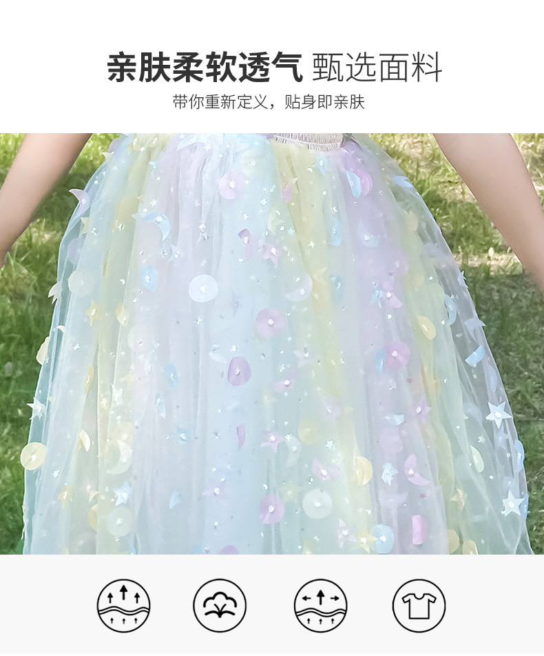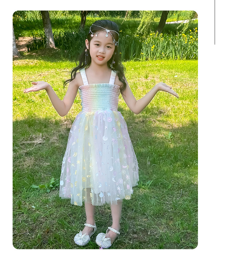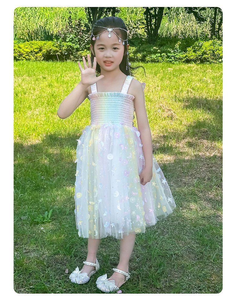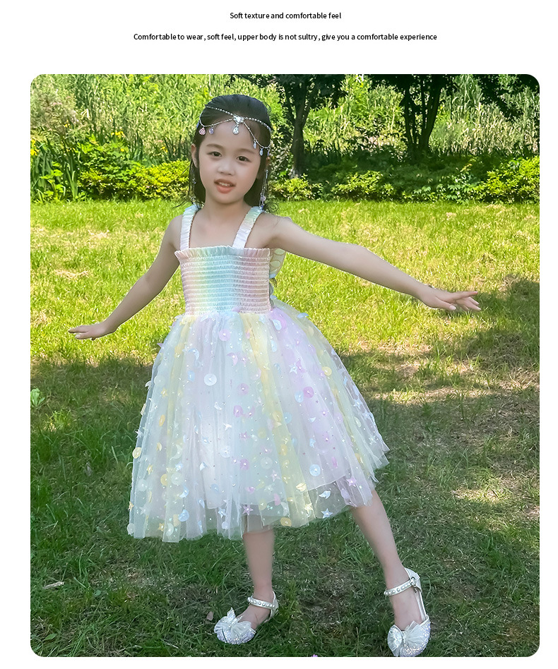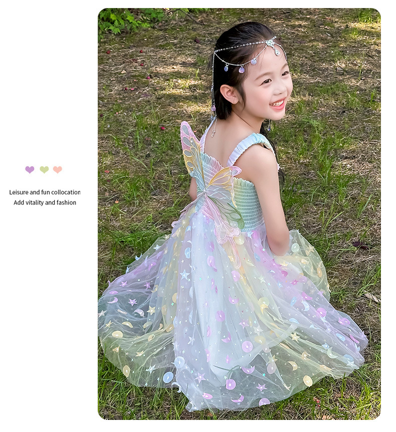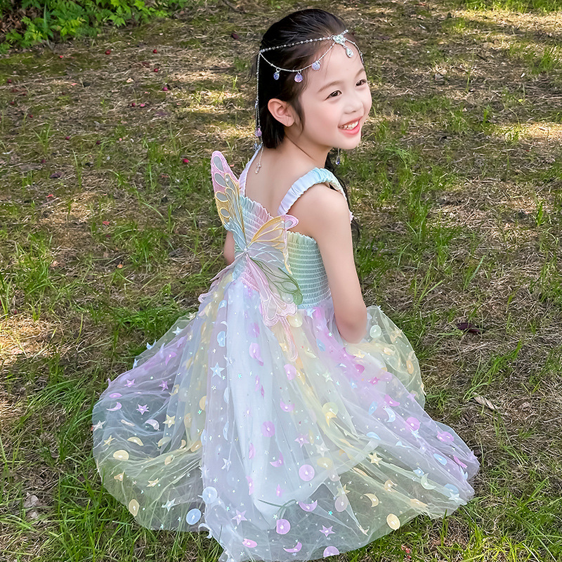 소녀의 원피스 2024 여름 새로운 어린이 판타지 엘프 나비 무지개 원피스 아기의 슬링 공주 원피스