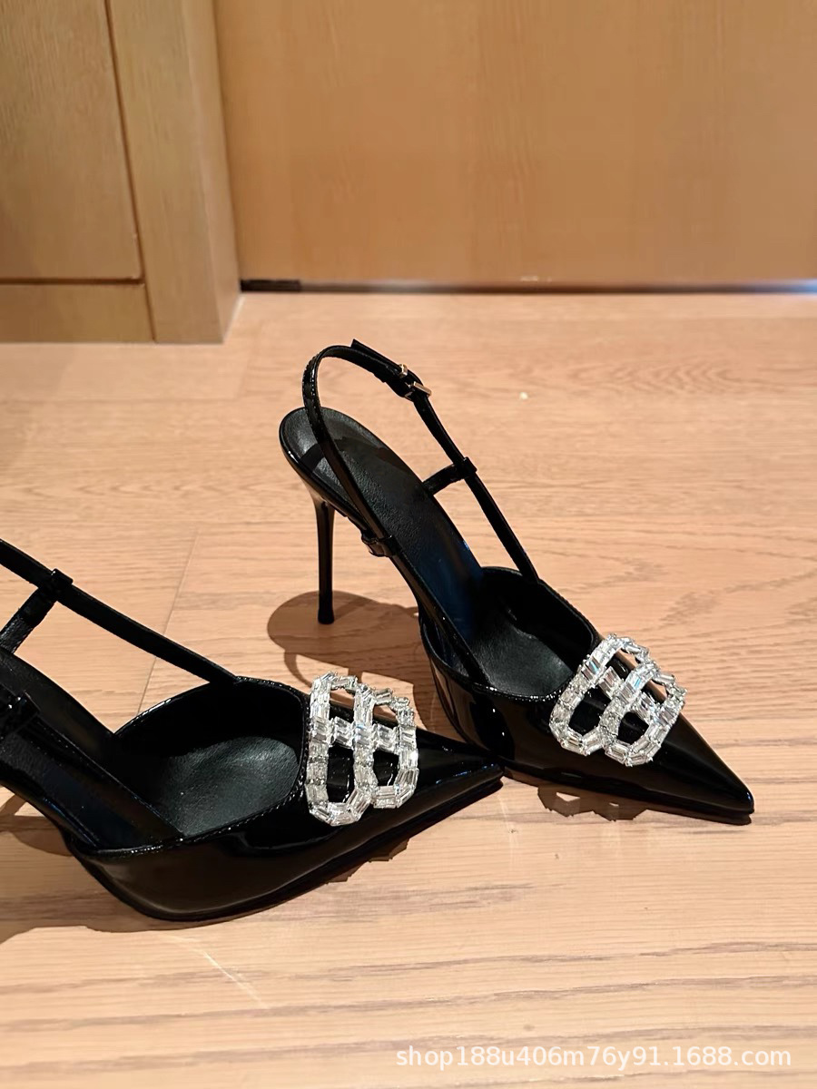 【재고 있음】2025년 신상 뾰족코 검정 하이힐 여성용 얇은 굽 크리스탈 스트랩 뾰족코 샌들 인기 모델스토어 가기