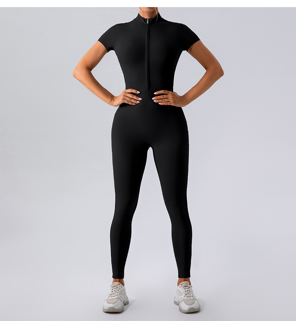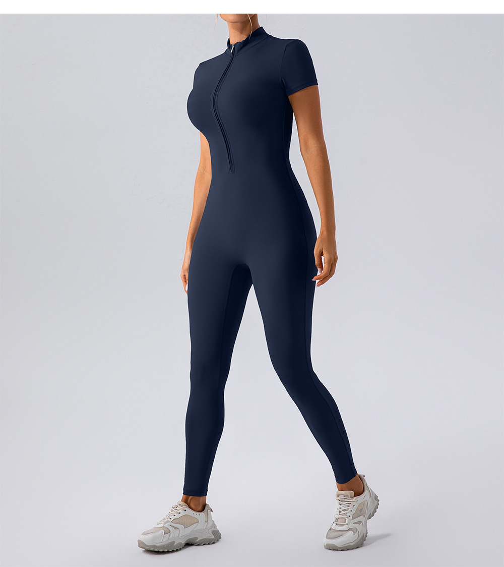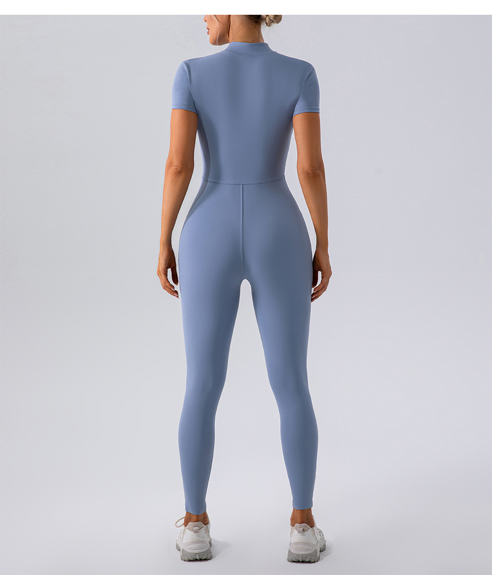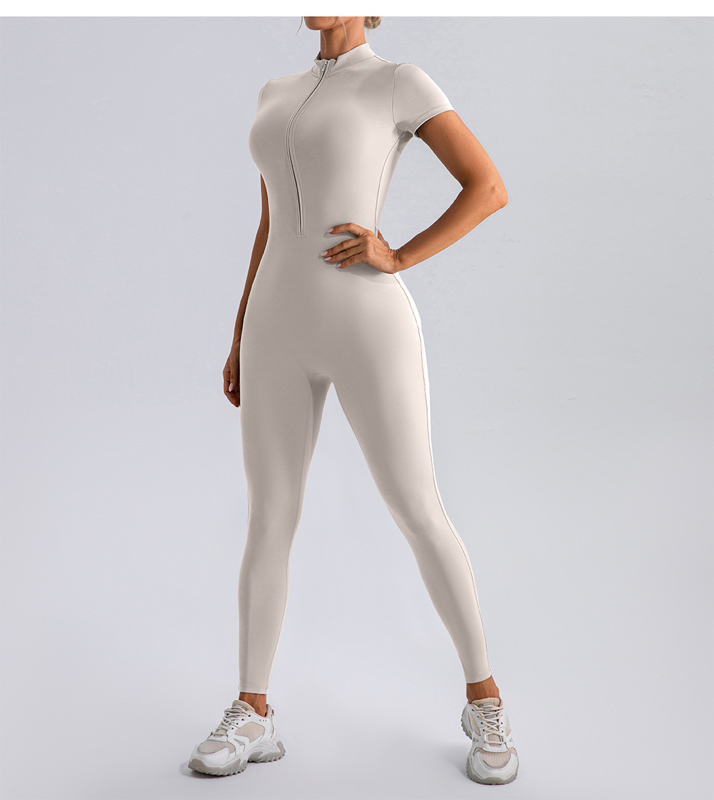 유럽과 미국의 새로운 지퍼 반팔 알몸 요가 바디 수트 여성 외부 피트니스 스포츠 바지 바디 수트
