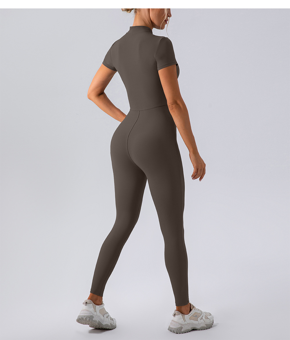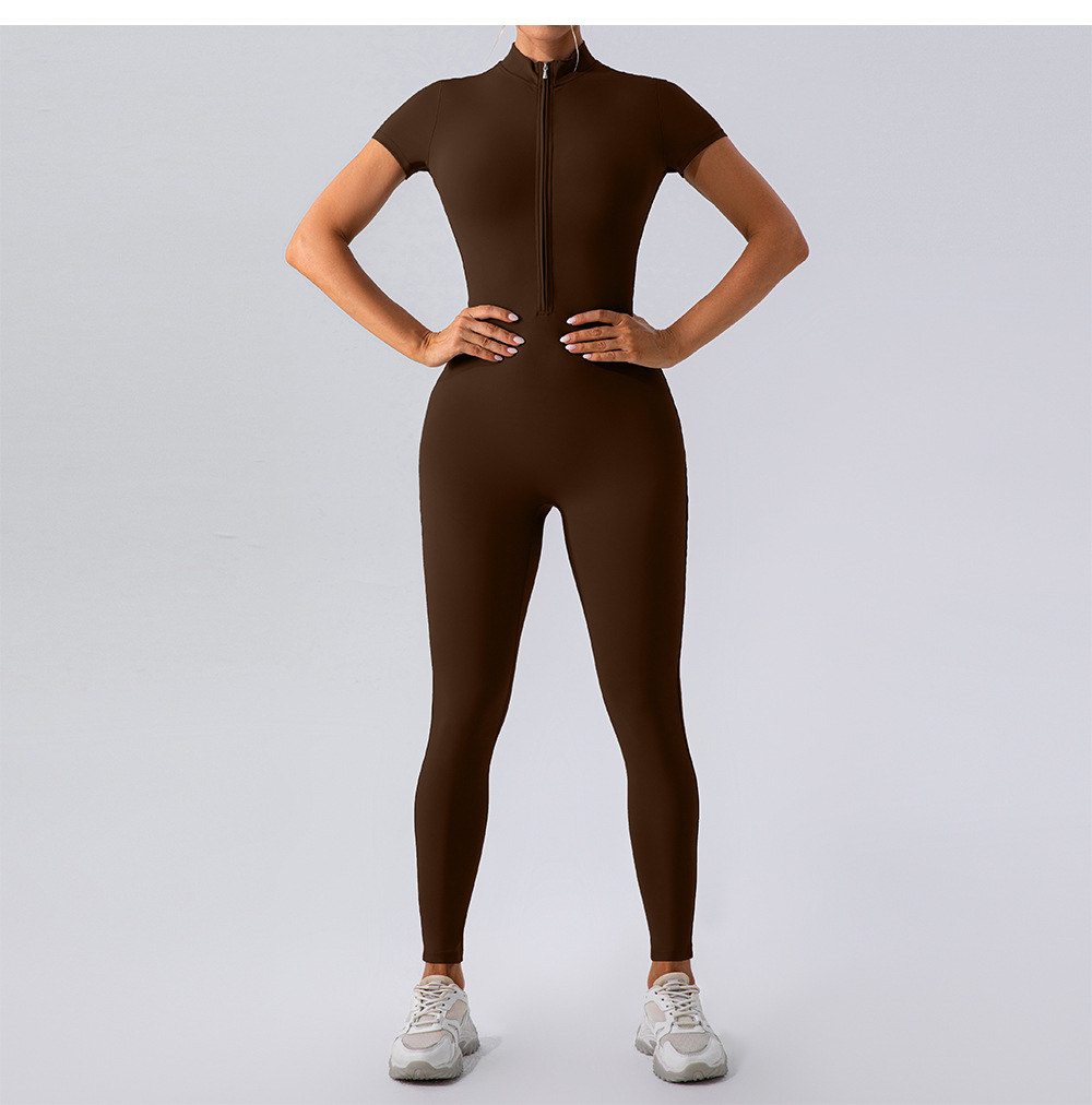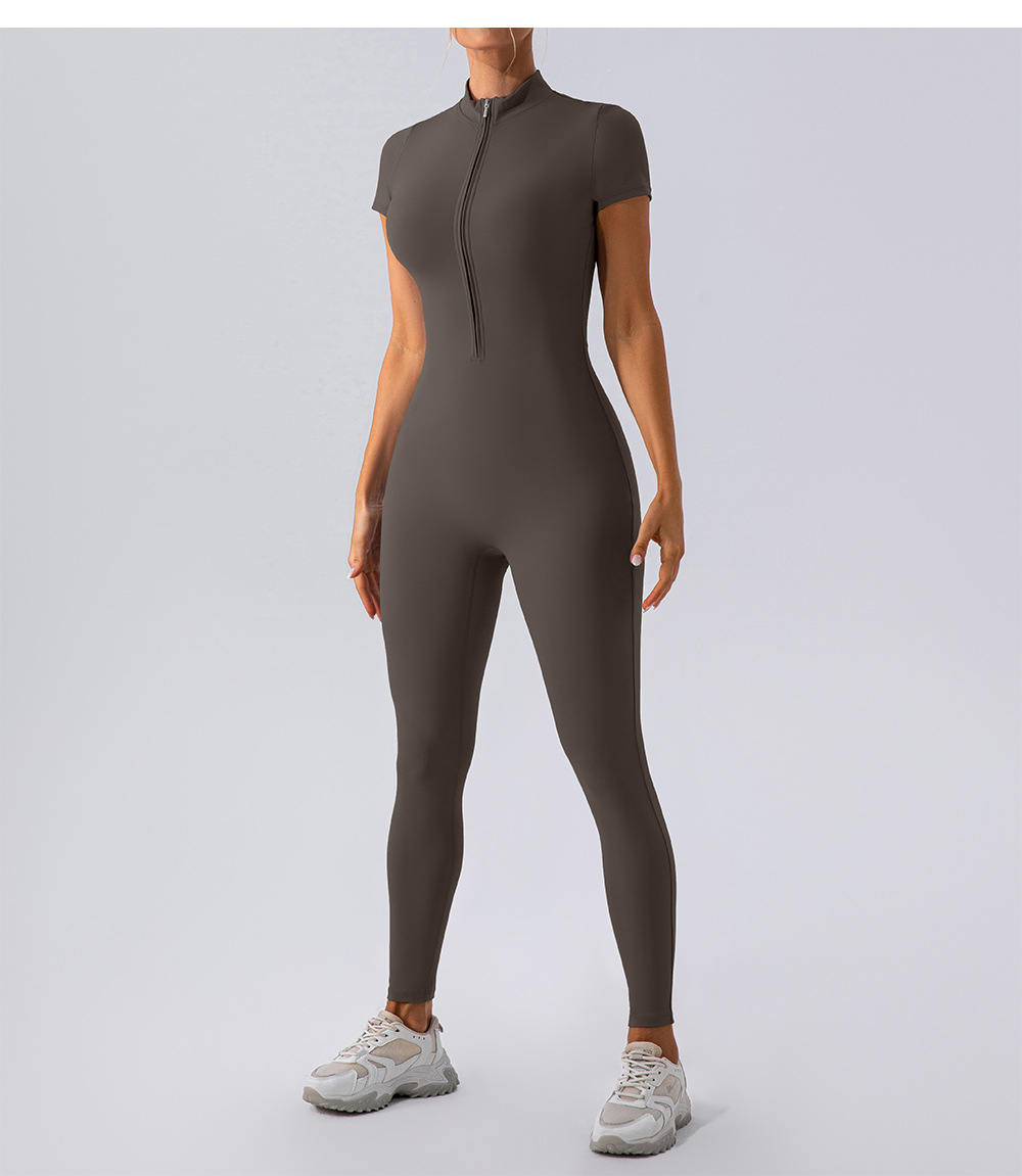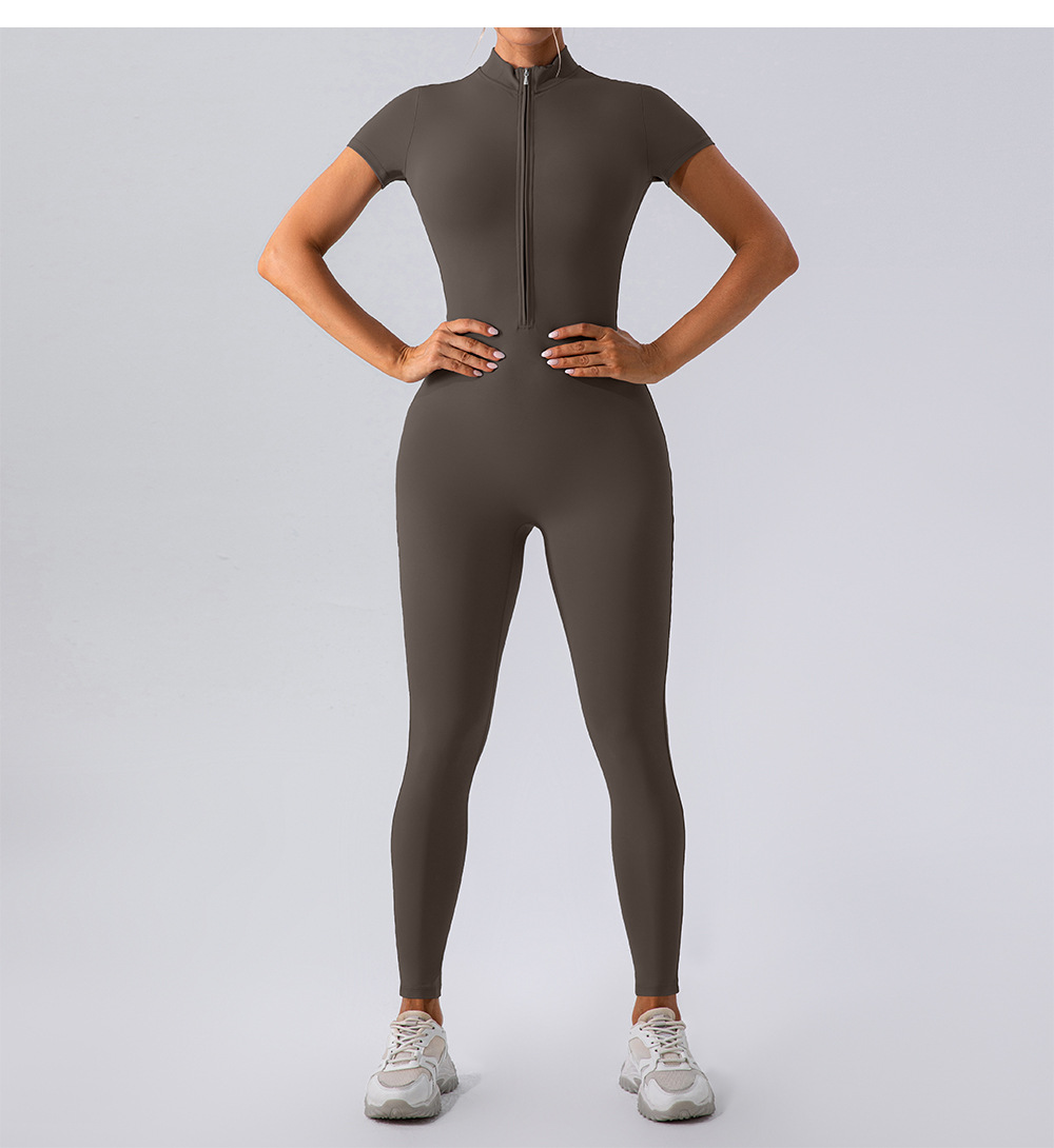 유럽과 미국의 새로운 지퍼 반팔 알몸 요가 바디 수트 여성 외부 피트니스 스포츠 바지 바디 수트