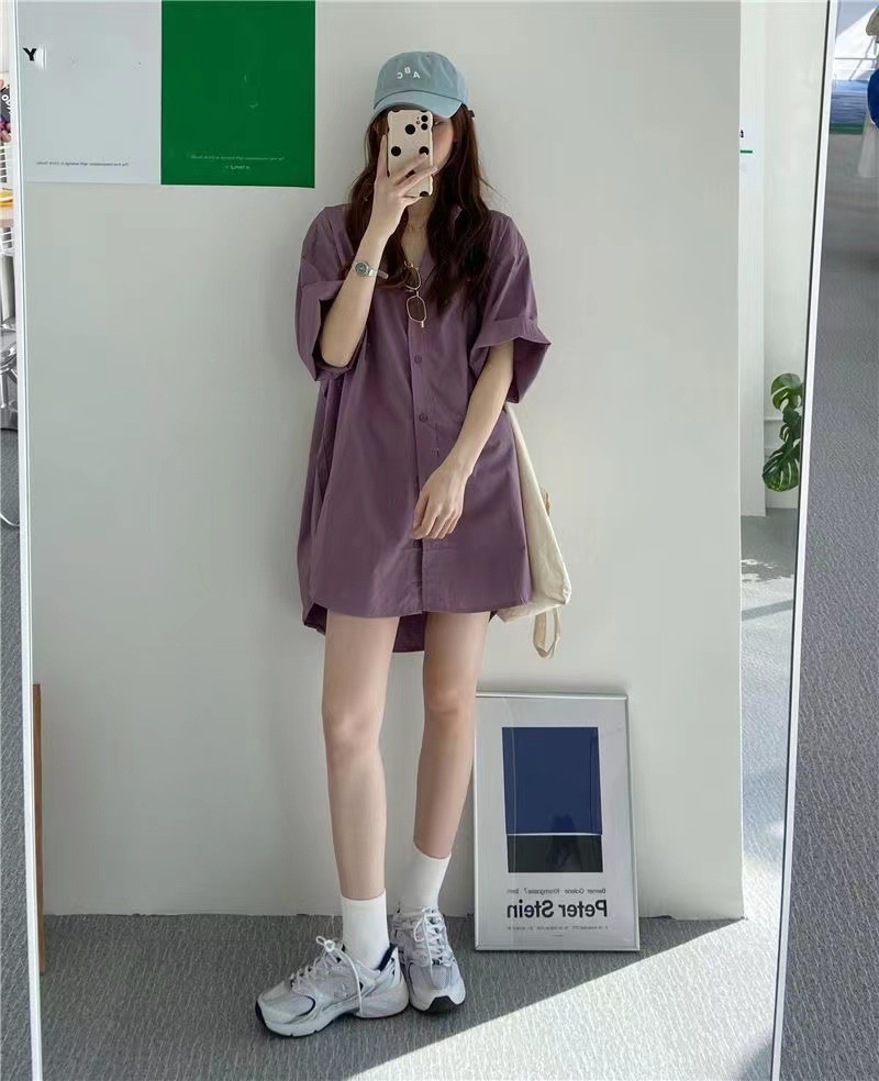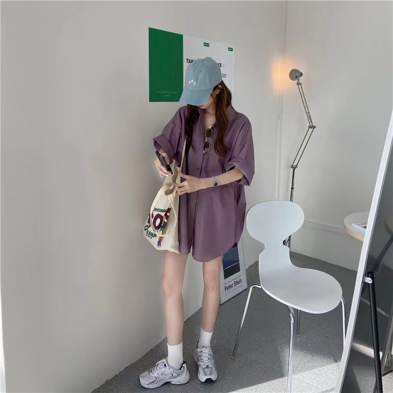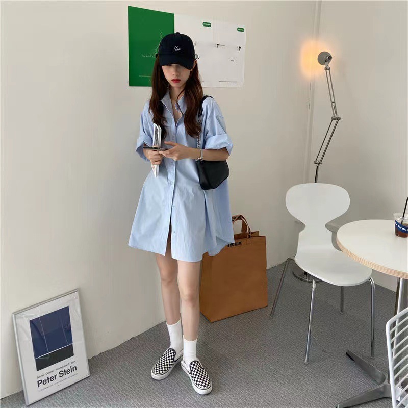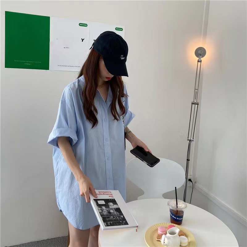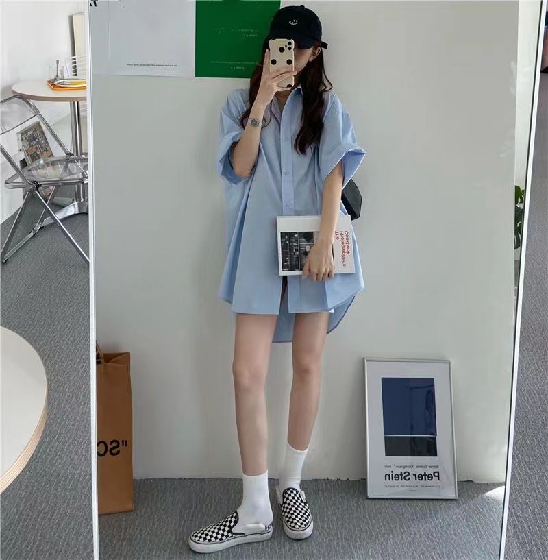 반팔 블루 셔츠 여성용 셔츠 코트 한국 스타일 느슨한 중간 길이 bf 스타일 최고 유행 유행 셔츠 스커트스토어 가기