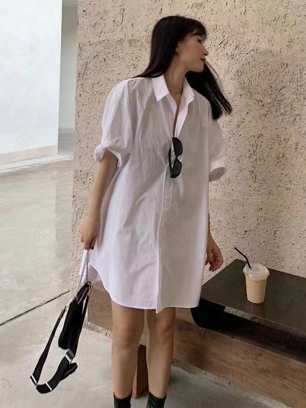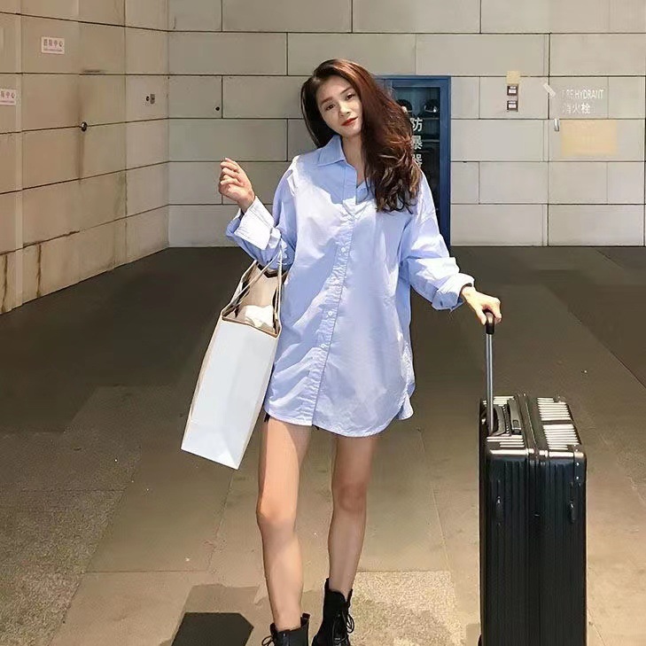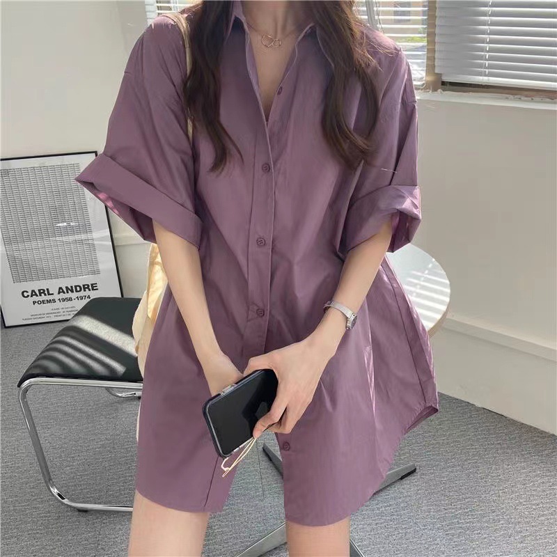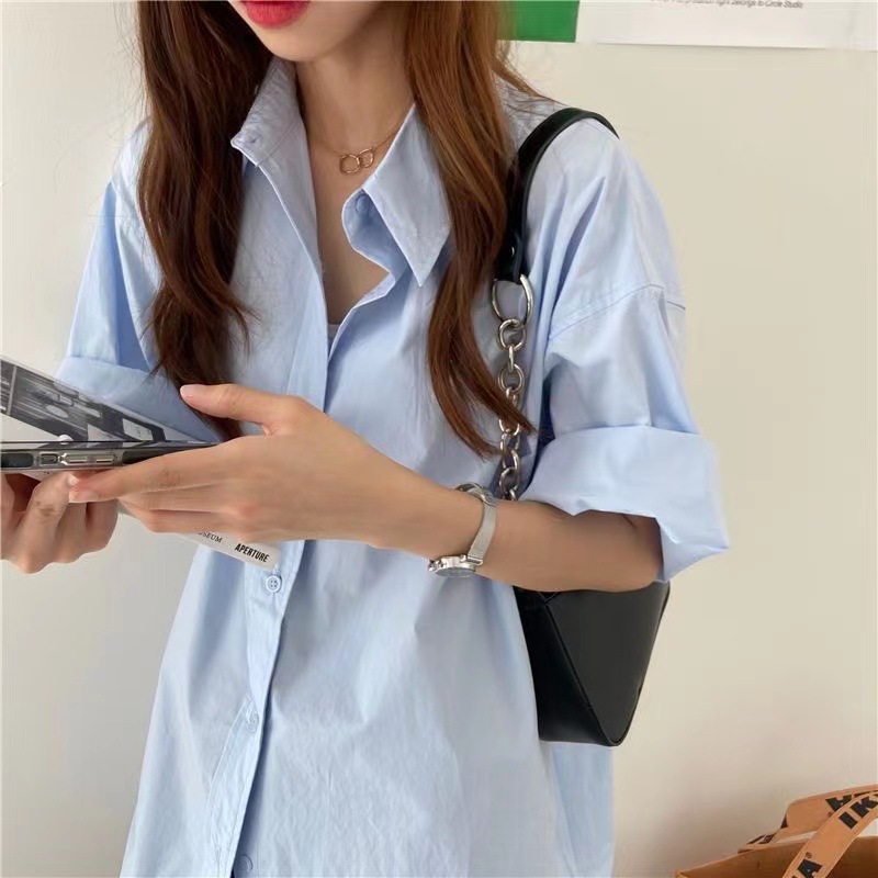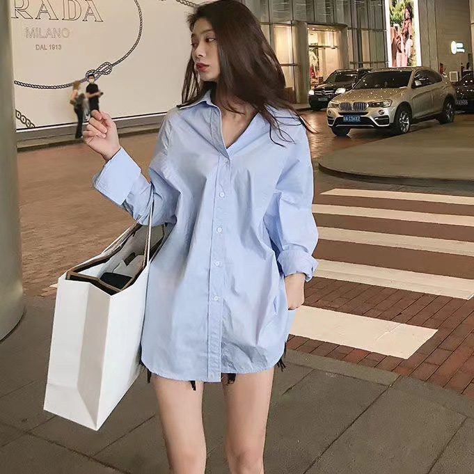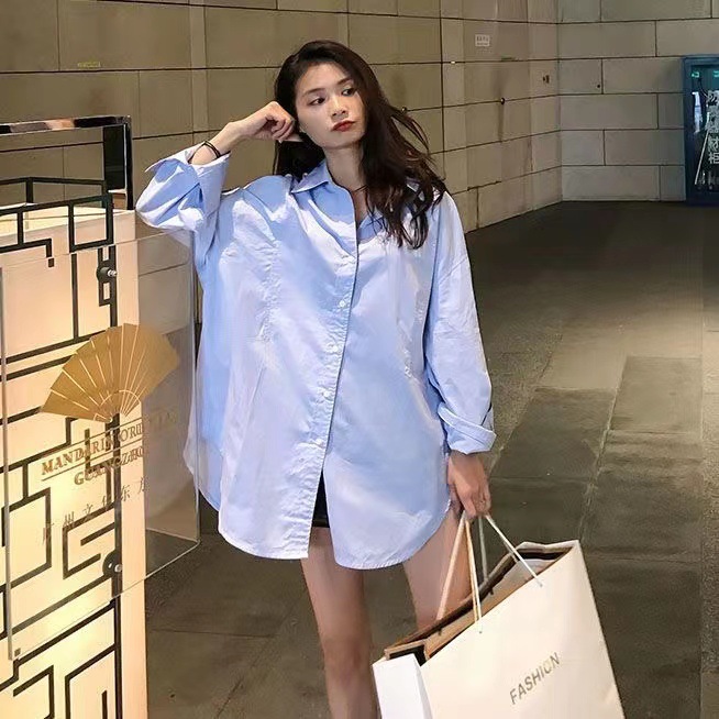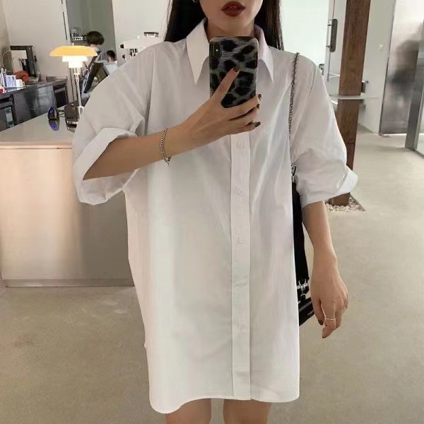 반팔 블루 셔츠 여성용 셔츠 코트 한국 스타일 느슨한 중간 길이 bf 스타일 최고 유행 유행 셔츠 스커트스토어 가기