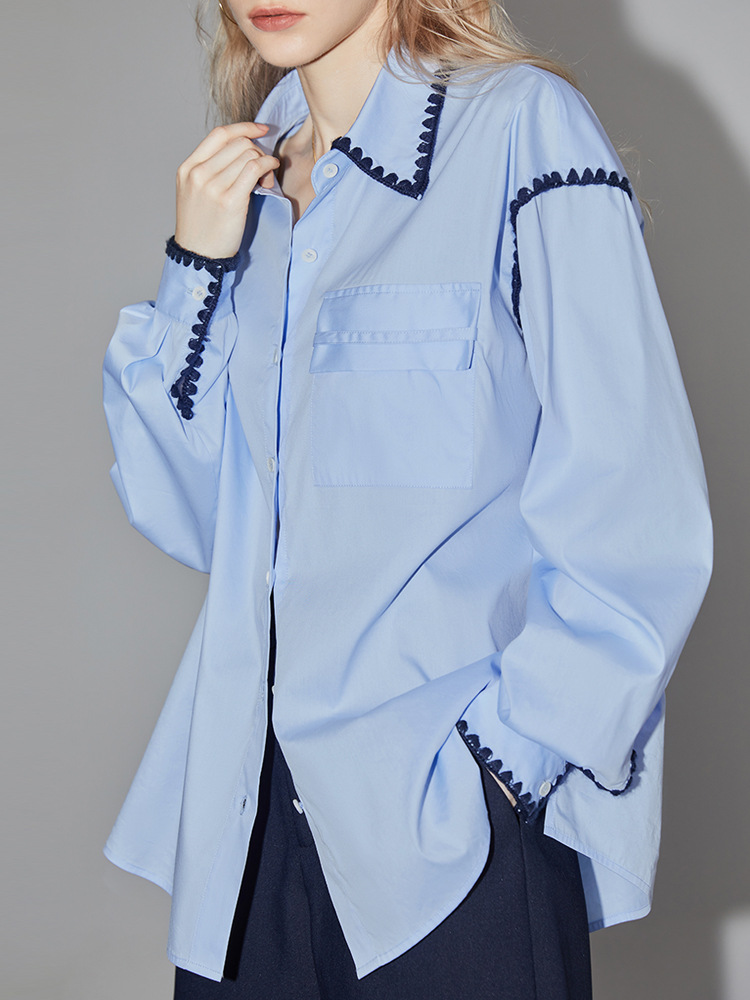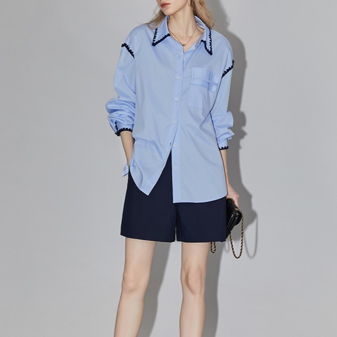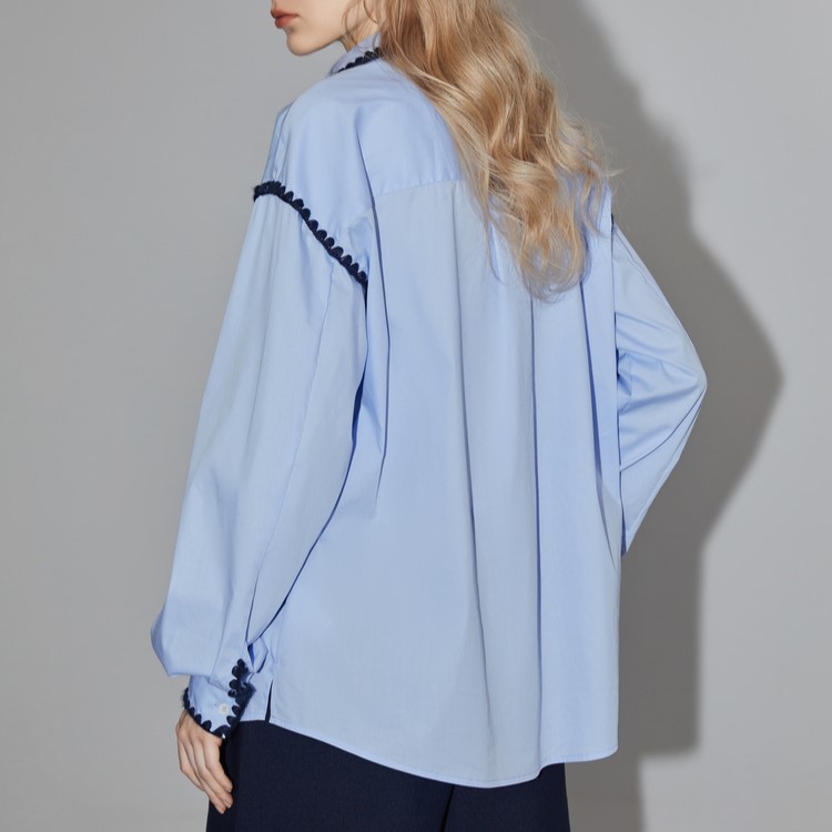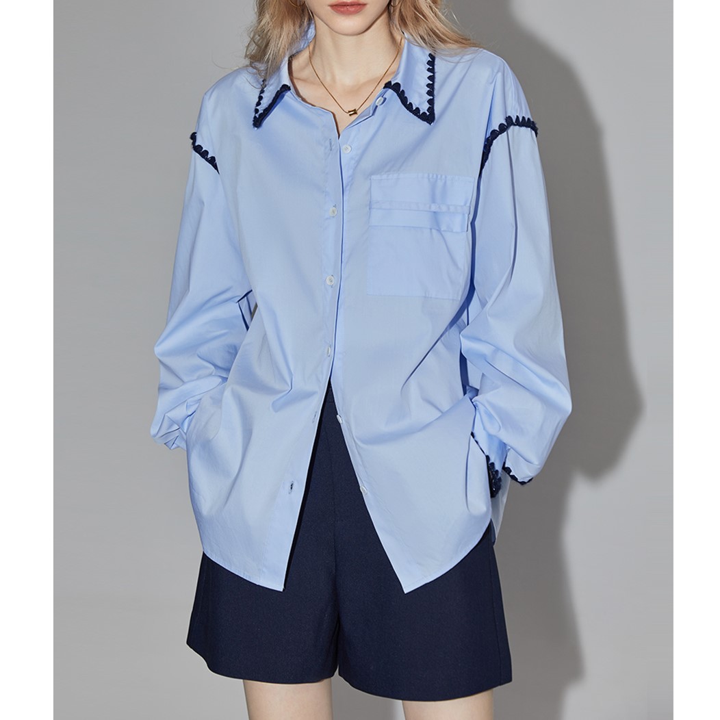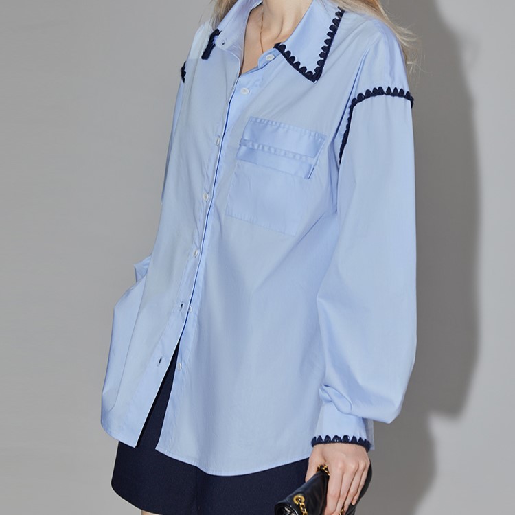 블루 디자인 쉘 자수 셔츠 여성 2025 봄 신상 루즈핏 슬림핏 독특한 스타일 탑스토어 가기