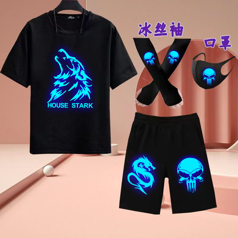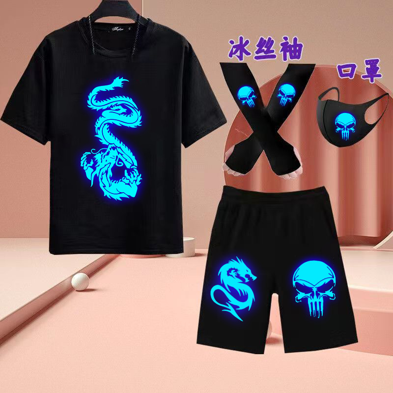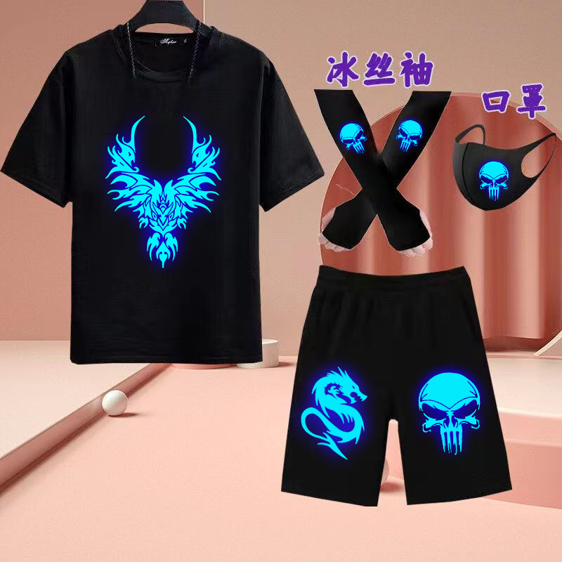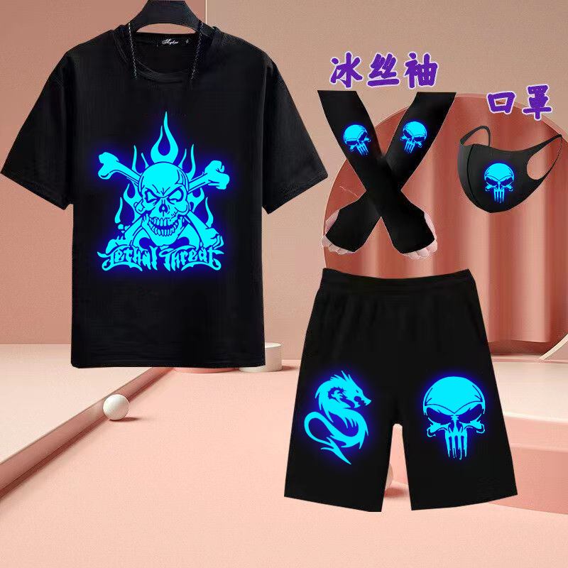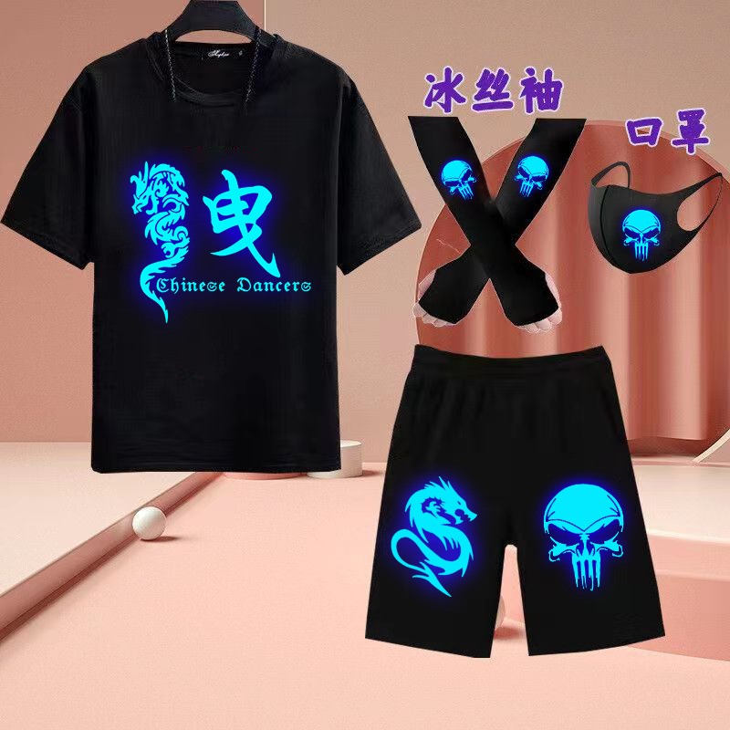 유령 댄스 빛나는 옷 반팔 세트 빛나는 티셔츠 소년 캐주얼 형광 옷은 마스크 아이스 실크 슬리브 여름을 보냅니다.