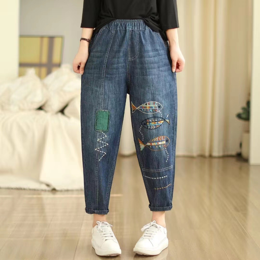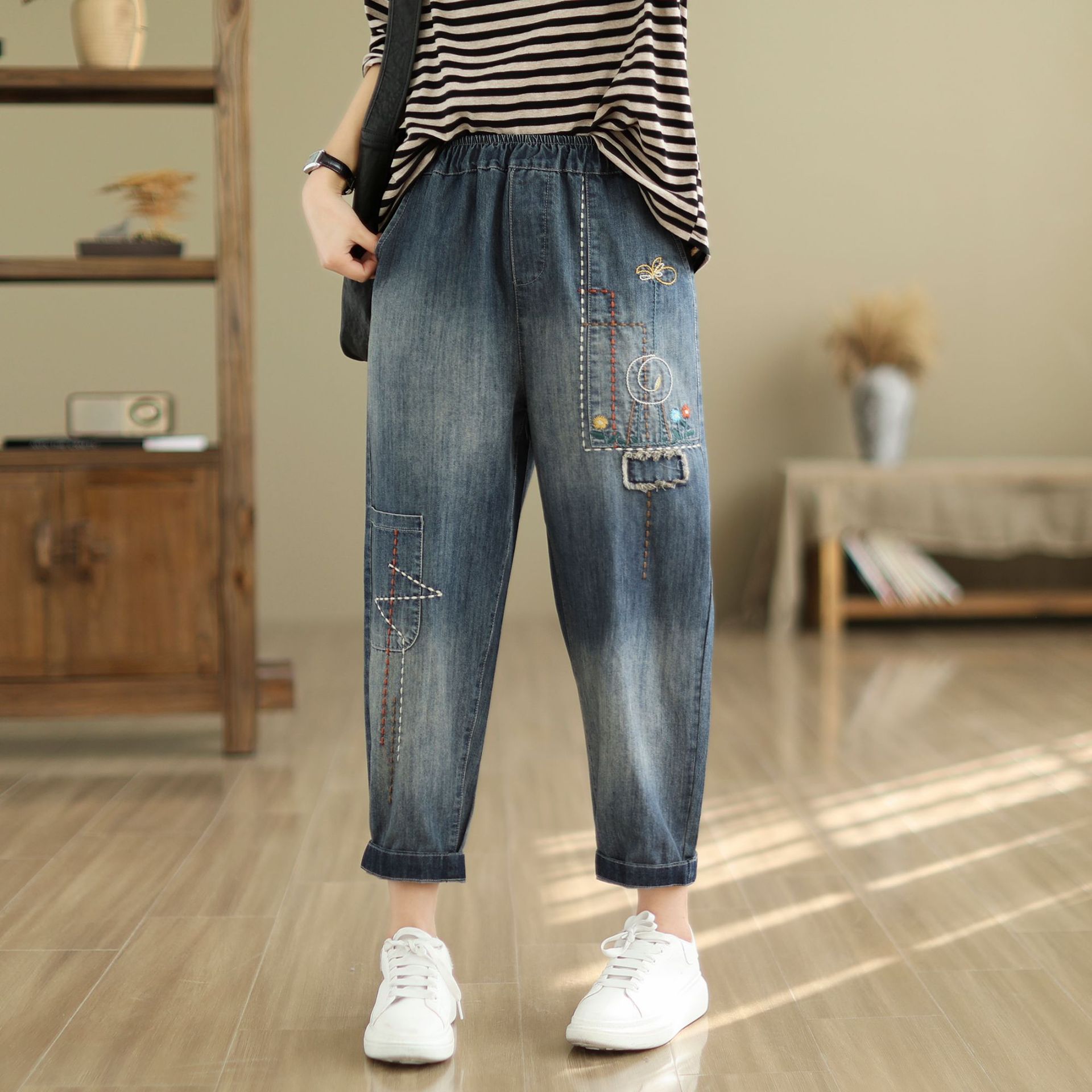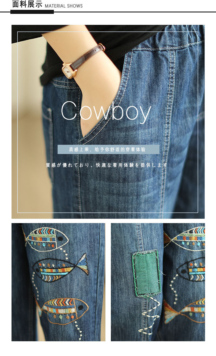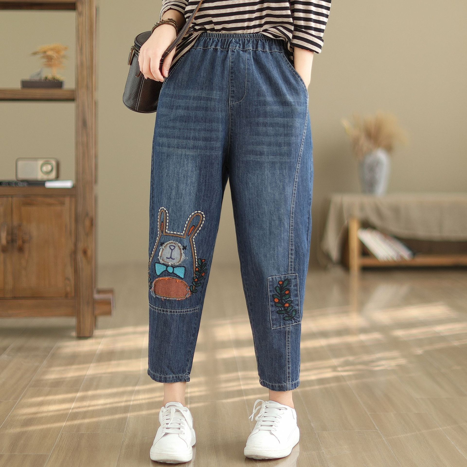 봄과 여름 새로운 캐주얼 Harlan Torre 바지 여성 자수 고양이 예술적 여성 8 점 바지 느슨한 대형 청바지 여성