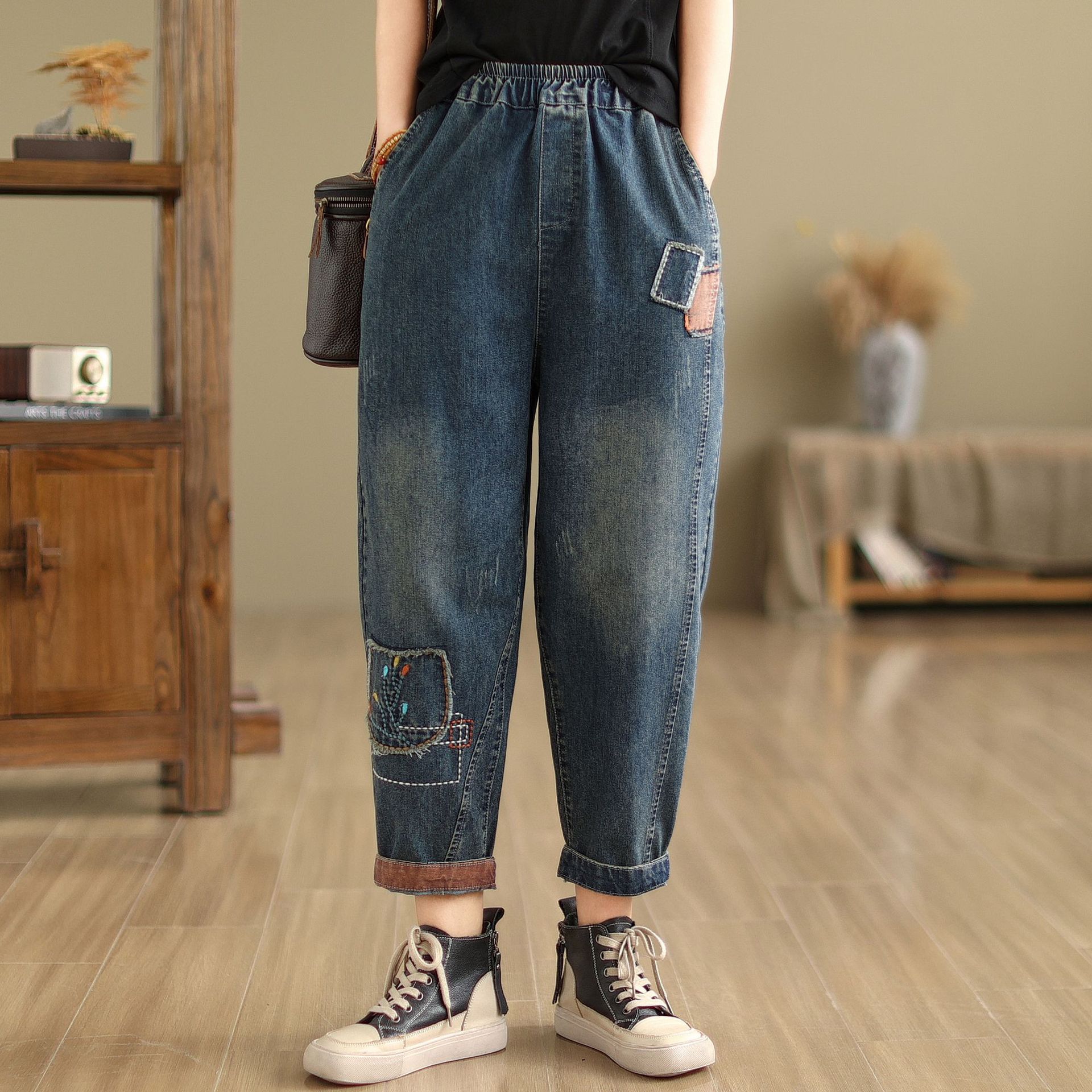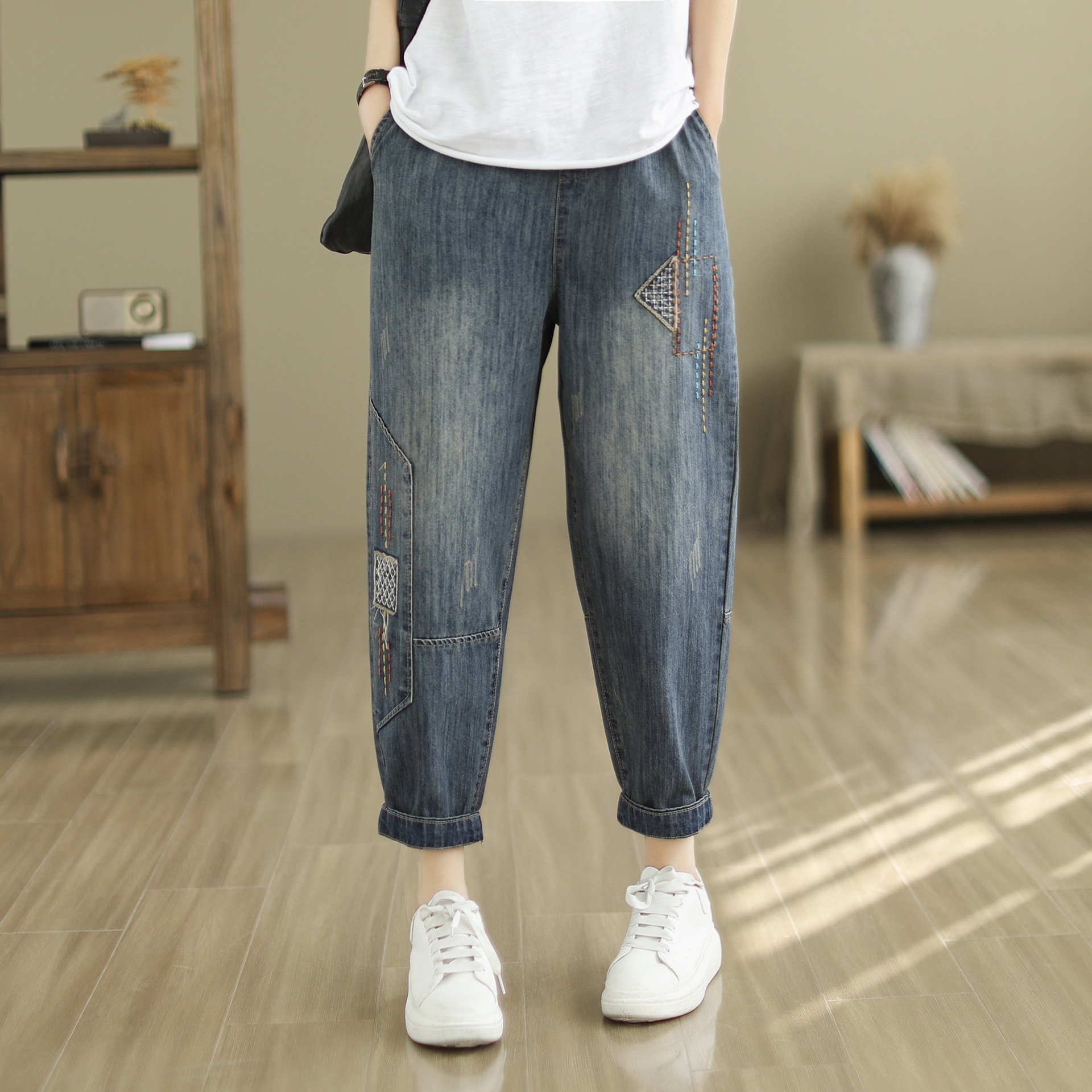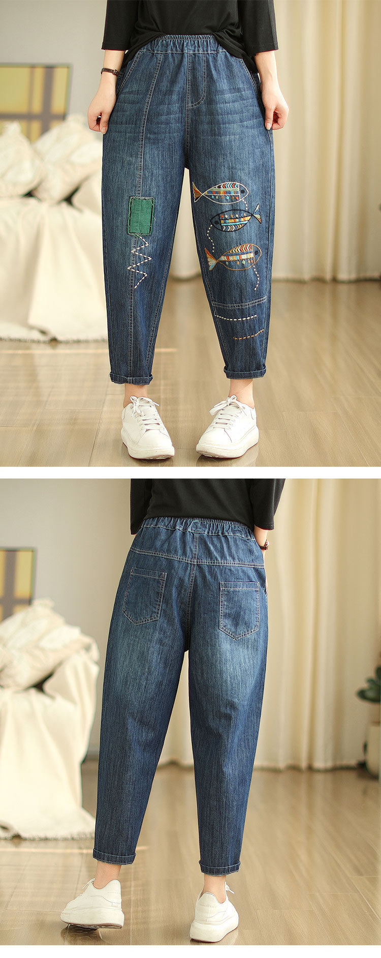 봄과 여름 새로운 캐주얼 Harlan Torre 바지 여성 자수 고양이 예술적 여성 8 점 바지 느슨한 대형 청바지 여성