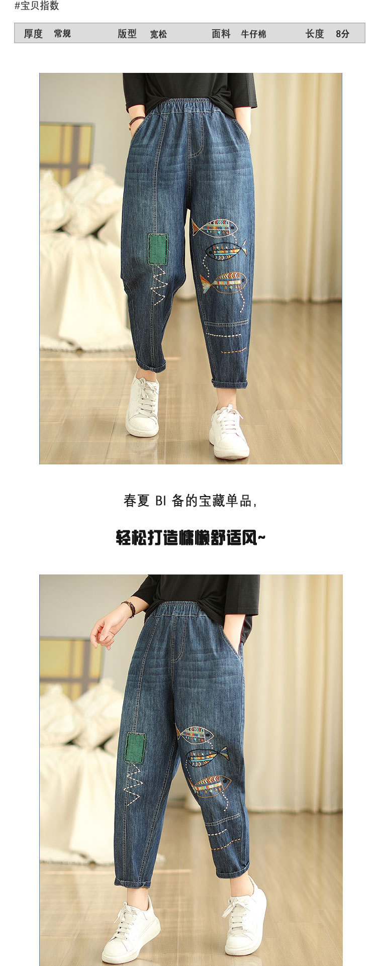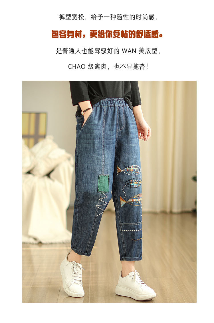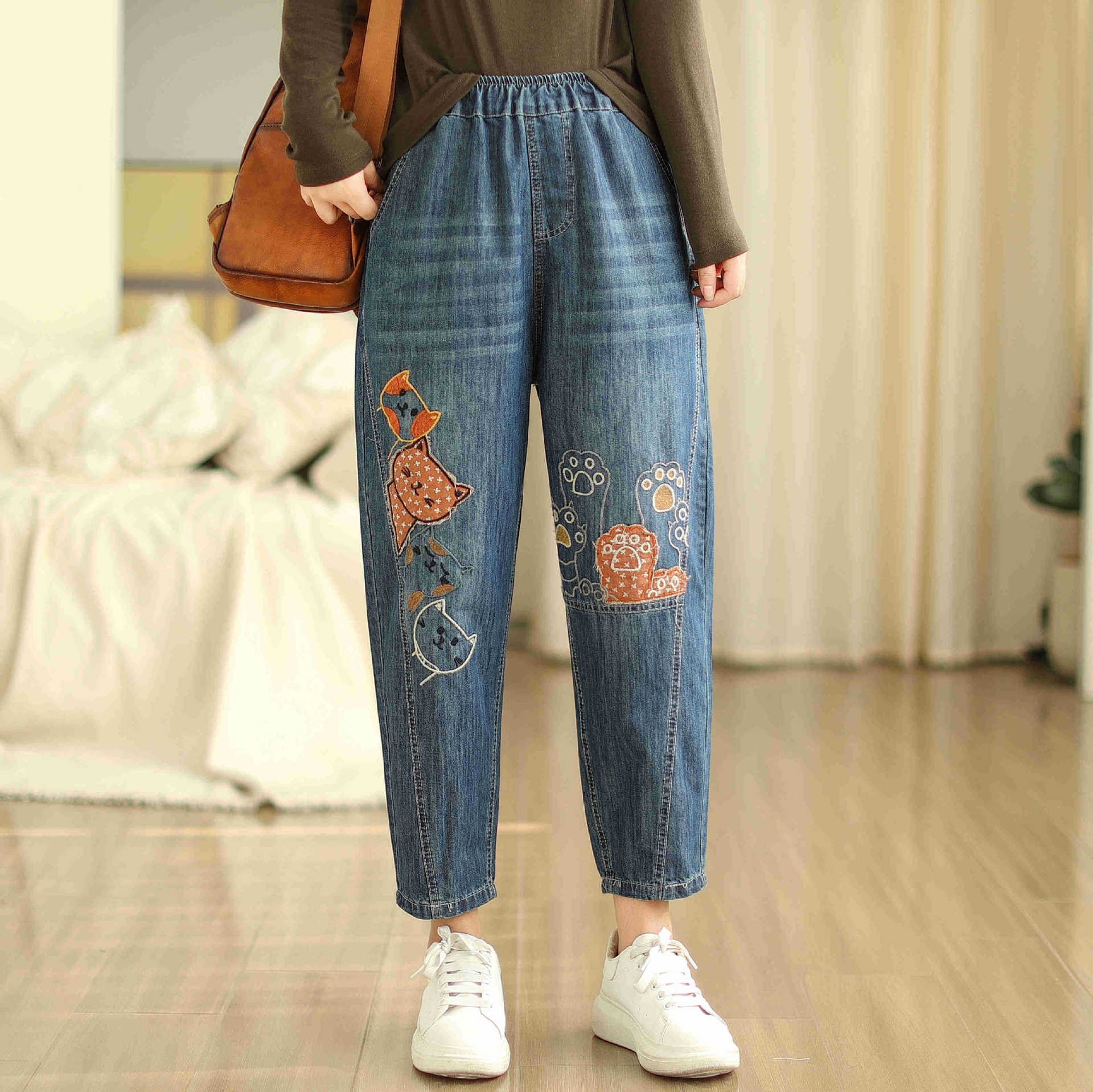 봄과 여름 새로운 캐주얼 Harlan Torre 바지 여성 자수 고양이 예술적 여성 8 점 바지 느슨한 대형 청바지 여성스토어 가기