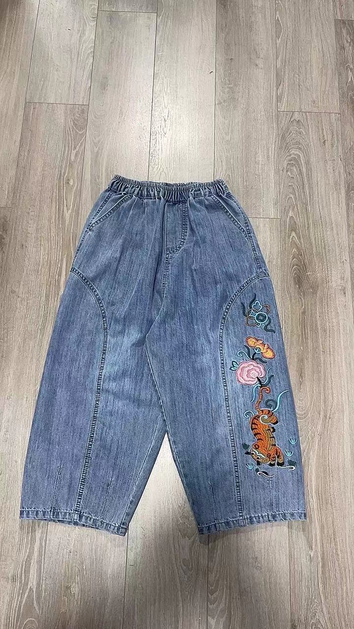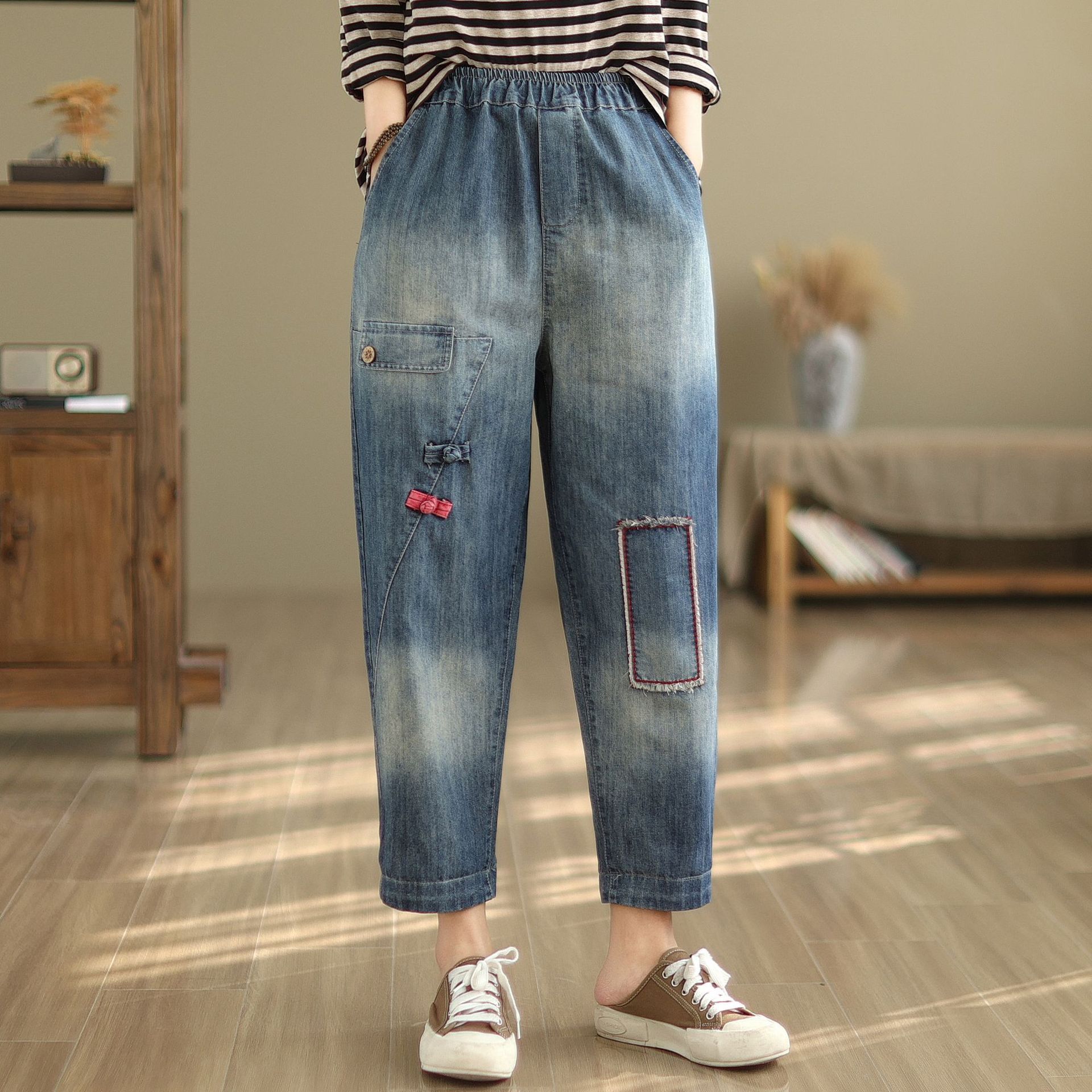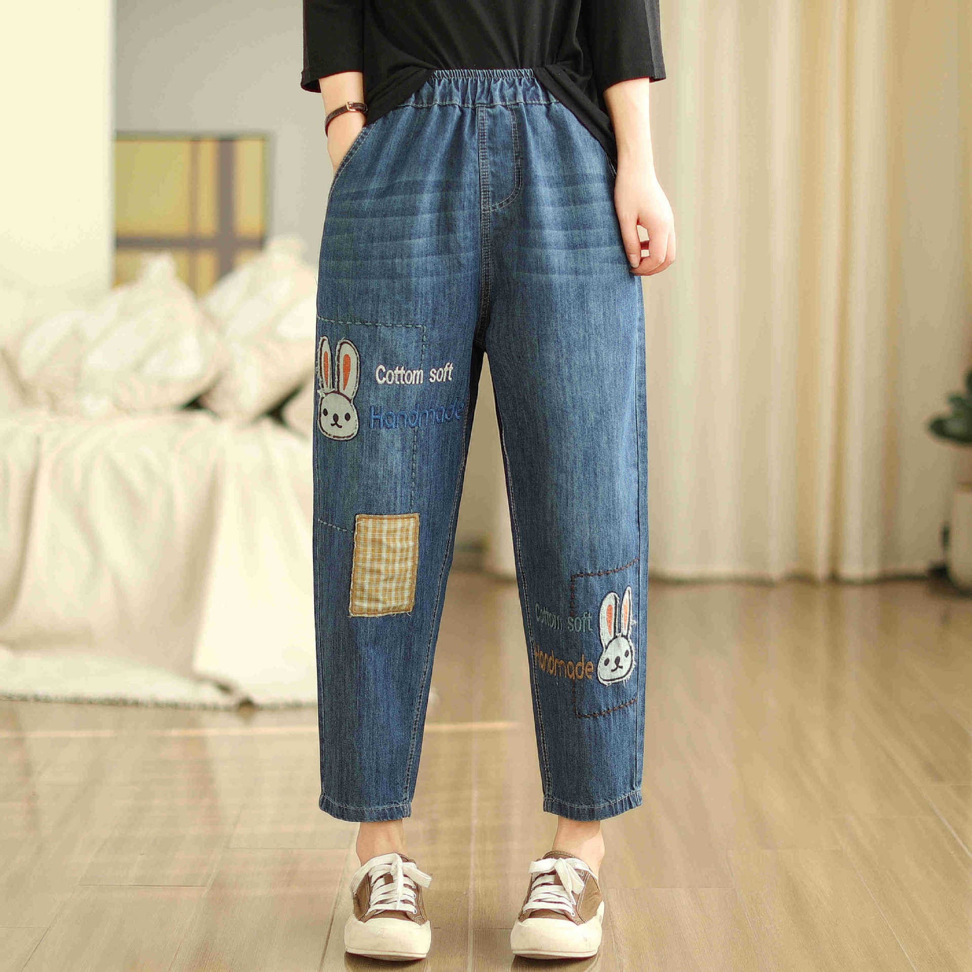 봄과 여름 새로운 캐주얼 Harlan Torre 바지 여성 자수 고양이 예술적 여성 8 점 바지 느슨한 대형 청바지 여성스토어 가기