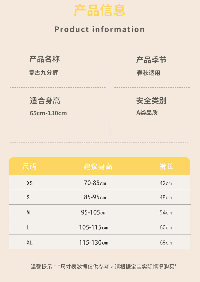 • XS (바지 길이 42cm, 권장 70-85cm,6-12 개월)