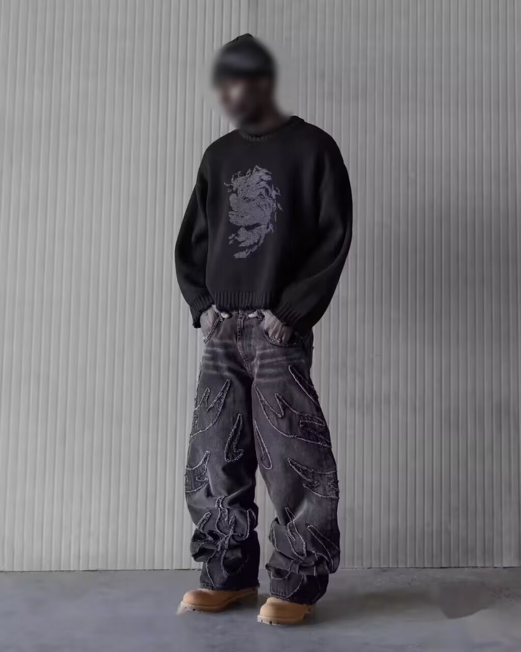아메리칸 스타일 하라주쿠 빈티지 박쥐 패턴 자수 헐렁한 청바지 남성 스트리트 패션 바지 게으른 청바지