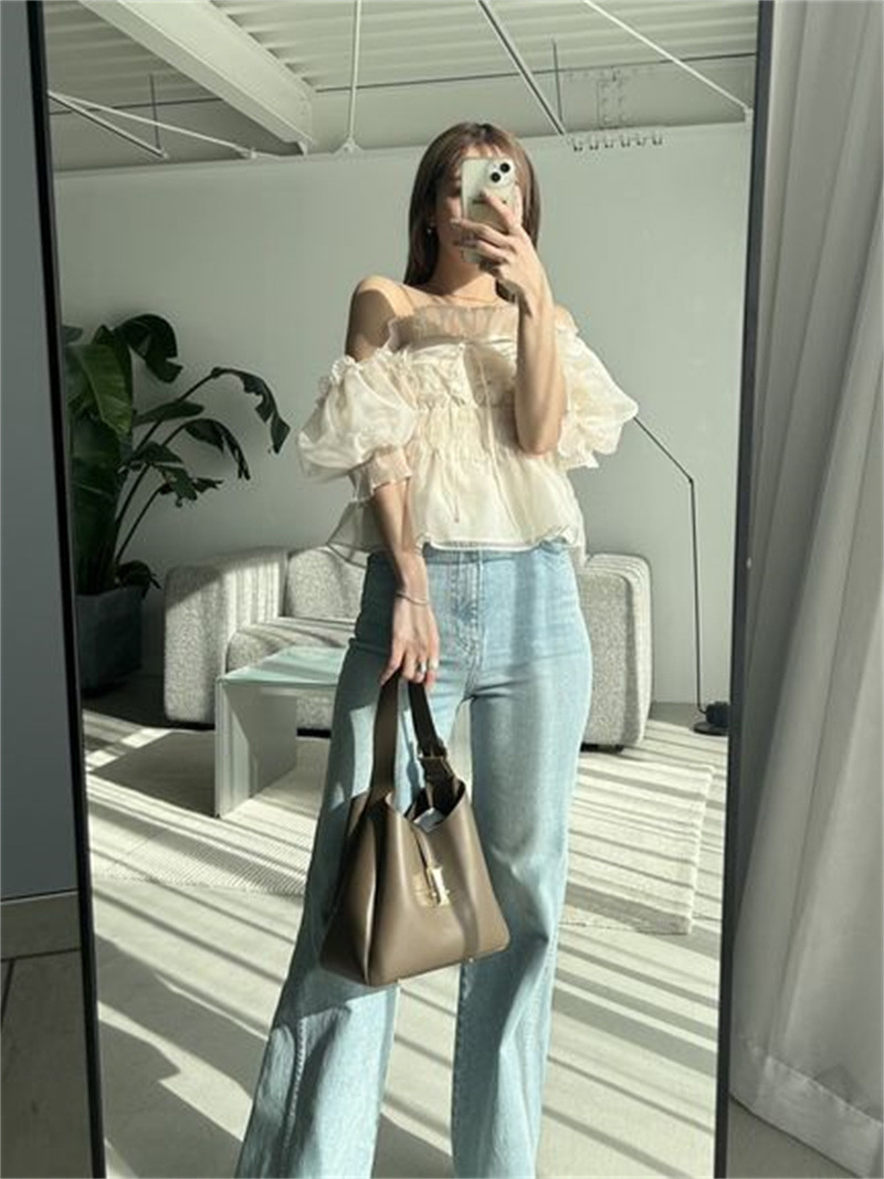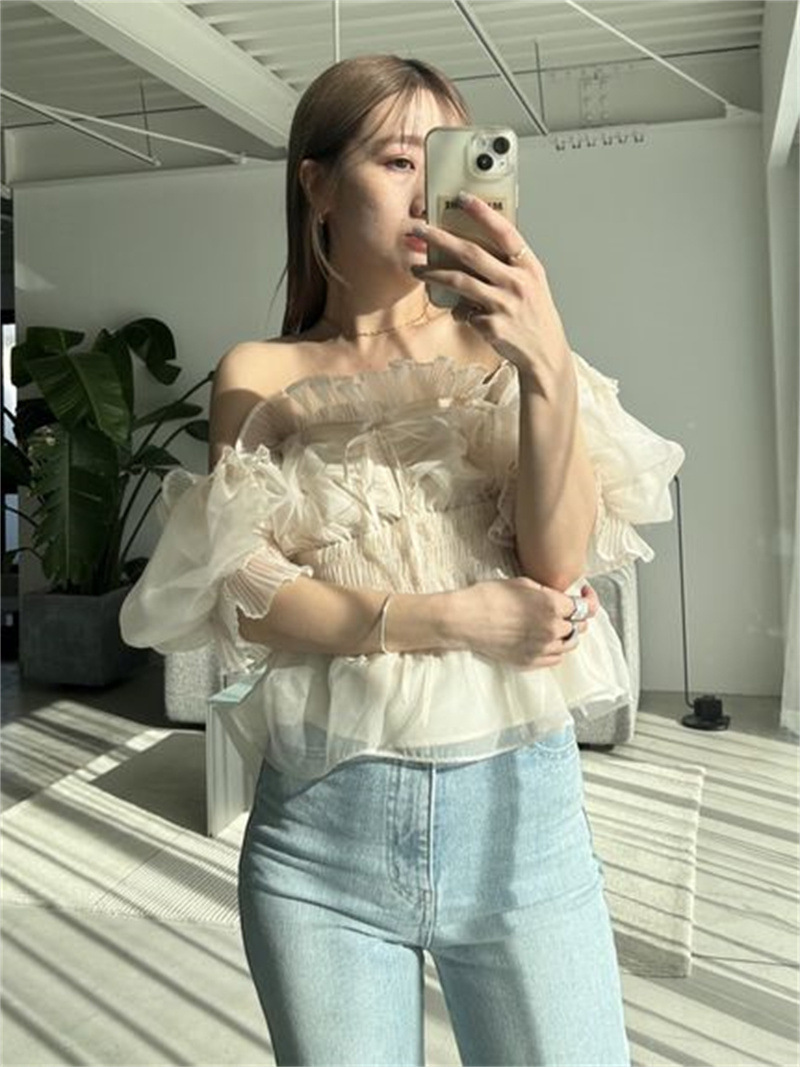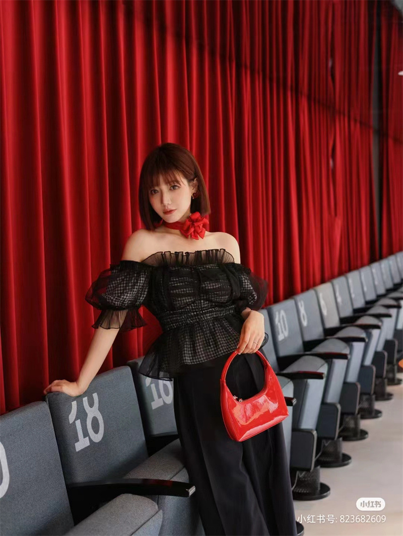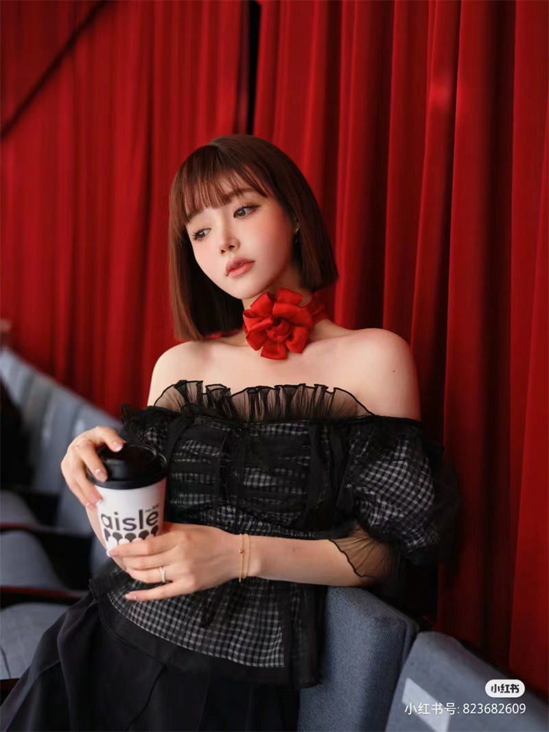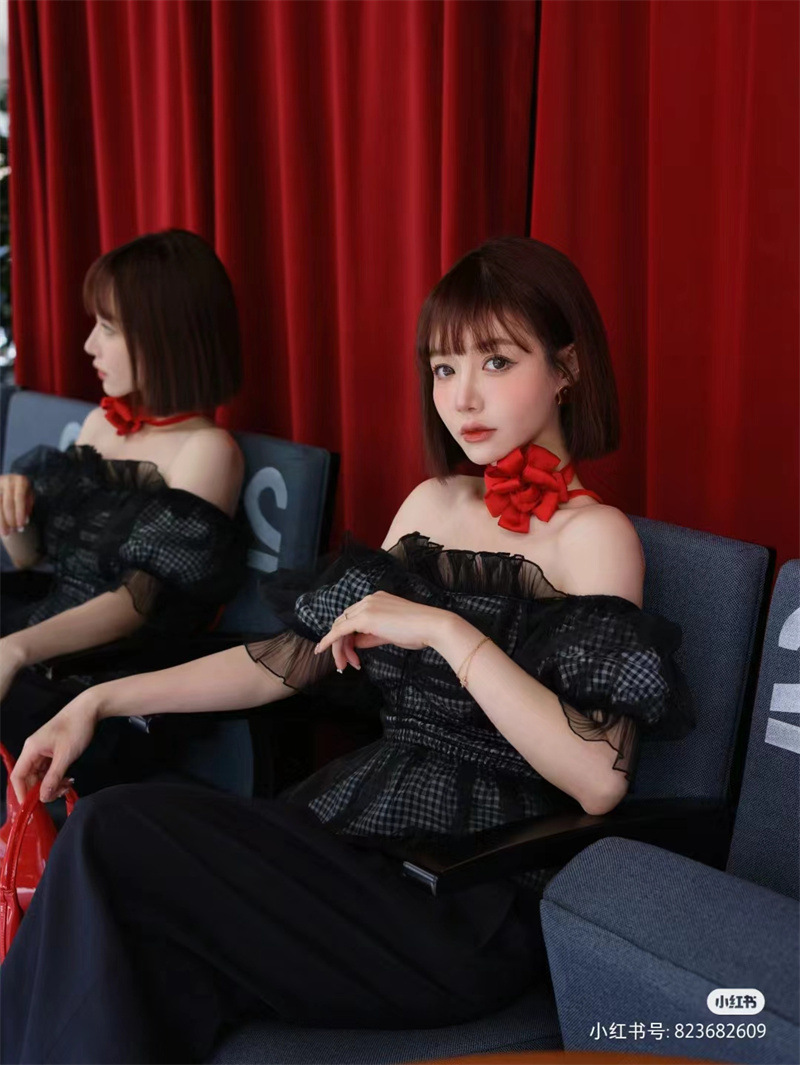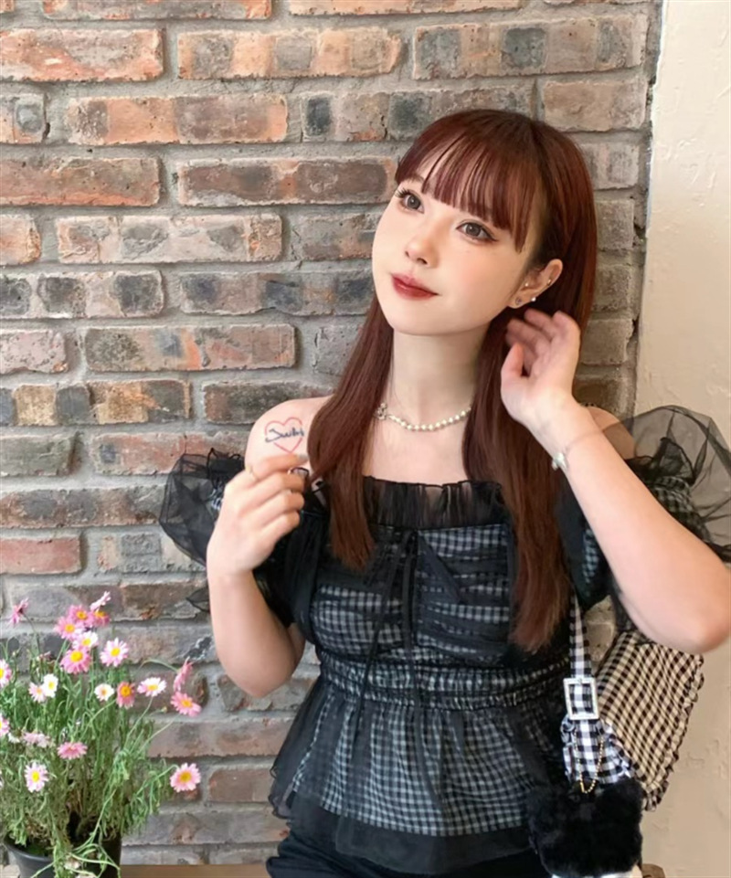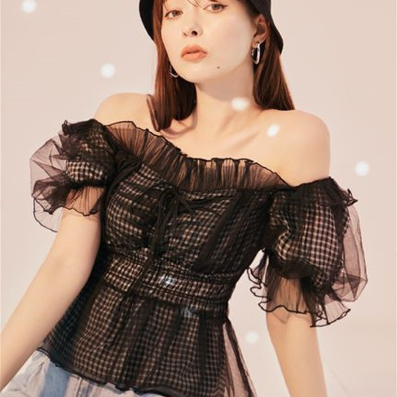 WZFS24009 이른 봄 일본의 새로운 달콤한 활 레이스 업 오프 숄더 체크 무늬 나무 귀 쉬폰 셔츠스토어 가기