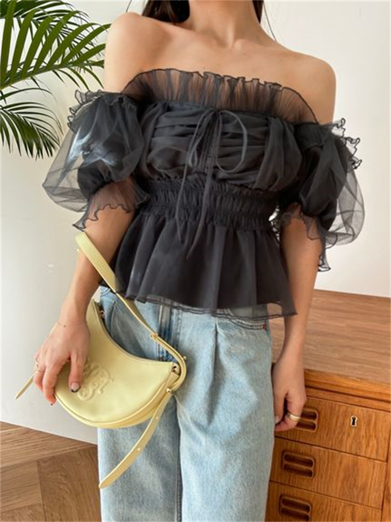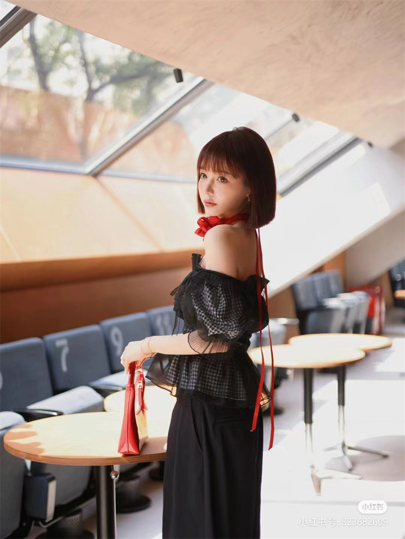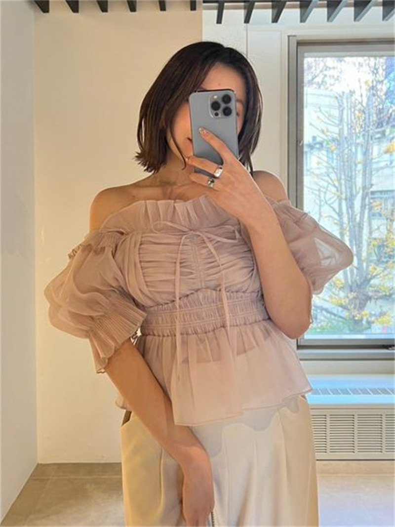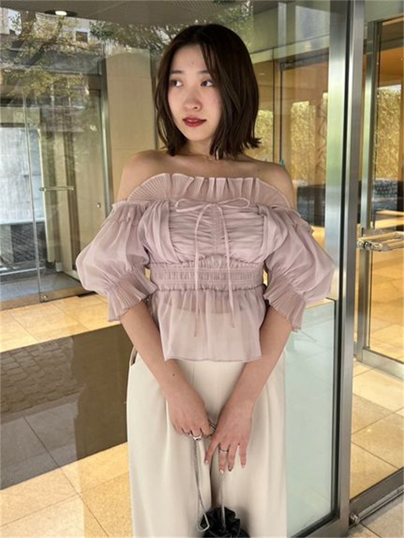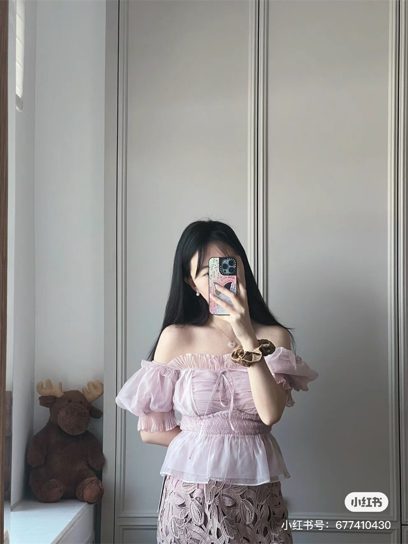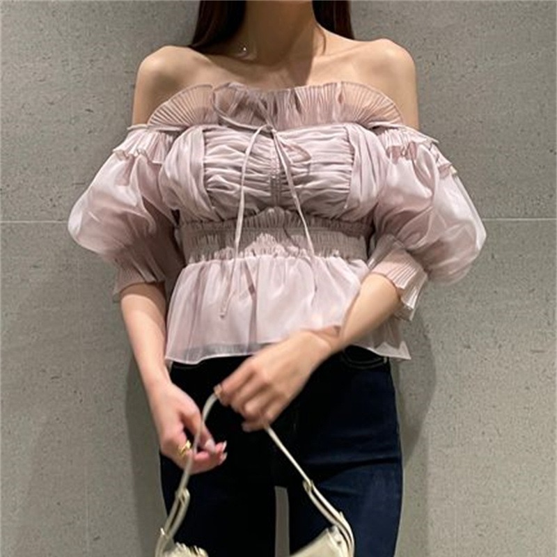 WZFS24009 이른 봄 일본의 새로운 달콤한 활 레이스 업 오프 숄더 체크 무늬 나무 귀 쉬폰 셔츠스토어 가기