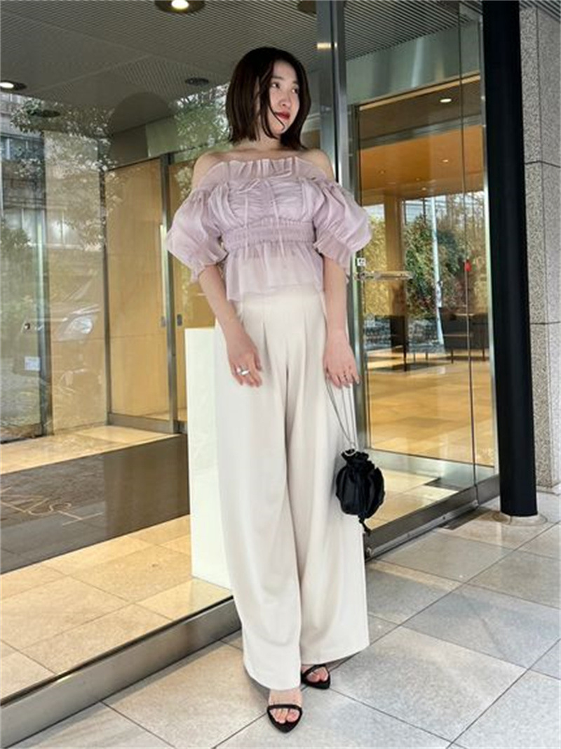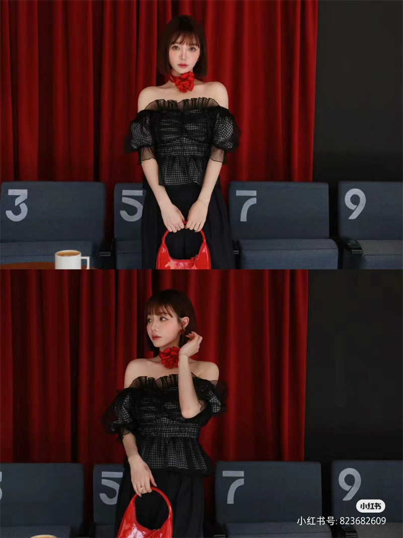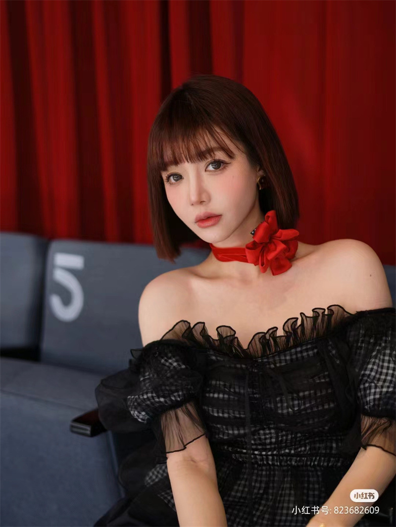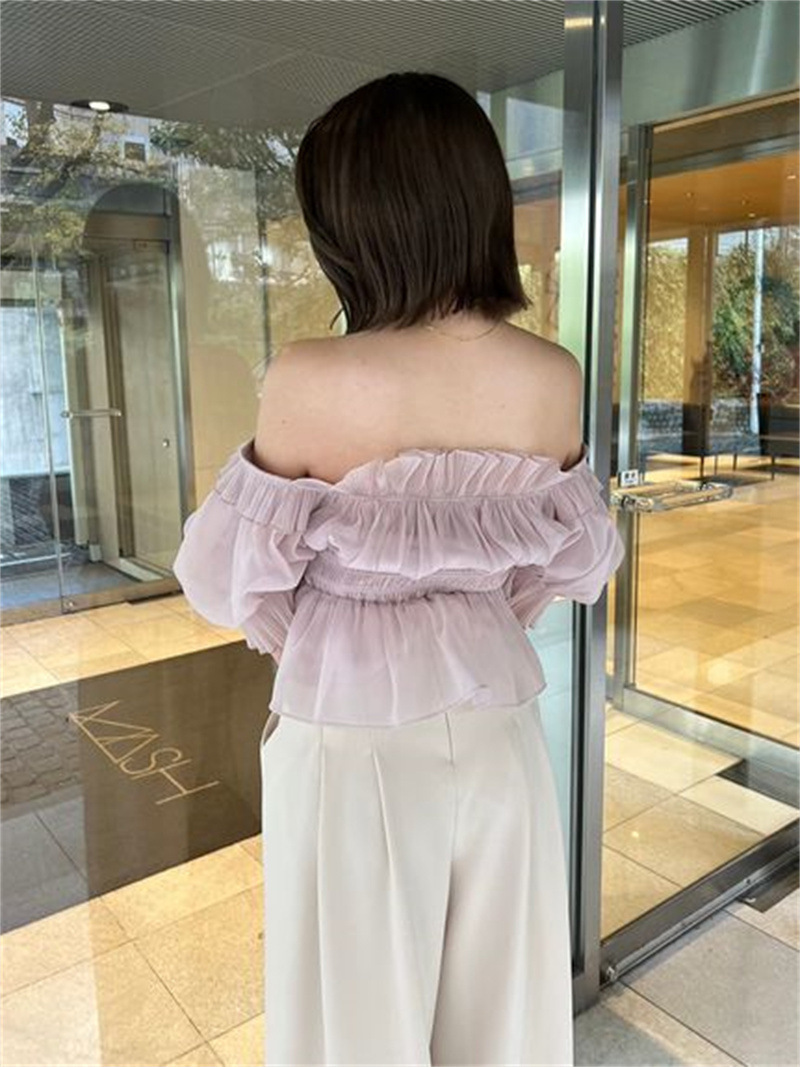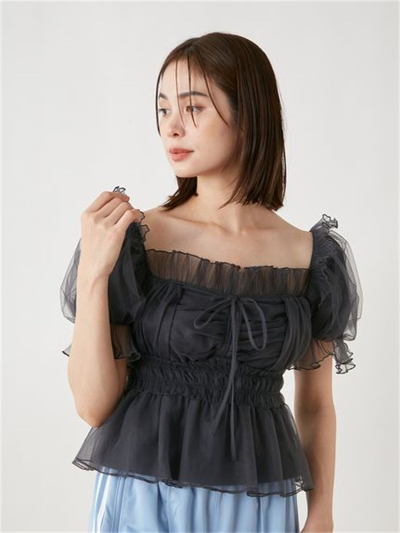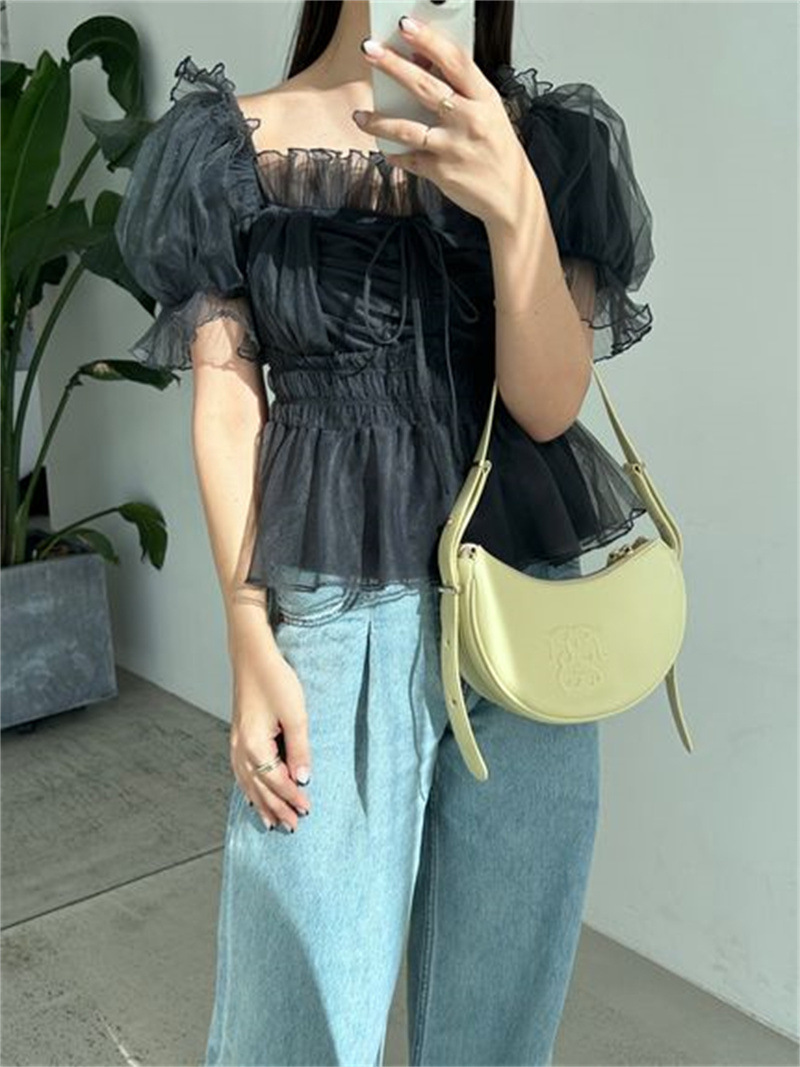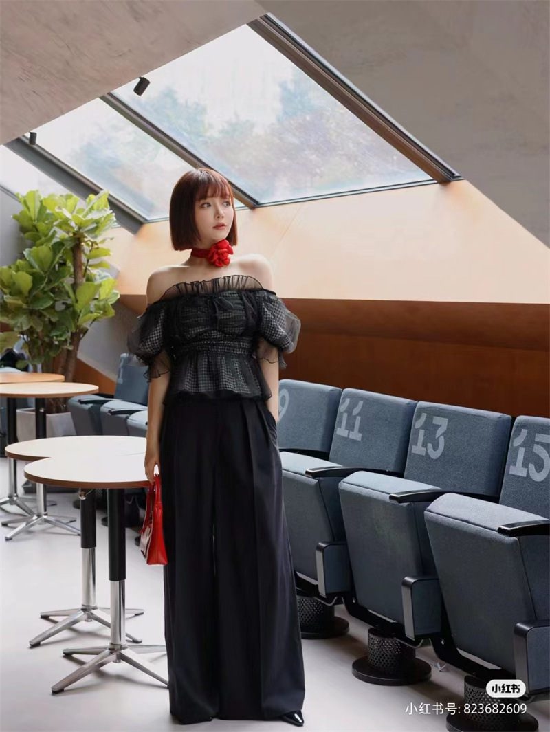 WZFS24009 이른 봄 일본의 새로운 달콤한 활 레이스 업 오프 숄더 체크 무늬 나무 귀 쉬폰 셔츠스토어 가기