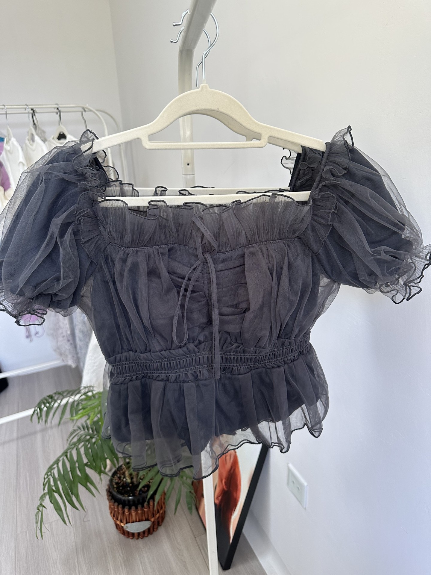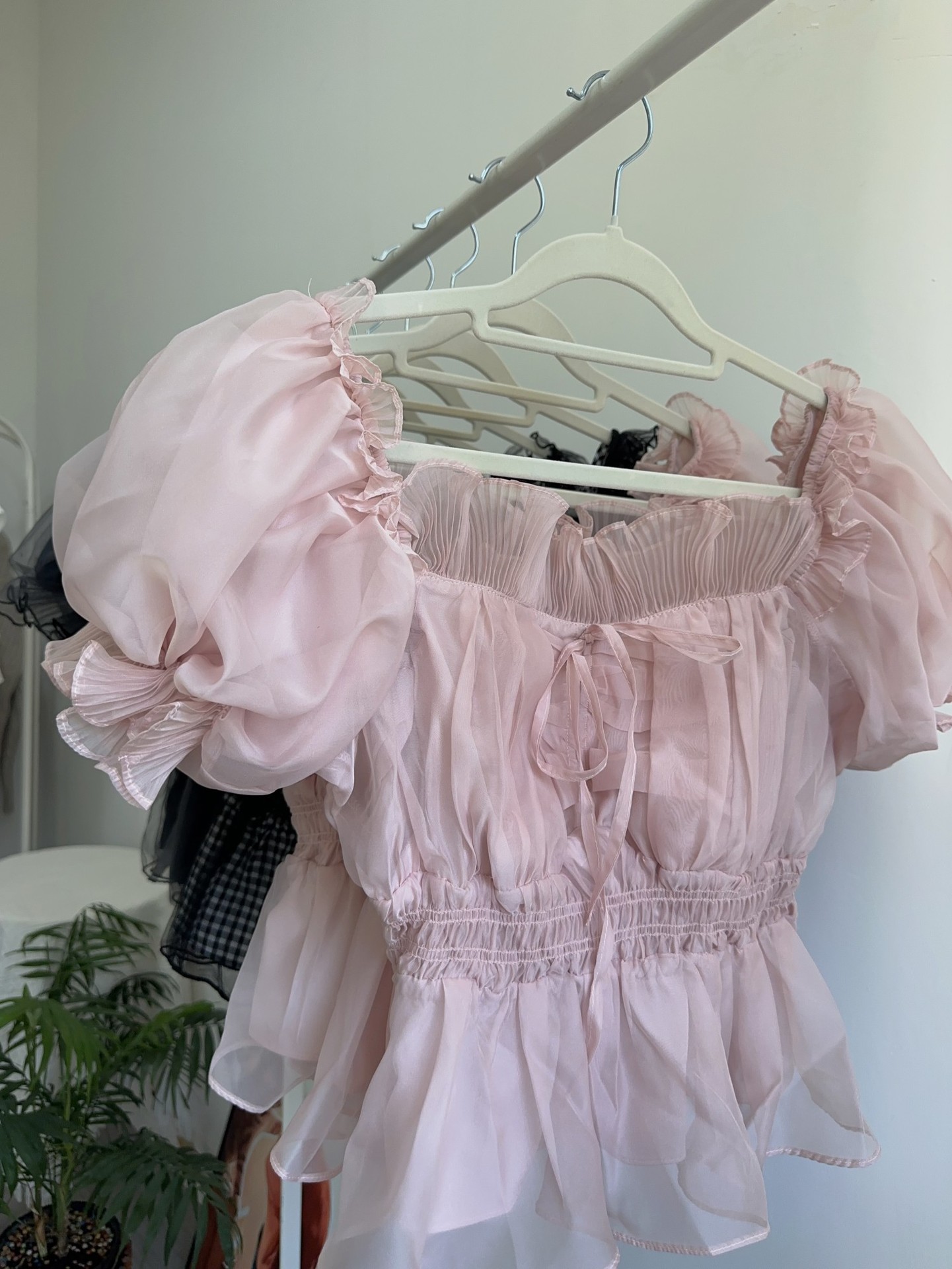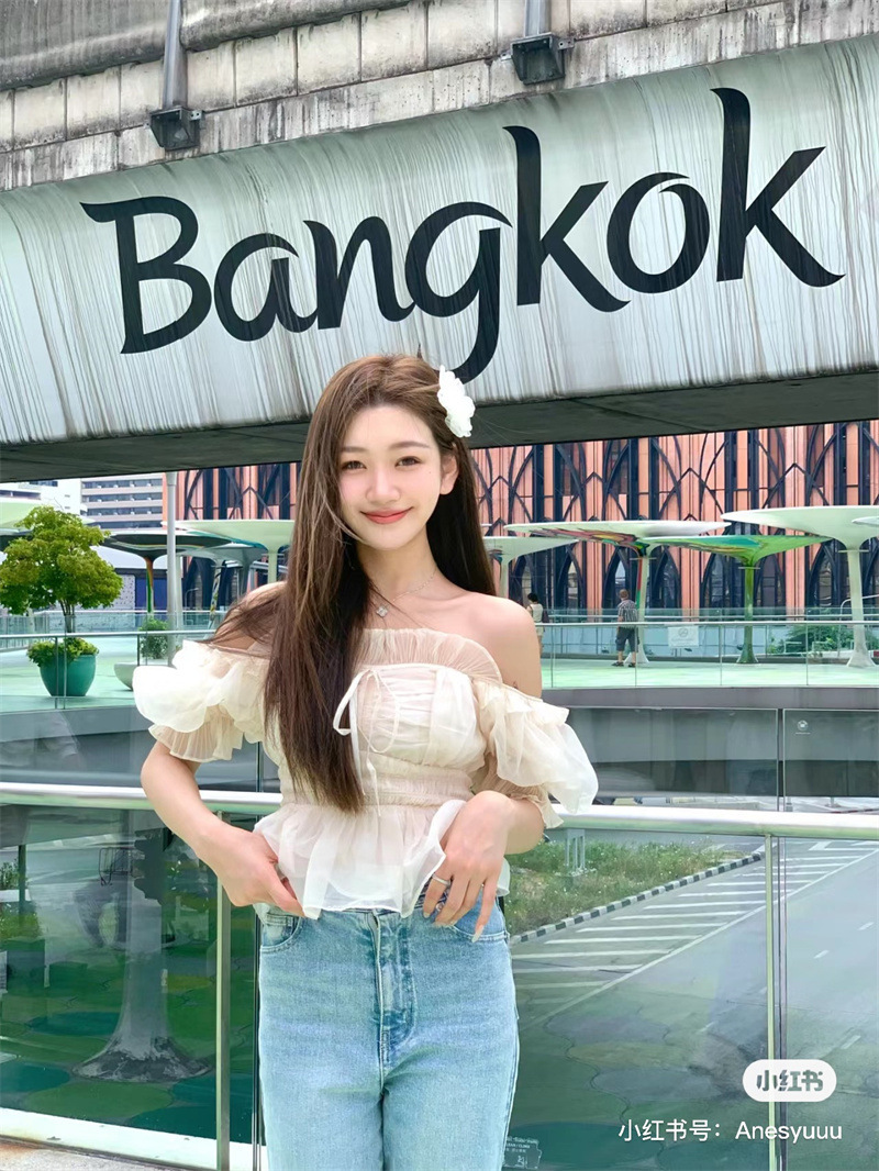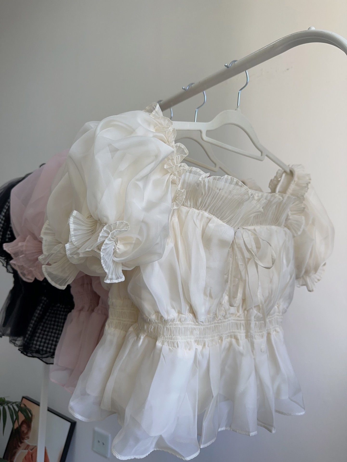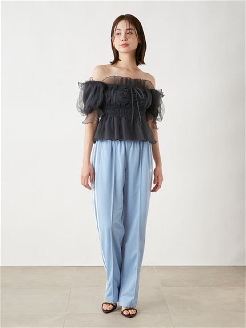 WZFS24009 이른 봄 일본의 새로운 달콤한 활 레이스 업 오프 숄더 체크 무늬 나무 귀 쉬폰 셔츠스토어 가기