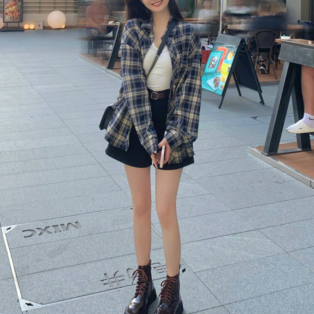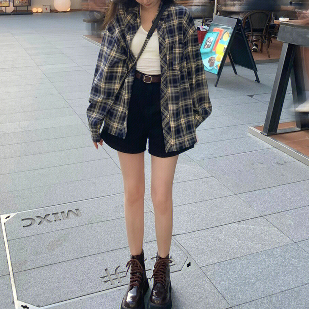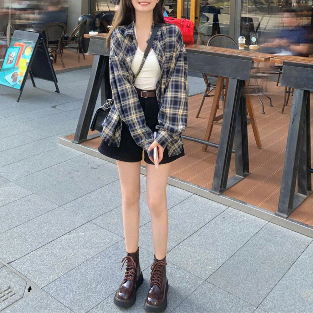 Miao Anna 봄과 여름 새로운 홍콩 스타일 빈티지 격자 무늬 셔츠 여성의 세련된 최고 여성의 선 스크린 셔츠스토어 가기