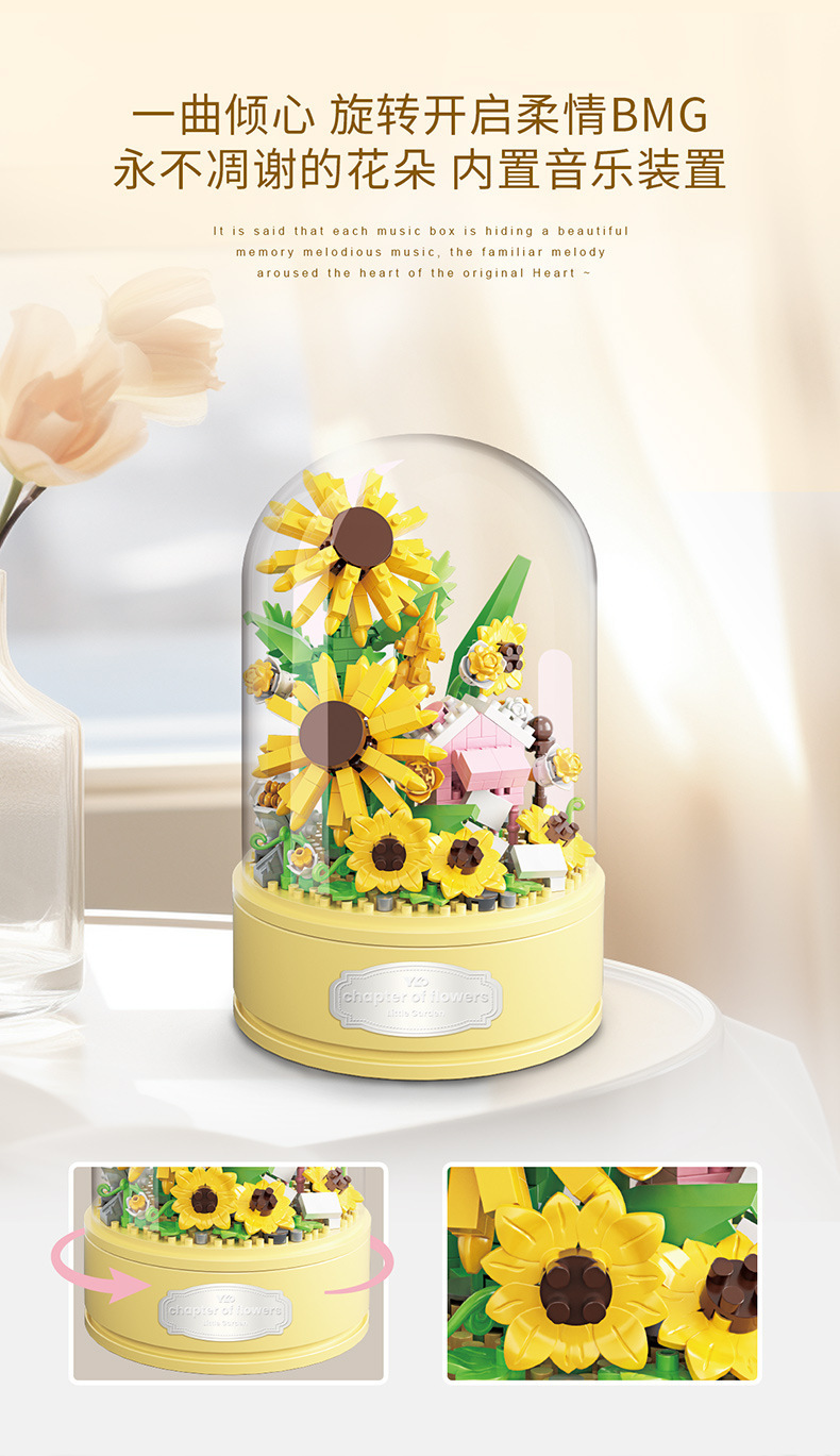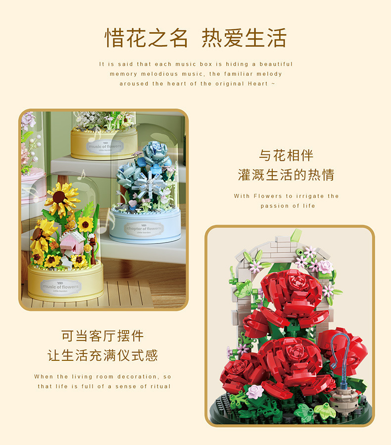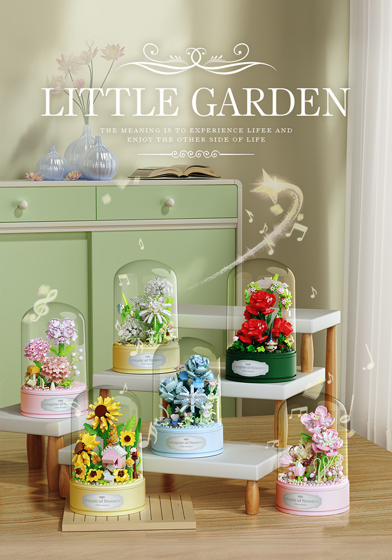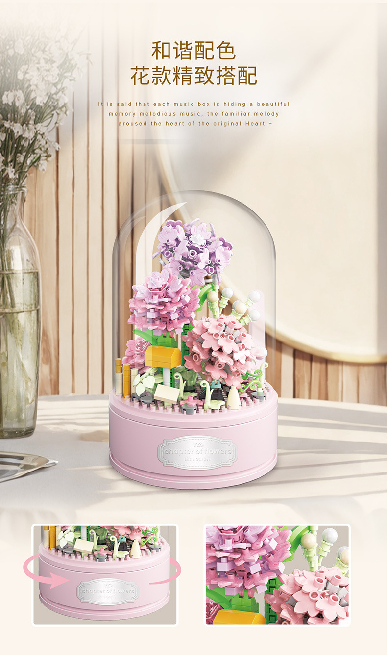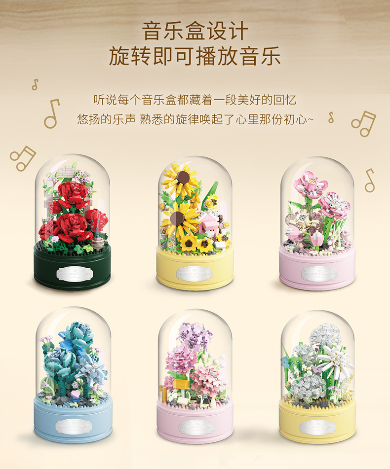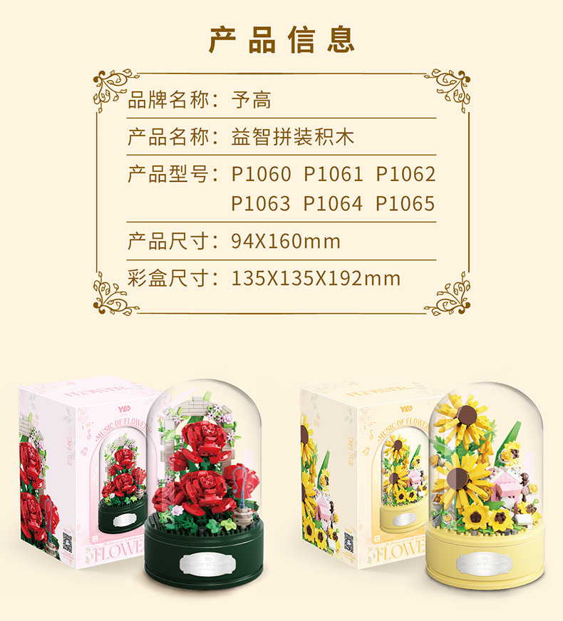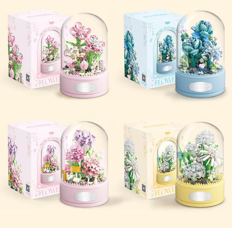 유가오 P1060-1065 꽃 음악 상자 시리즈 마이크로 입자 영원한 빌딩 블록 꽃 장난감 데스크탑 장식 도매스토어 가기