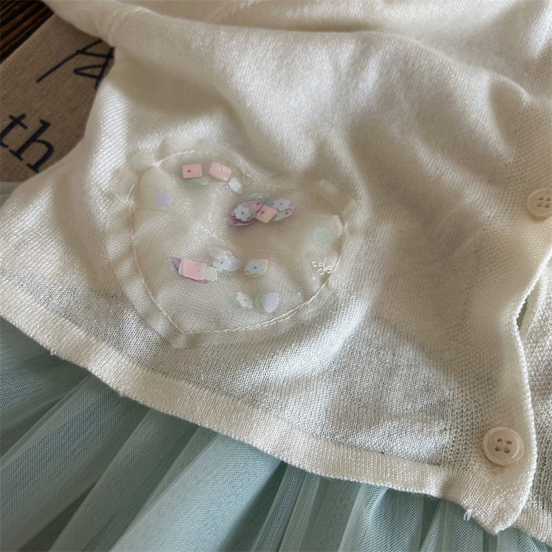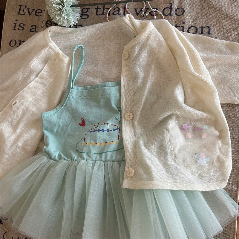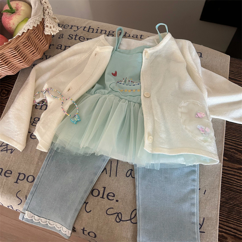 재고정리, 반품교환 불가【합리적인 주문】여아용 메쉬 슬립탑+니트 가디건+데님 팬츠