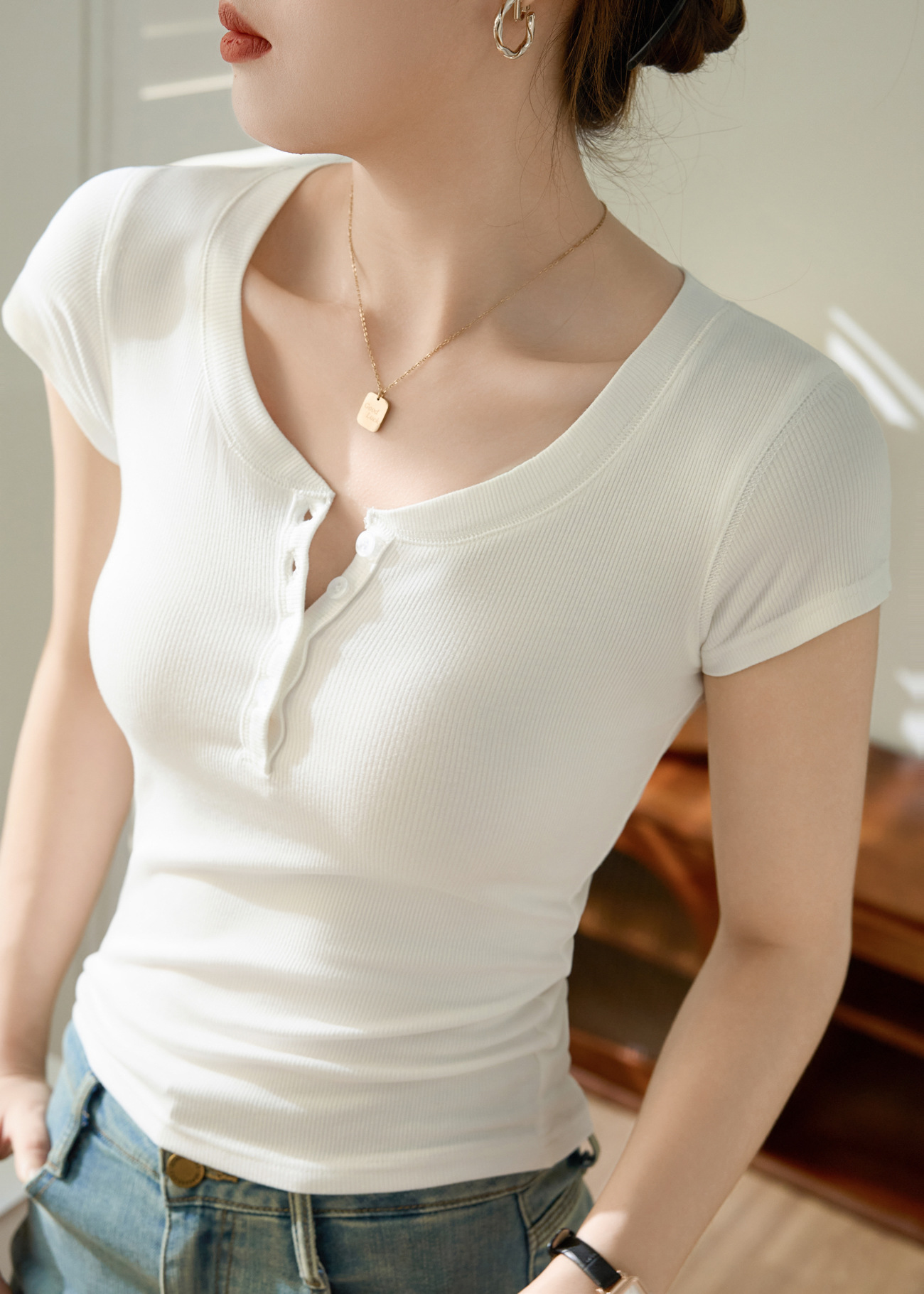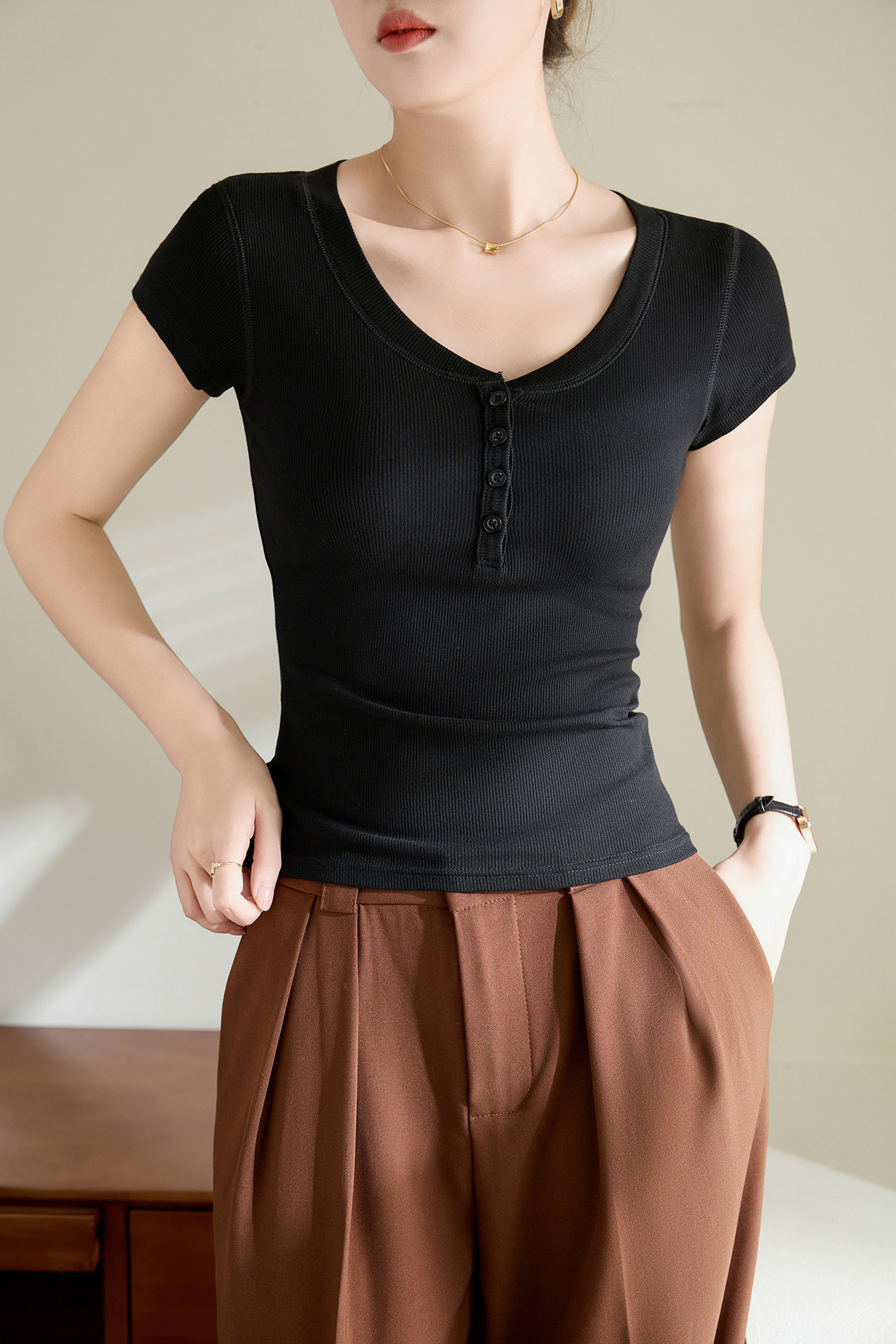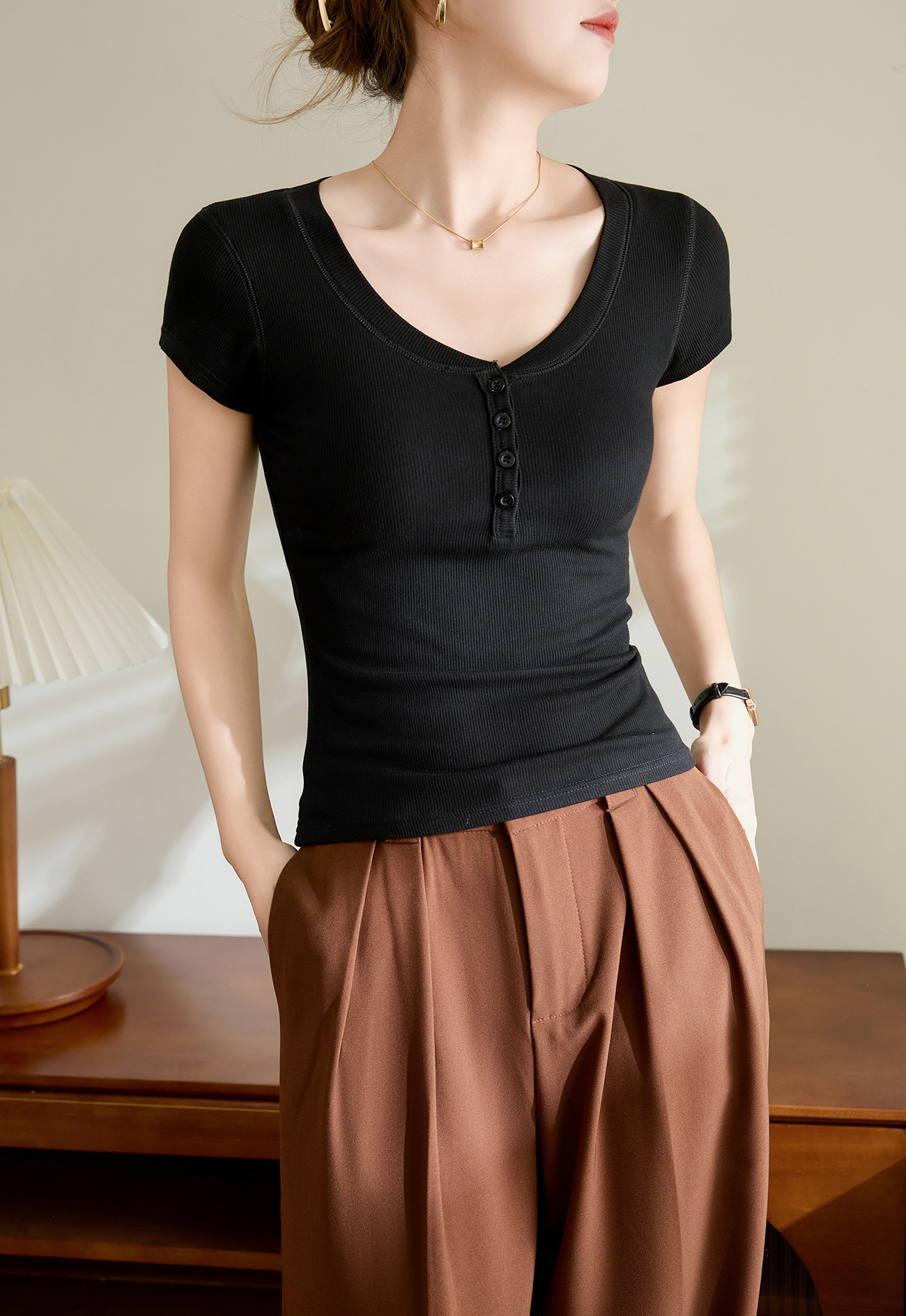 【좋은 소재 사용】고탄성 립스판 코튼 V넥 버튼 반팔 티셔츠 여성 여름 2026 신상 슬림핏 슬리밍 이너웨어