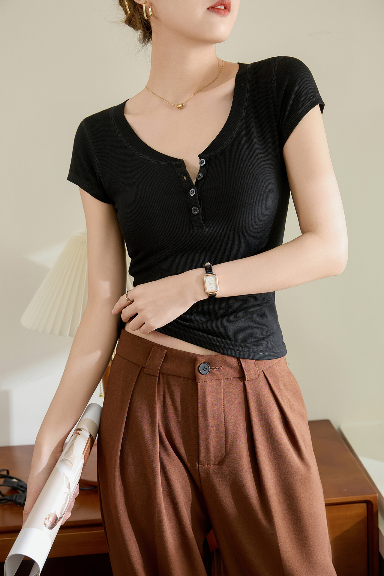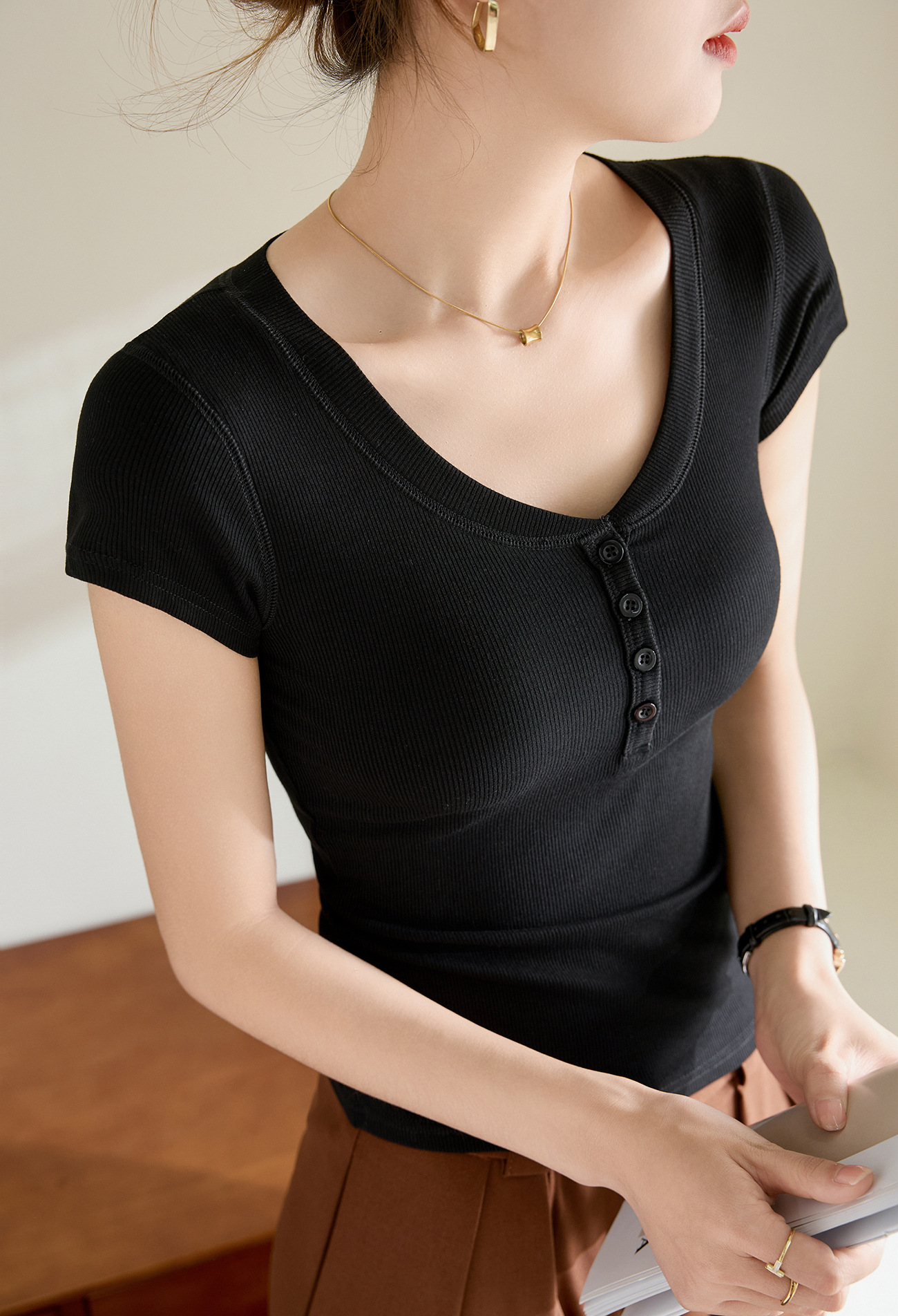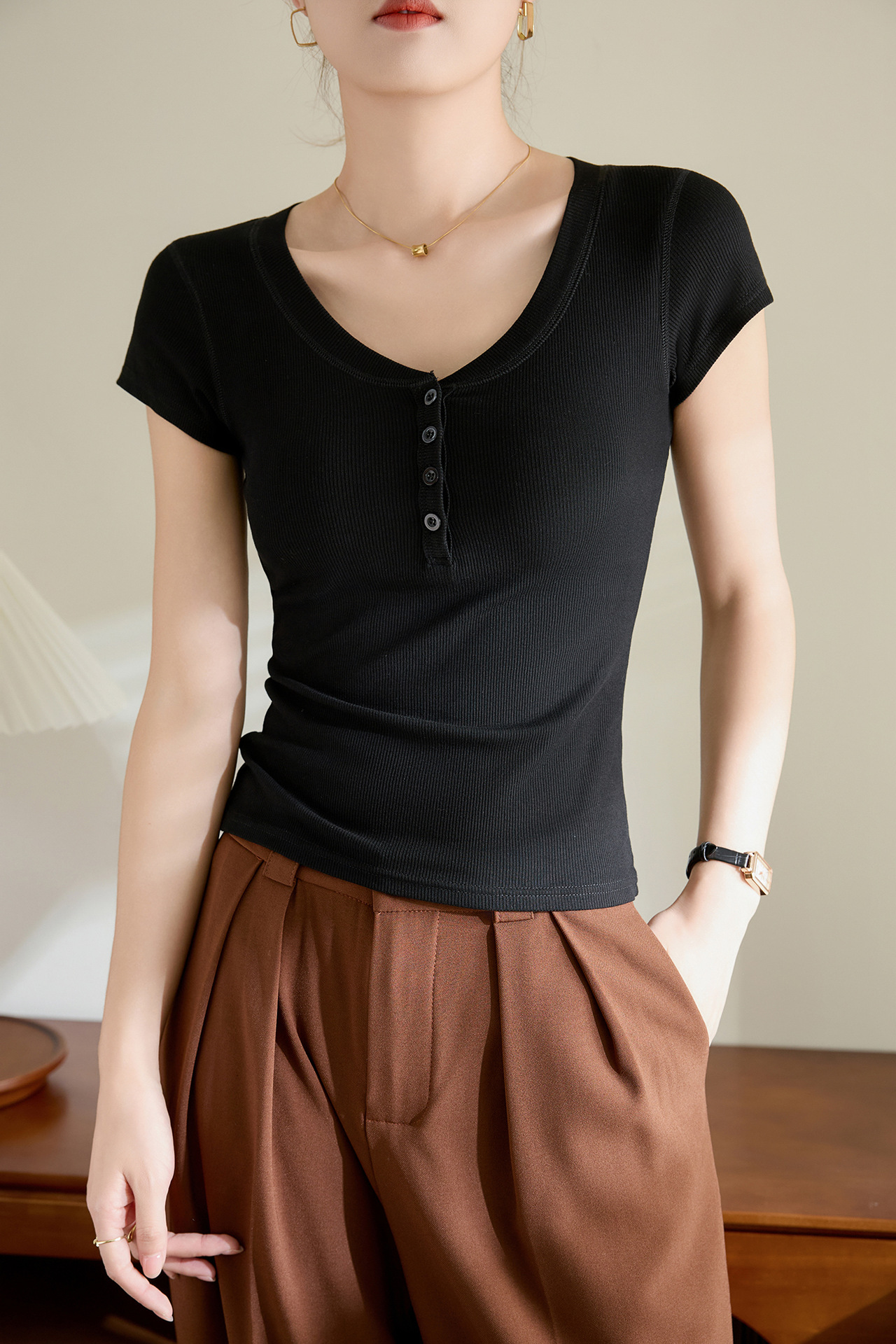 【좋은 소재 사용】고탄성 립스판 코튼 V넥 버튼 반팔 티셔츠 여성 여름 2026 신상 슬림핏 슬리밍 이너웨어