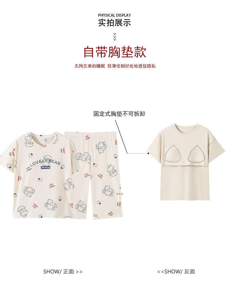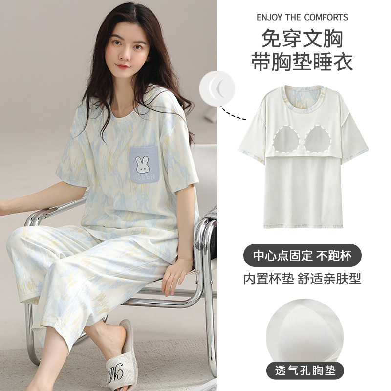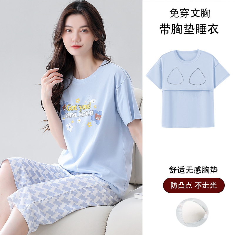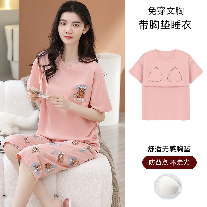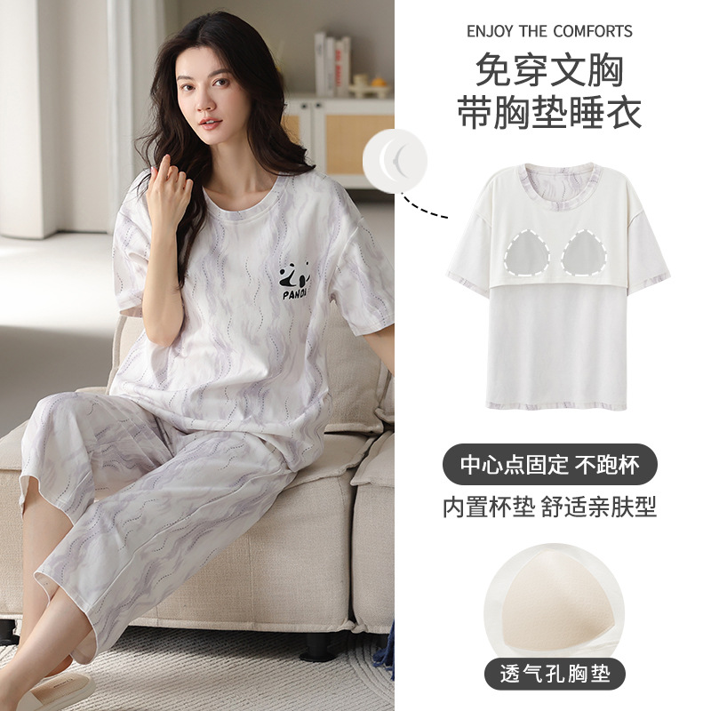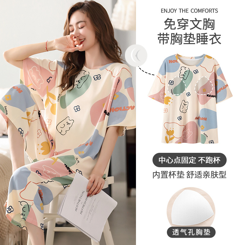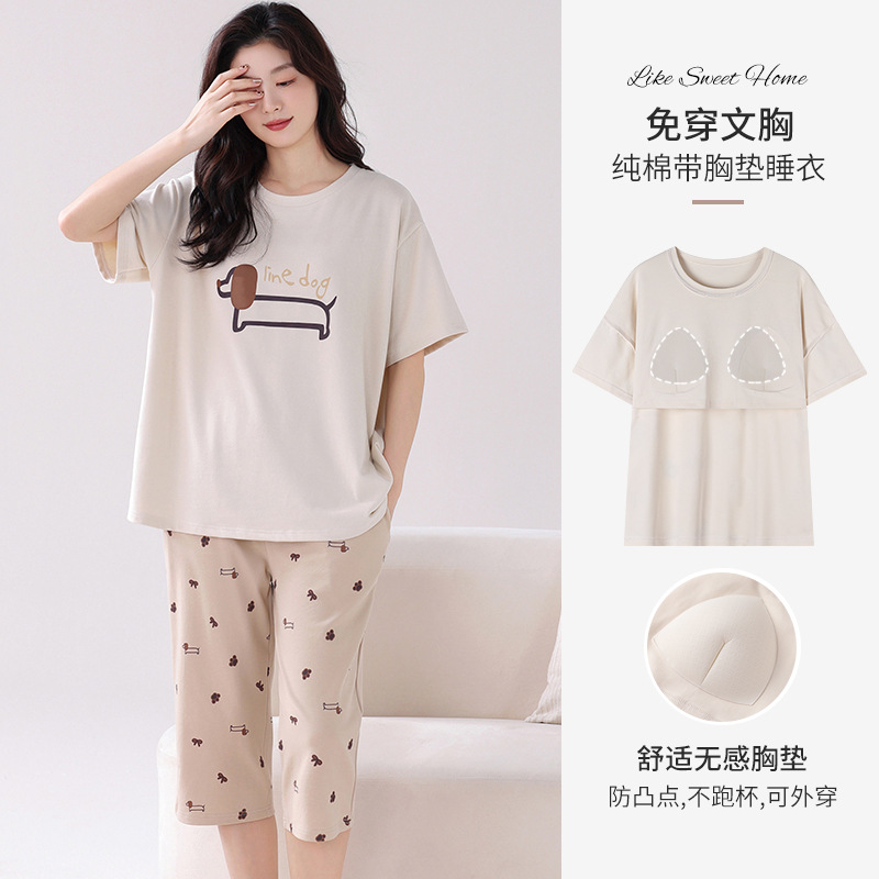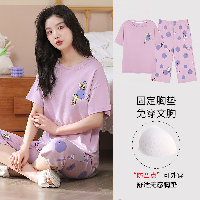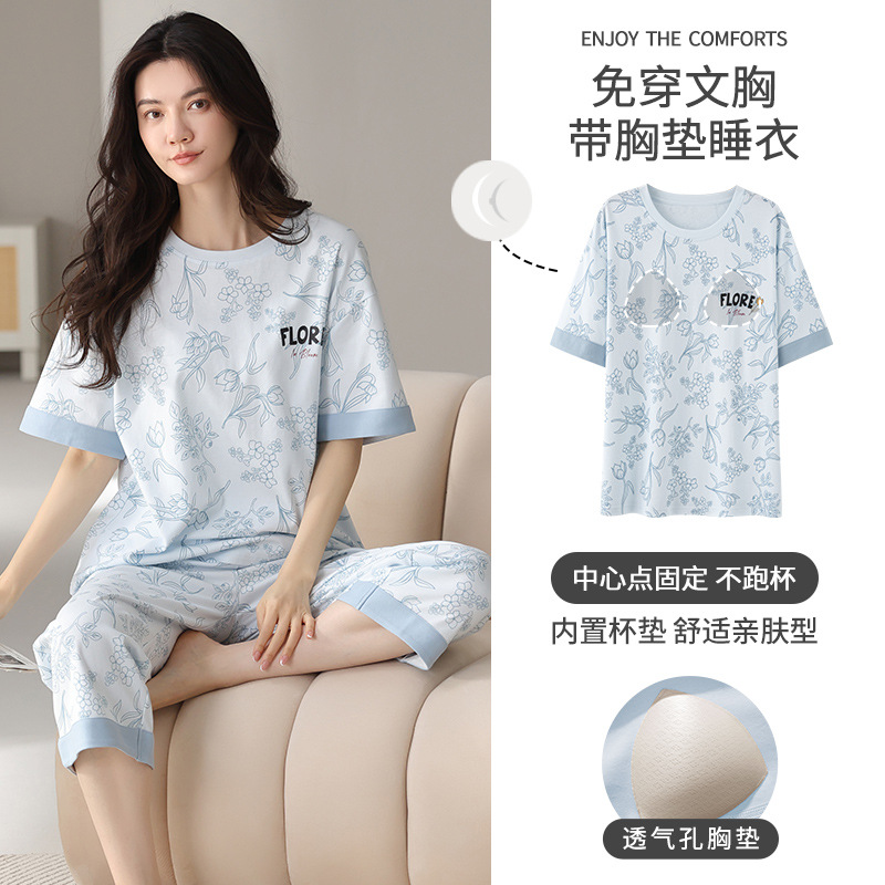 가슴 패드가 있는 여성용 100% 면 잠옷, 순면 여름용 얇은 라운드넥 반팔 7부 바지, 여름철 외출복으로도 착용 가능한 홈웨어스토어 가기