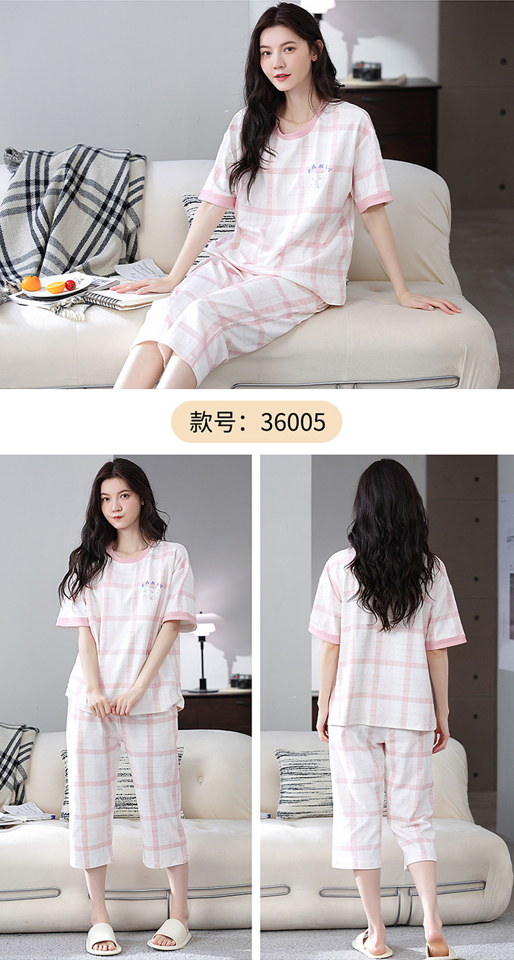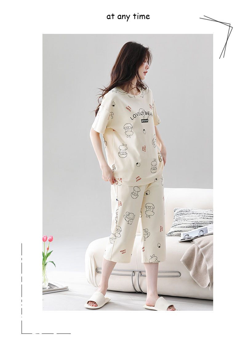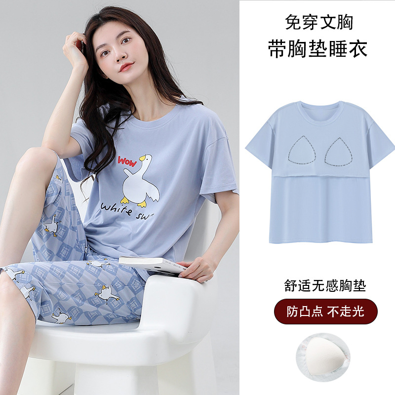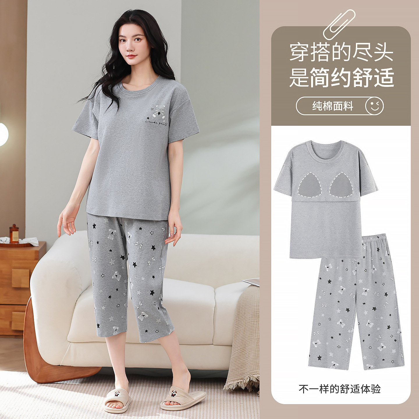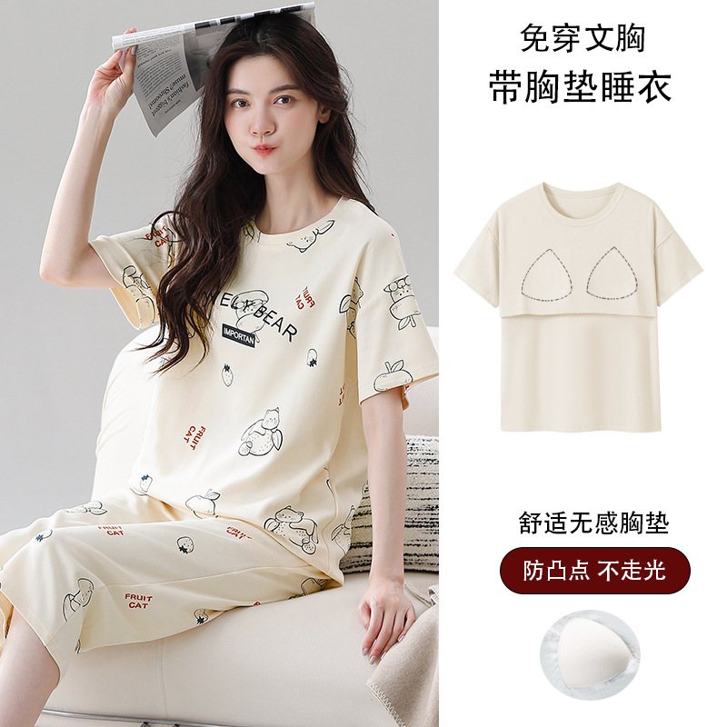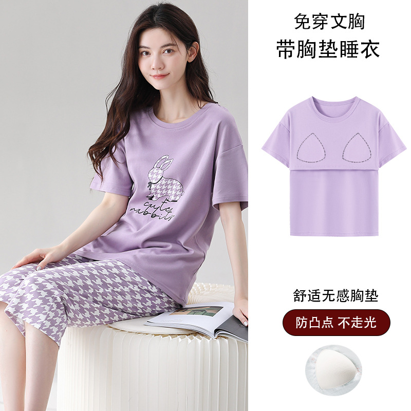 가슴 패드가 있는 여성용 100% 면 잠옷, 순면 여름용 얇은 라운드넥 반팔 7부 바지, 여름철 외출복으로도 착용 가능한 홈웨어스토어 가기
