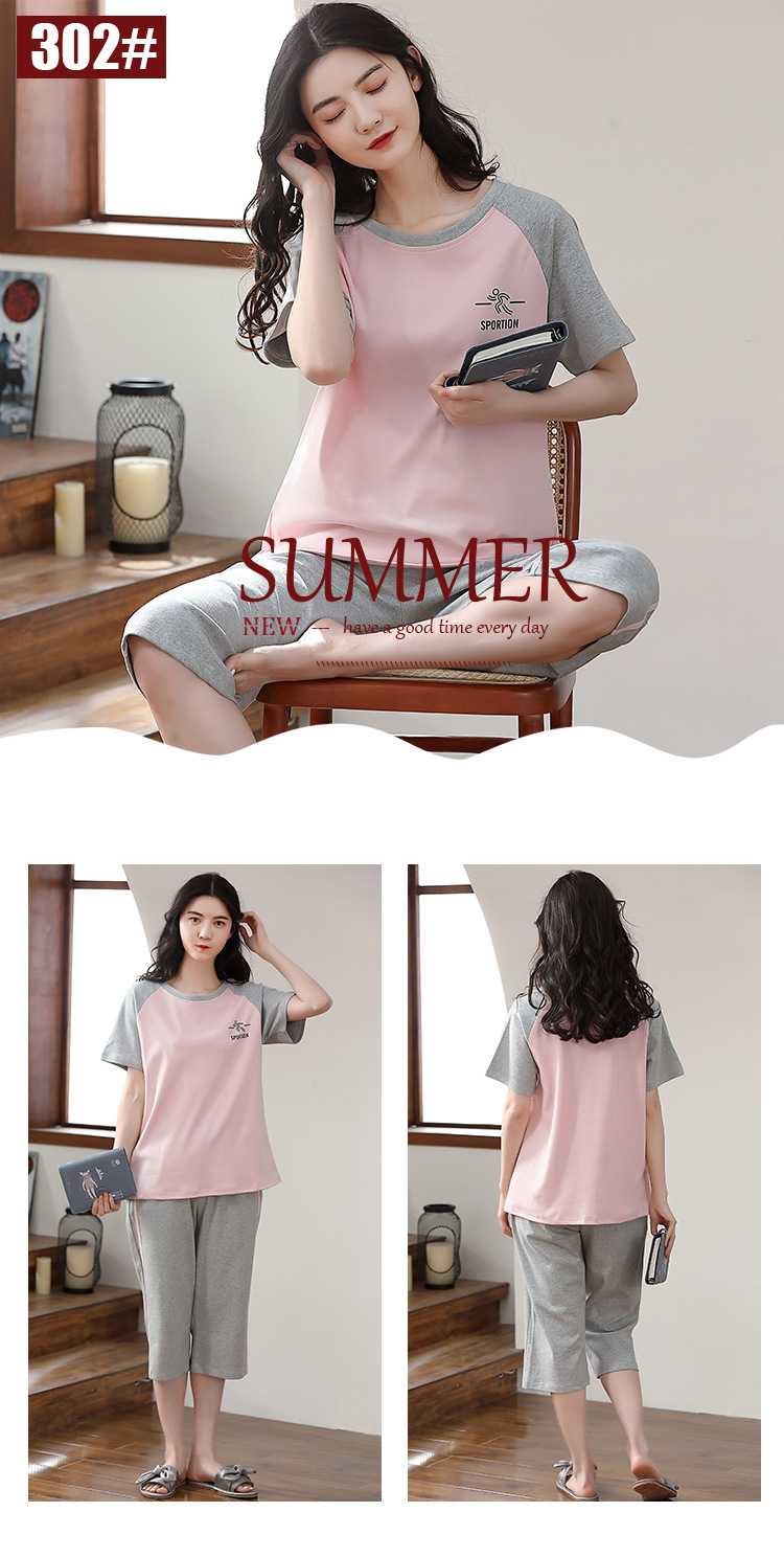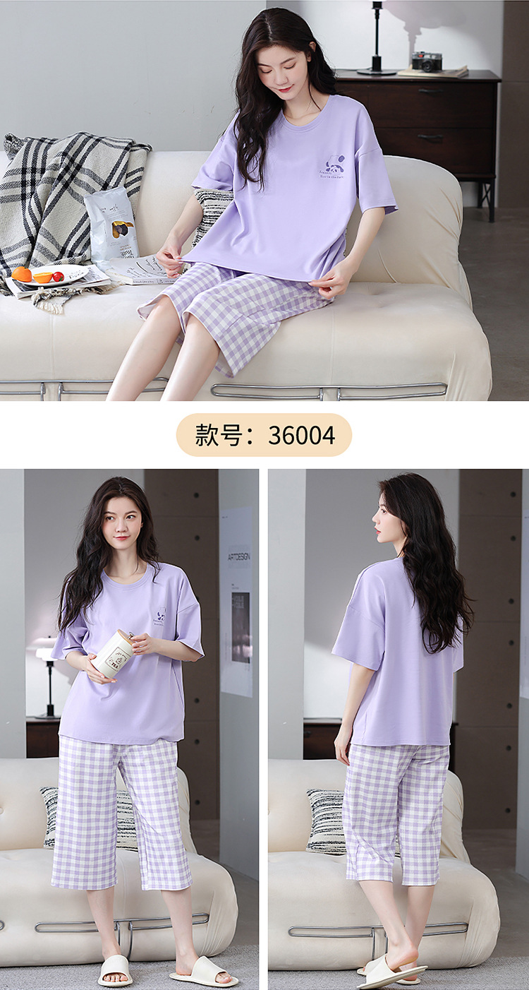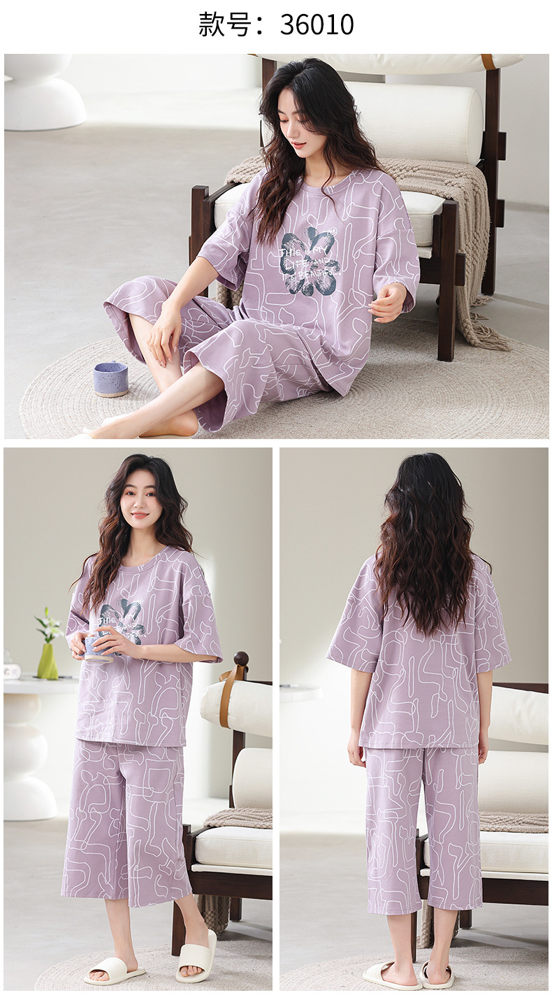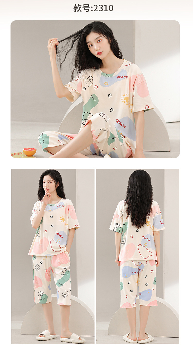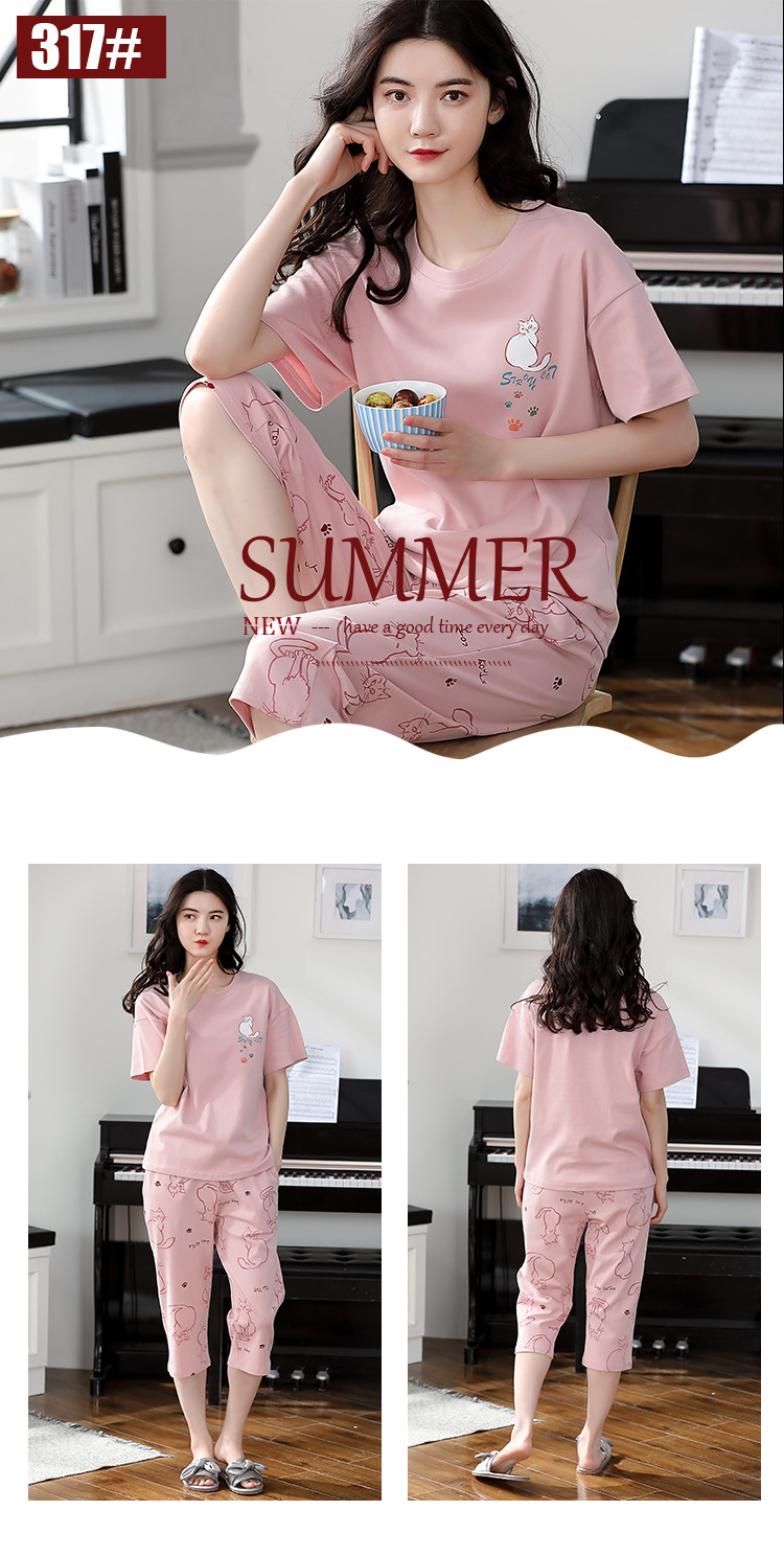 가슴 패드가 있는 여성용 100% 면 잠옷, 순면 여름용 얇은 라운드넥 반팔 7부 바지, 여름철 외출복으로도 착용 가능한 홈웨어스토어 가기