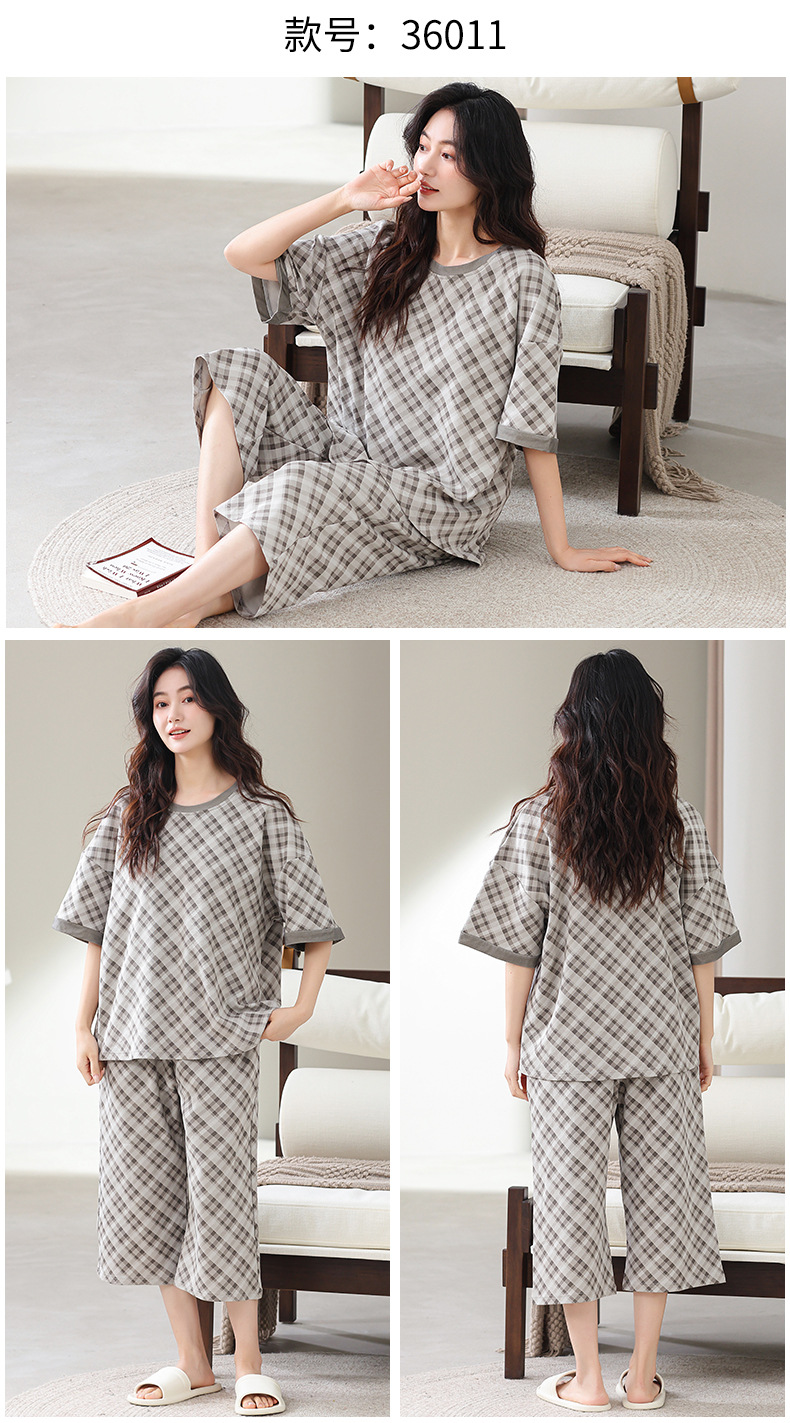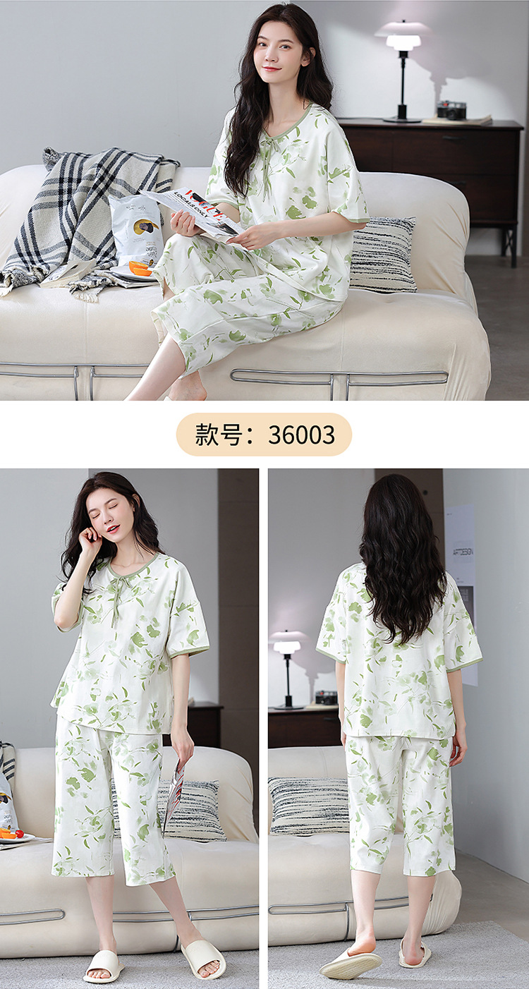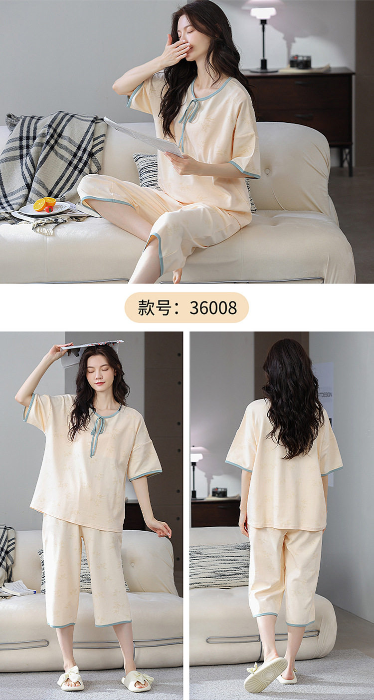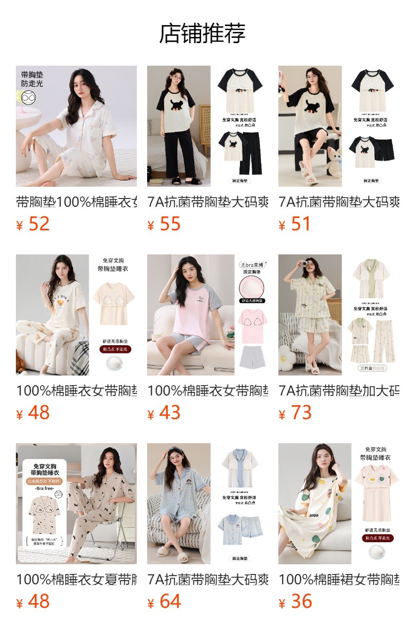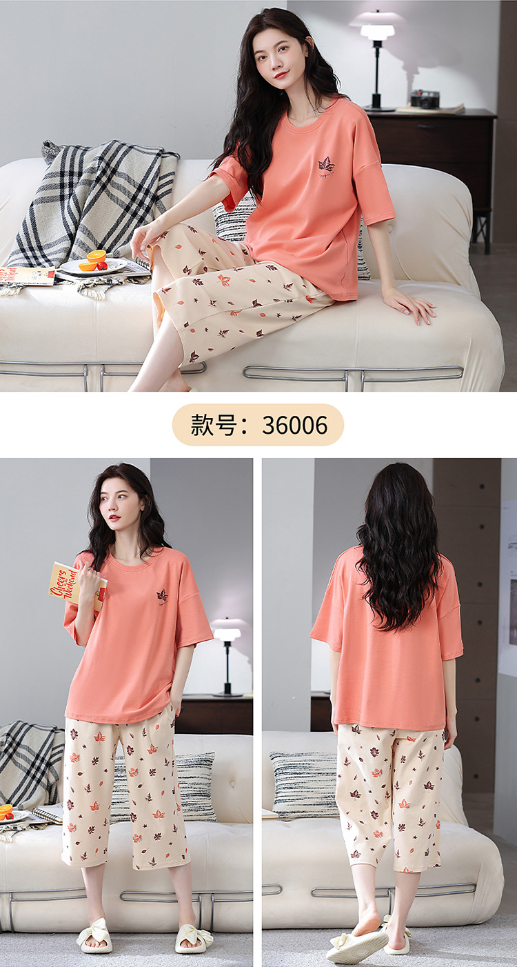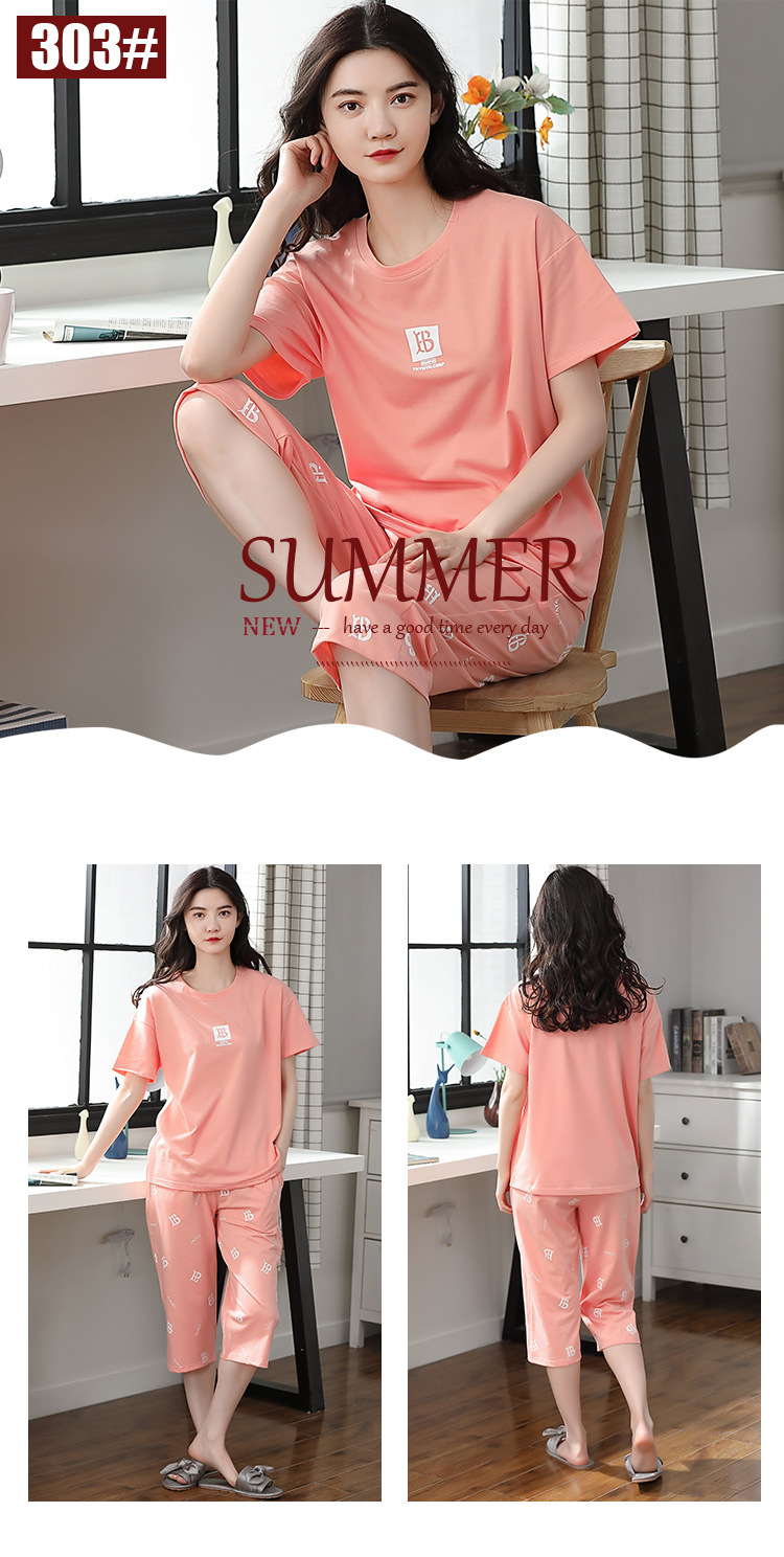 가슴 패드가 있는 여성용 100% 면 잠옷, 순면 여름용 얇은 라운드넥 반팔 7부 바지, 여름철 외출복으로도 착용 가능한 홈웨어스토어 가기