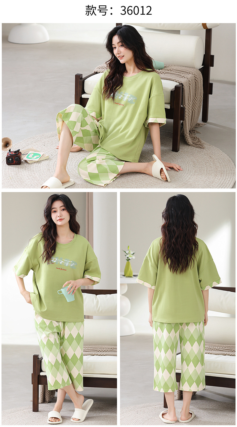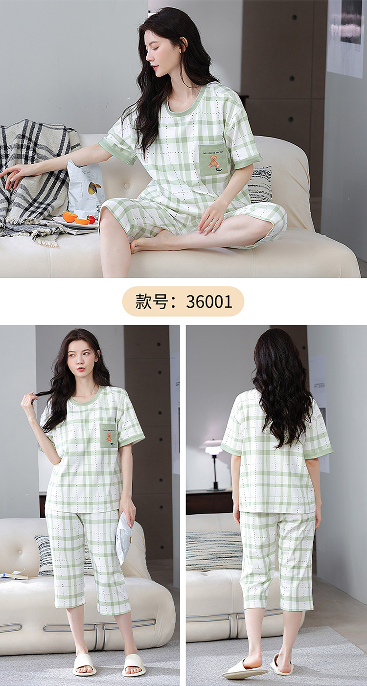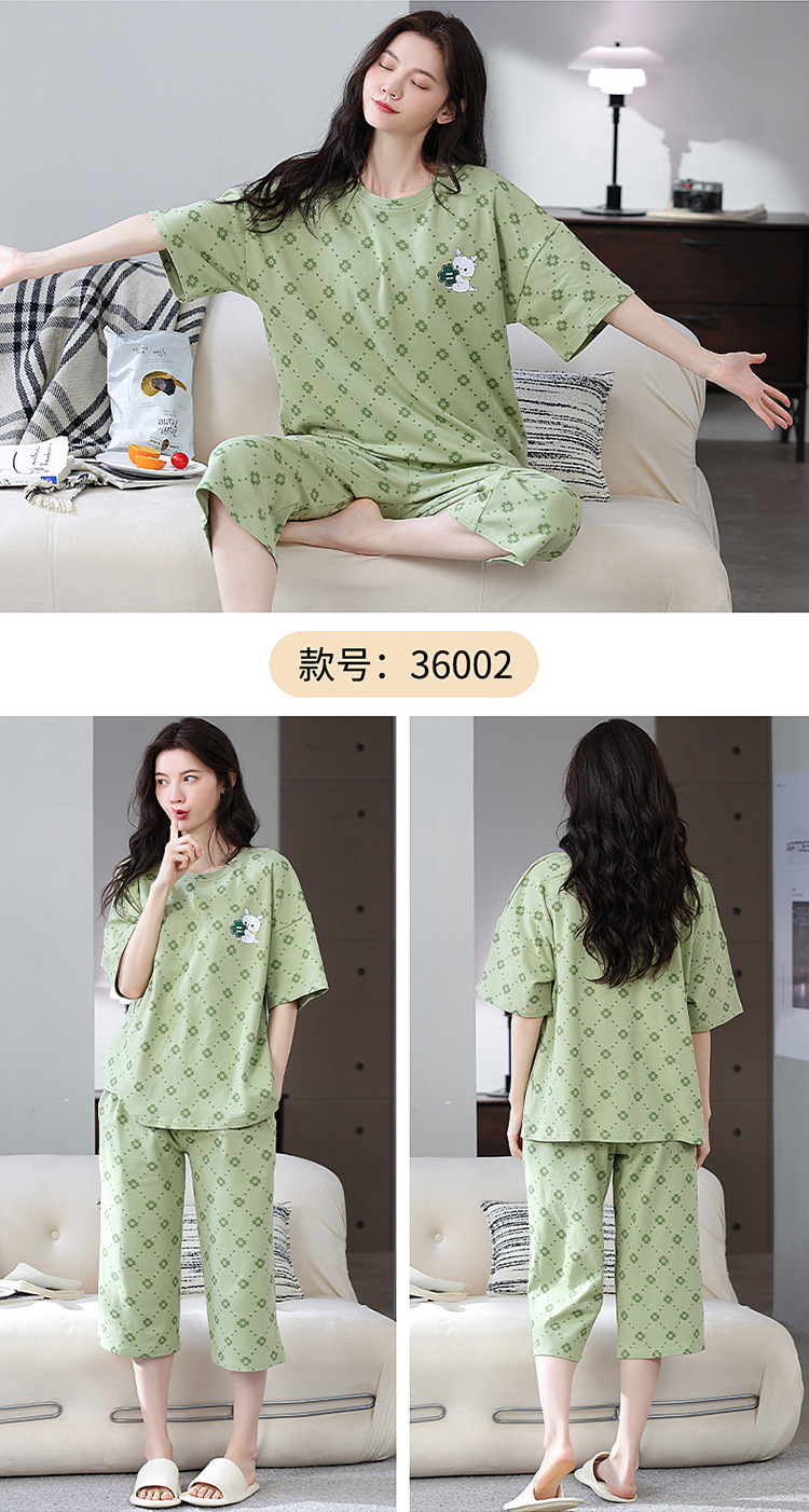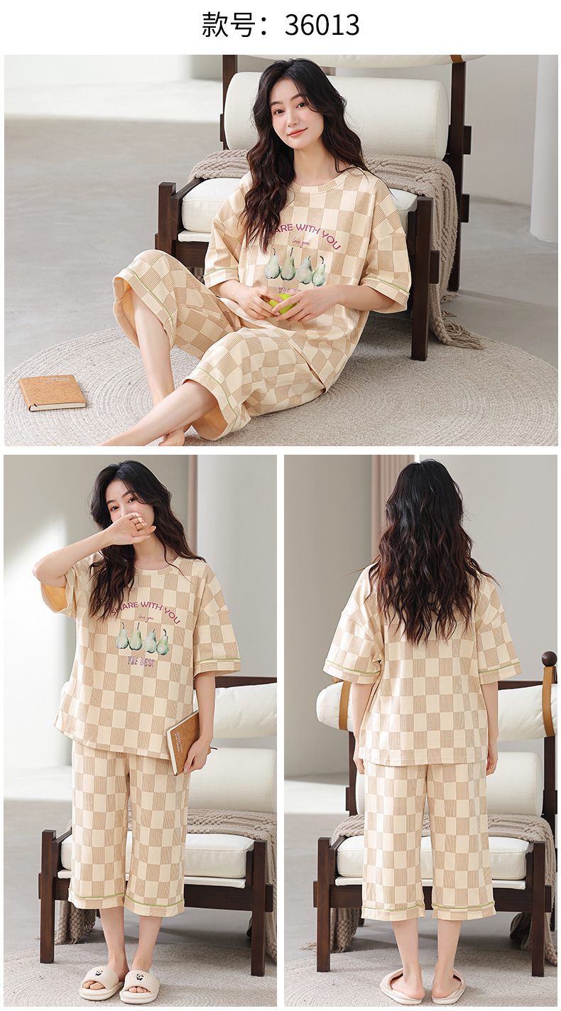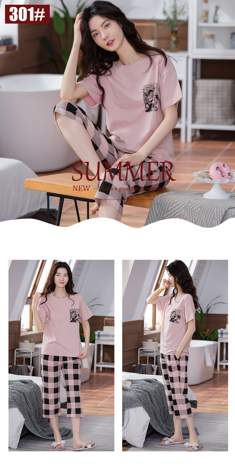 가슴 패드가 있는 여성용 100% 면 잠옷, 순면 여름용 얇은 라운드넥 반팔 7부 바지, 여름철 외출복으로도 착용 가능한 홈웨어스토어 가기